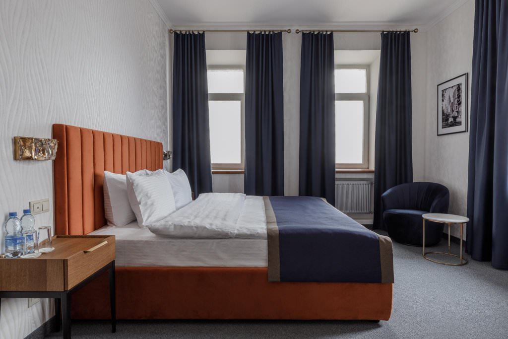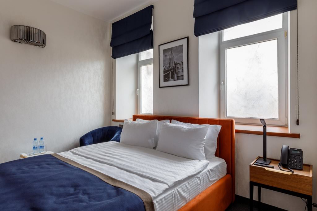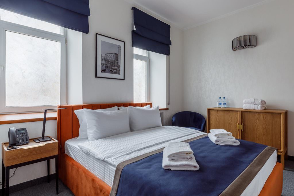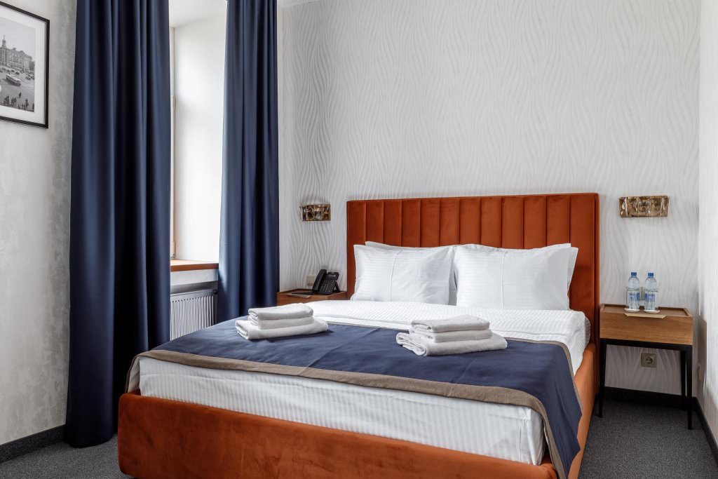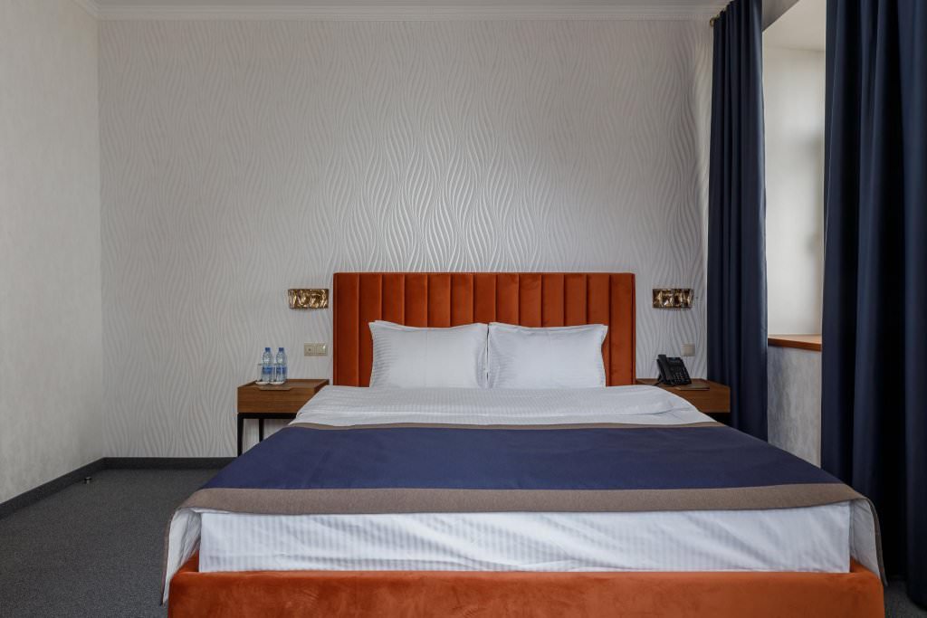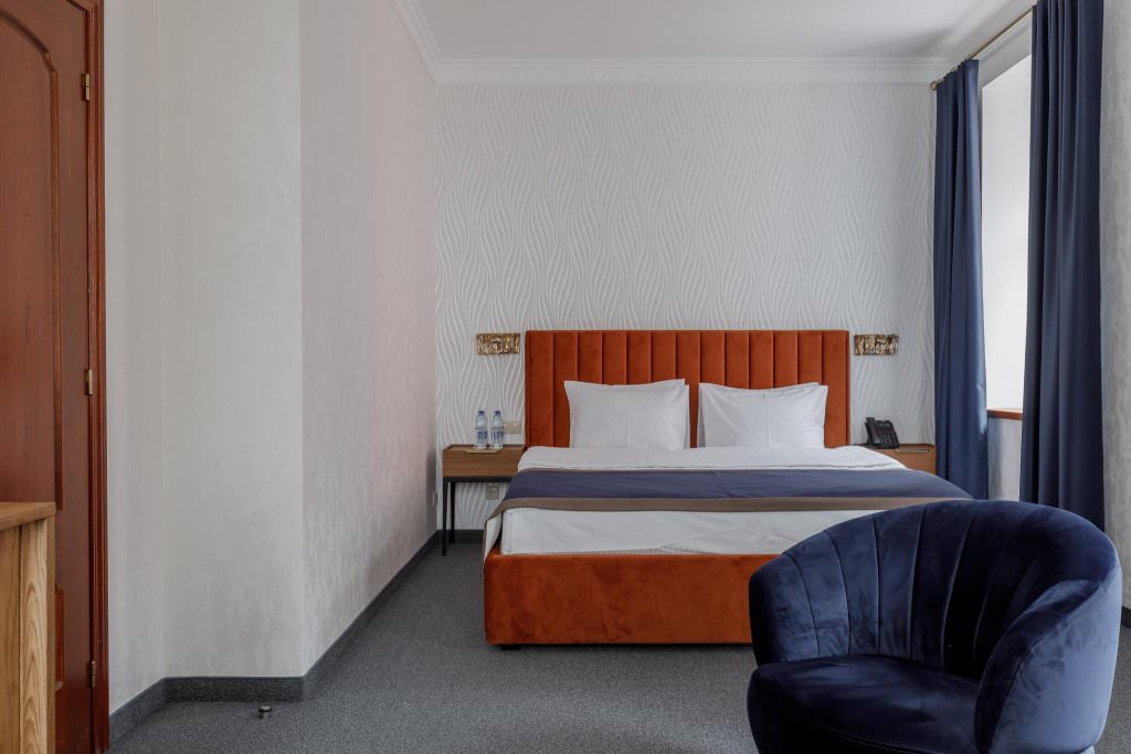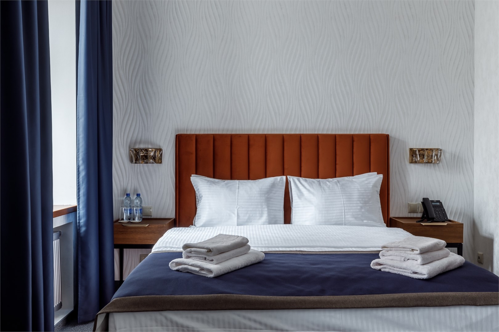 Площадь номера - 15 кв.м. 2 осн. места. Мебель: вешалка, зеркало, кровать двуспальная, прикроватные тумбочки, стол, стулья, шкаф. Оборудование: сейф, телевизор, телефон. Санузел: с душем, тапочки, туалетные принадлежности, фен, халат. Сервис: Wi-Fi бесплатно, смена полотенец, смена постельного белья, уборка номера.