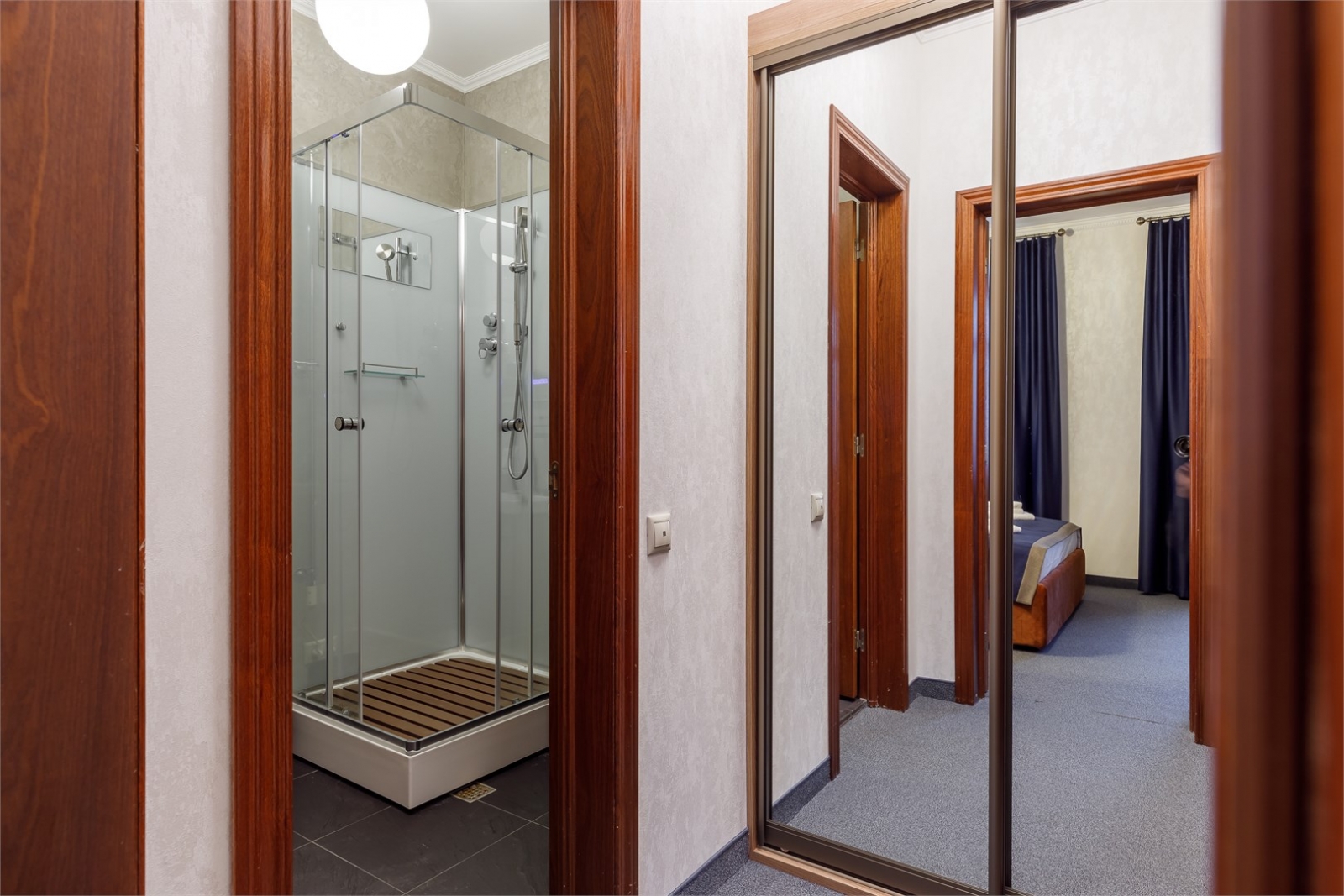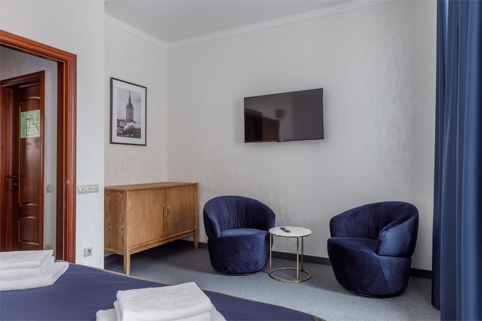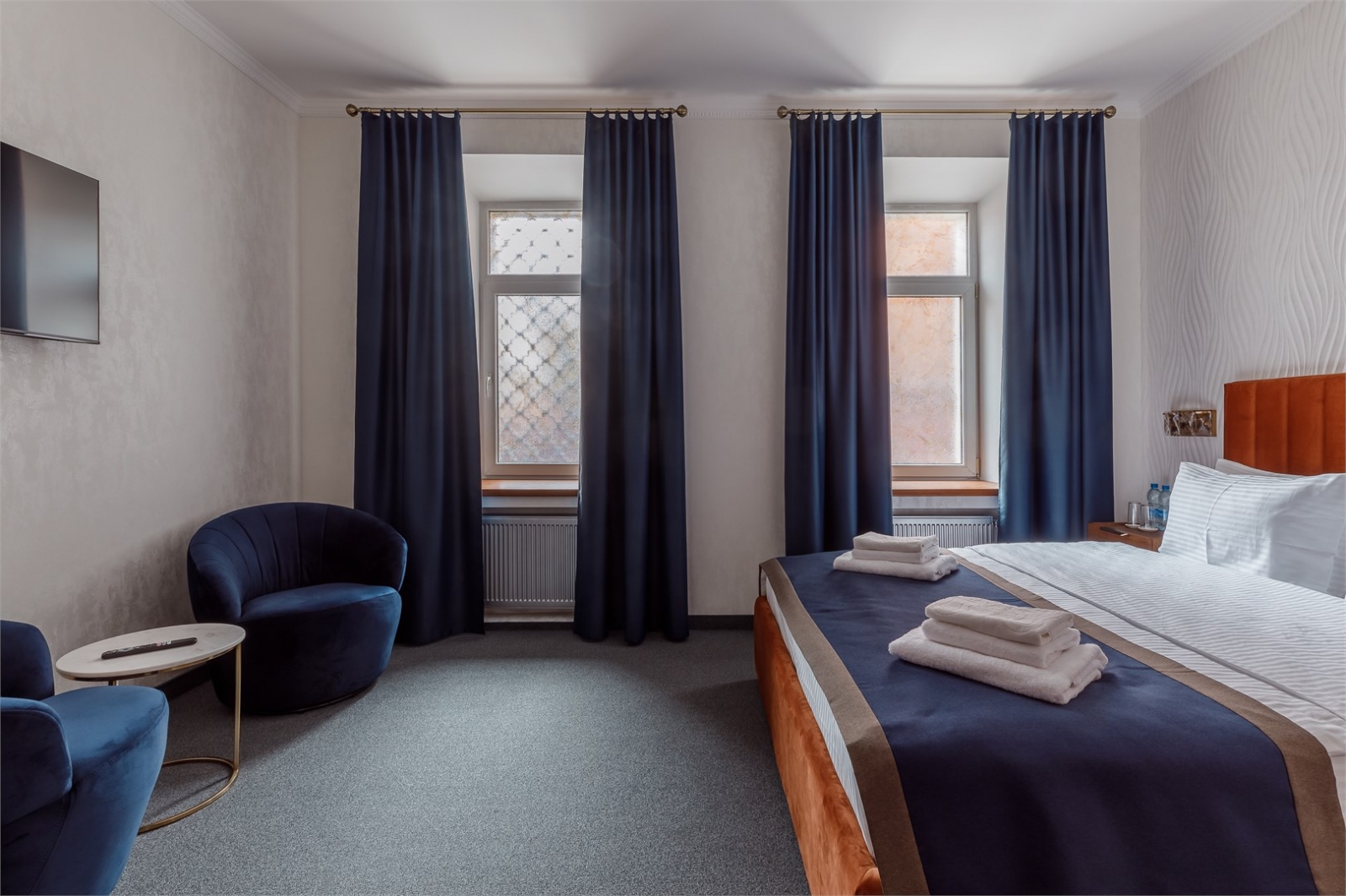 Площадь номера - 21 кв.м. 2 осн. места. 1 доп. место. Мебель: вешалка, диван, зеркало, кресла, кровать двуспальная, прикроватные тумбочки, стол, стулья, шкаф. Оборудование: сейф, телевизор, телефон. Санузел: с душевой кабиной, тапочки, туалетные принадлежности, фен, халат. Сервис: Wi-Fi бесплатно, смена полотенец, смена постельного белья, уборка номера.