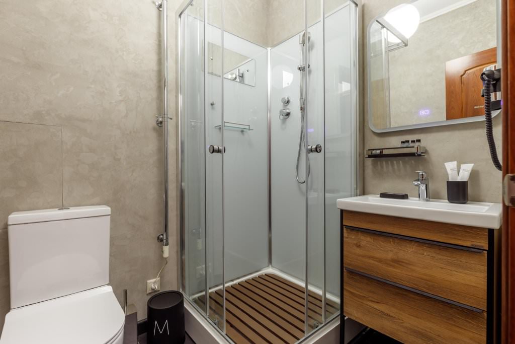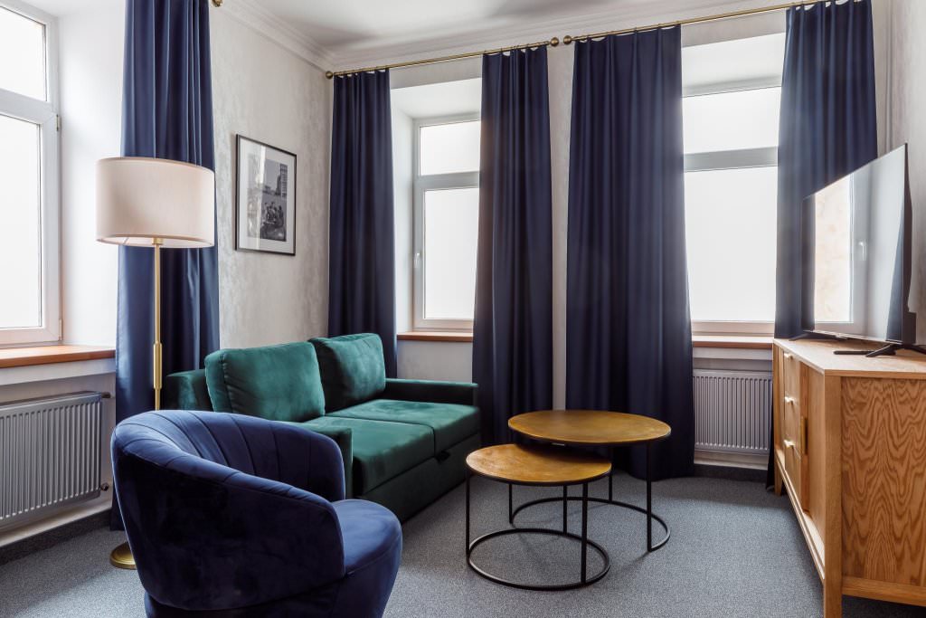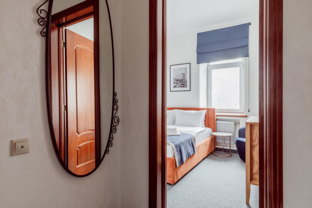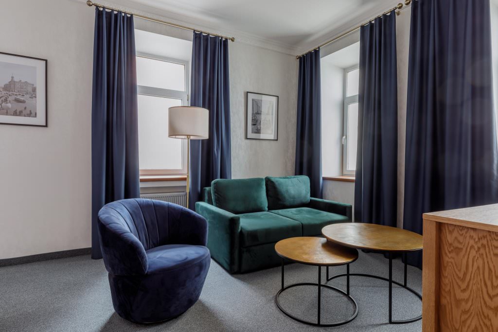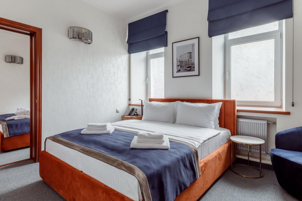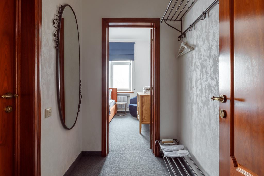 Площадь номера - 21 кв.м. 2 осн. места. 1 доп. место. Мебель: вешалка, диван, зеркало, кресла, кровать двуспальная, прикроватные тумбочки, стол, стулья, шкаф. Оборудование: сейф, телевизор, телефон. Санузел: с душевой кабиной, тапочки, туалетные принадлежности, фен, халат. Сервис: Wi-Fi бесплатно, смена полотенец, смена постельного белья, уборка номера.
