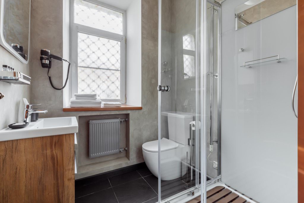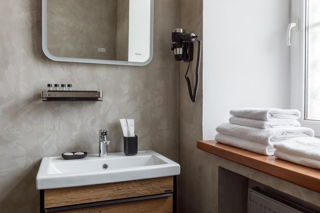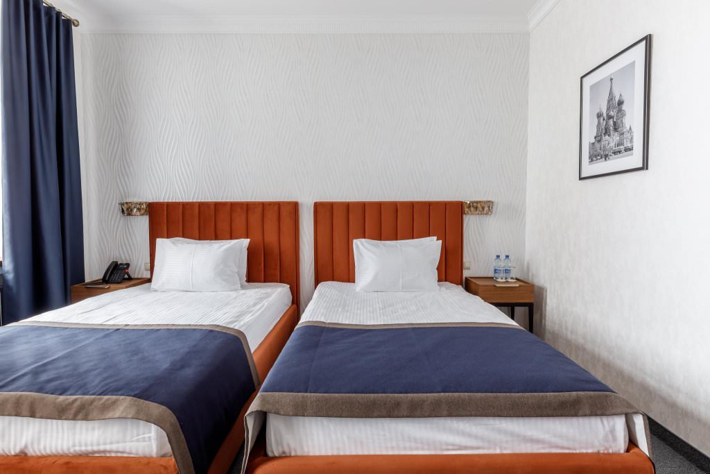 Площадь номера - 15 кв.м. 2 осн. места. Мебель: вешалка, зеркало, кровати односпальные, прикроватные тумбочки, стол, стулья, шкаф. Оборудование: сейф, телевизор, телефон. Санузел: с душем, тапочки, туалетные принадлежности, фен, халат. Сервис: Wi-Fi бесплатно, смена полотенец, смена постельного белья, уборка номера.