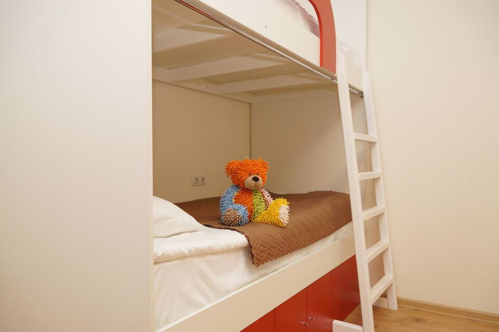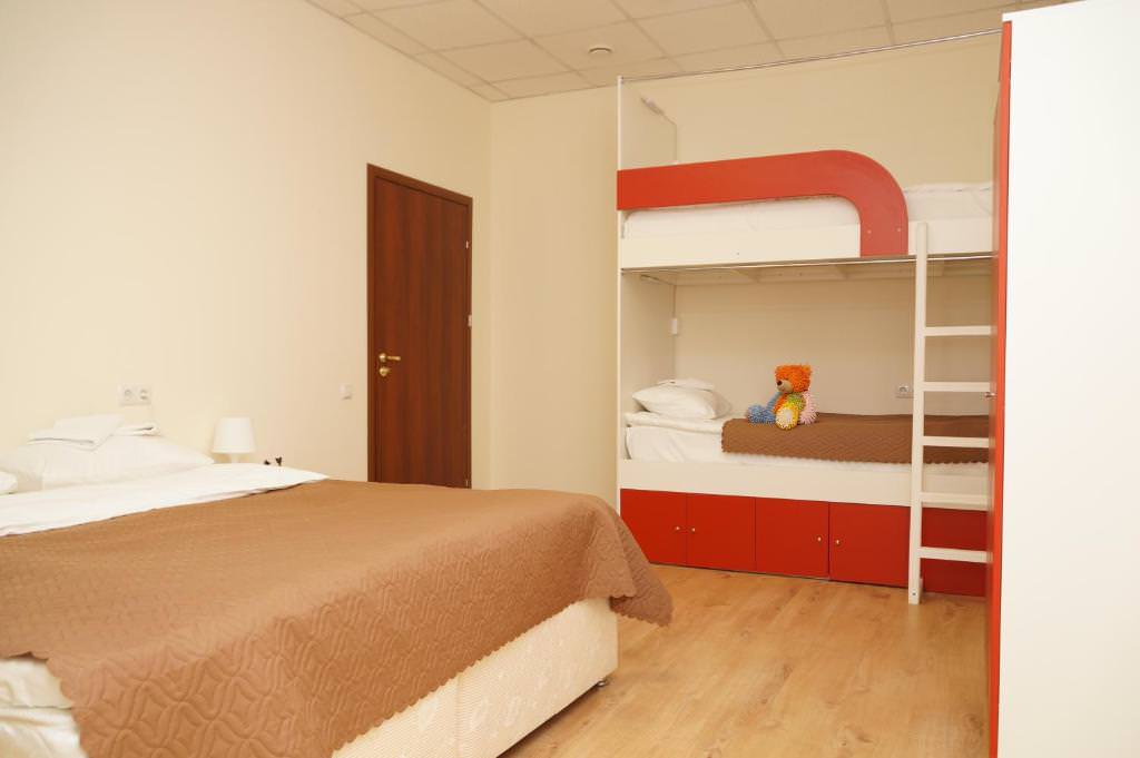 Площадь номера - 15 кв.м. 4 осн. места. Мебель: вешалка, зеркало, кровать двуспальная, кровать двухъярусная, прикроватные тумбочки, стол, стулья, шкаф. Оборудование: кондиционер, телевизор, холодильник. Санузел: с душевой кабиной, туалетные принадлежности, фен. Сервис: Wi-Fi бесплатно, смена полотенец, смена постельного белья, уборка номера.