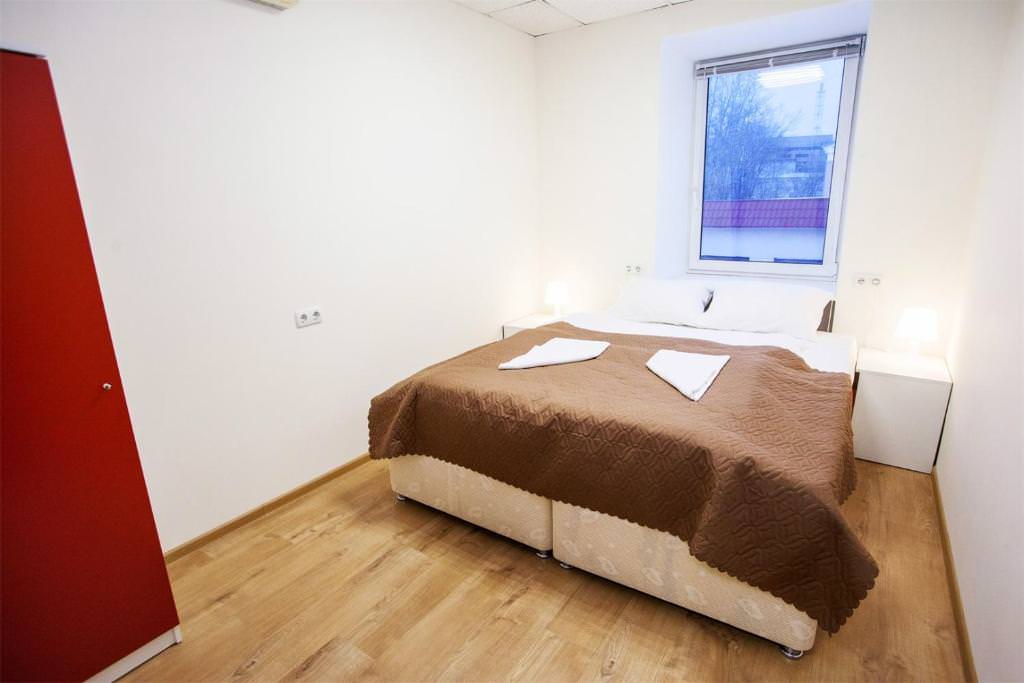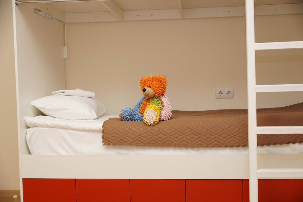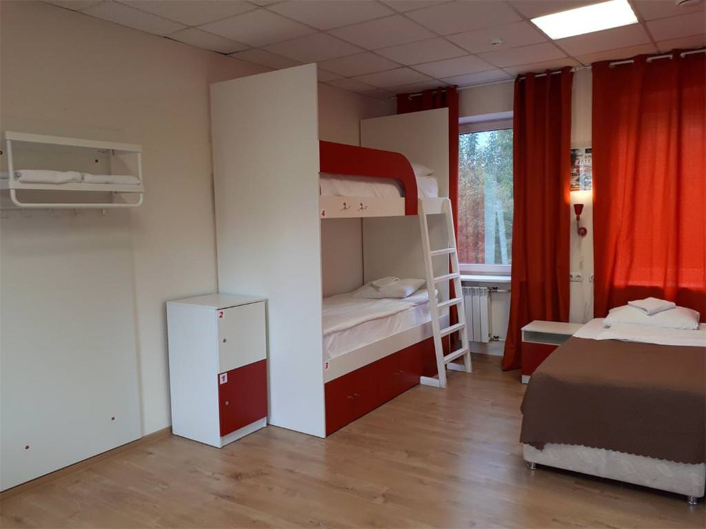 Площадь номера - 10 кв.м. 4 осн. места. Мебель: вешалка, кровать двуспальная, кровать двухъярусная, прикроватные тумбочки, стол, стулья, шкаф. Оборудование: кондиционер, телевизор. Санузел и душевые на этаже. Сервис: Wi-Fi бесплатно, смена полотенец, смена постельного белья, уборка номера.