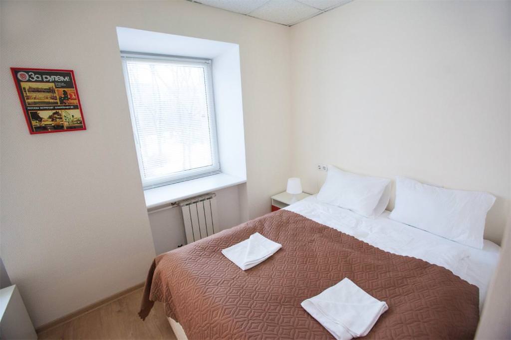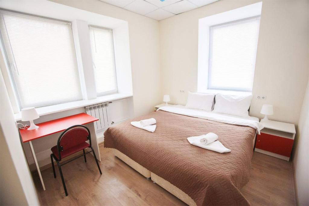 Площадь номера - 10 кв.м. 2 осн. места. Мебель: вешалка, зеркало, кровать двуспальная, прикроватные тумбочки, стол, стулья, шкаф. Оборудование: кондиционер, телевизор. Санузел и душевые на этаже. Сервис: Wi-Fi бесплатно, смена полотенец, смена постельного белья, уборка номера.