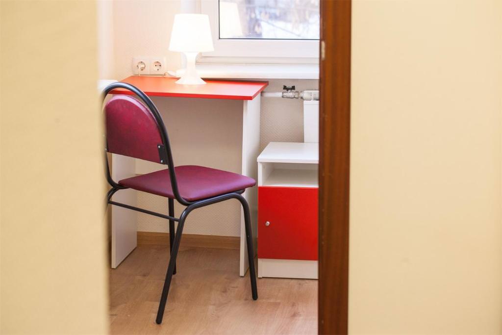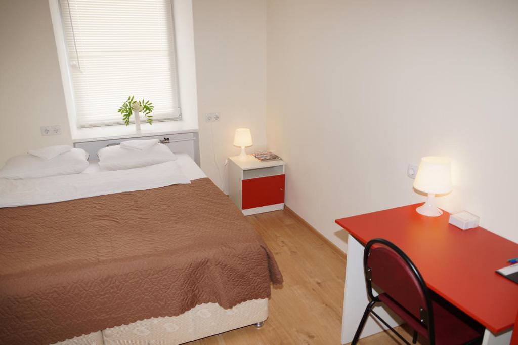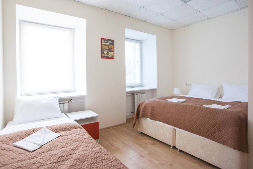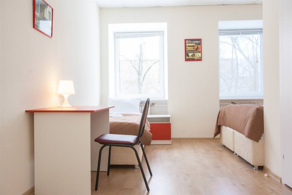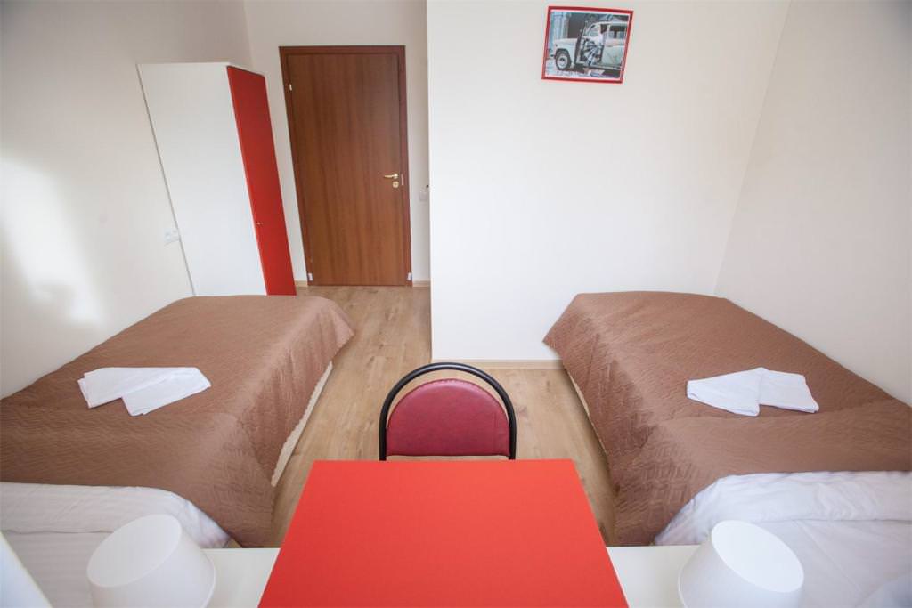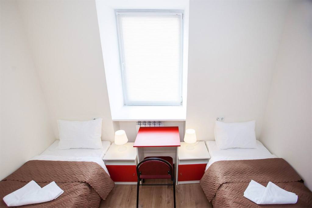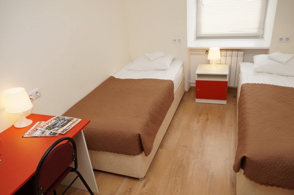 Площадь номера - 10 кв.м. 2 осн. места. Мебель: вешалка, зеркало, кровати односпальные, прикроватные тумбочки, стол, стулья, шкаф. Оборудование: кондиционер, телевизор. Санузел и душевые на этаже. Сервис: Wi-Fi бесплатно, смена полотенец, смена постельного белья, уборка номера.