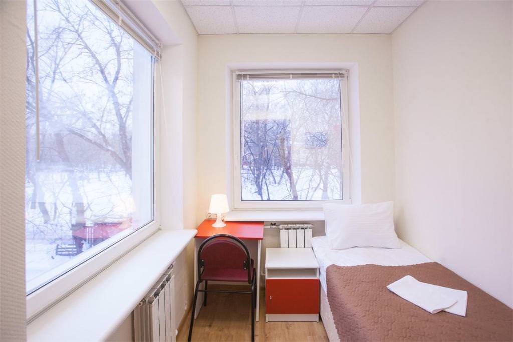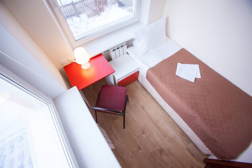 Площадь номера - 5 кв.м. 1 осн. место. Мебель: вешалка, кровать односпальная. Санузел и душевые на этаже. Сервис: Wi-Fi бесплатно, смена полотенец, смена постельного белья, уборка номера.
