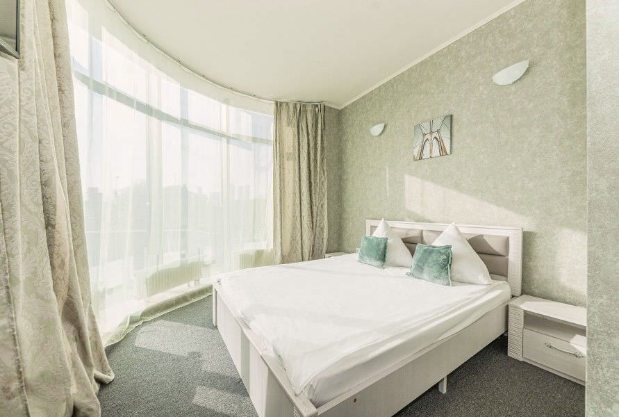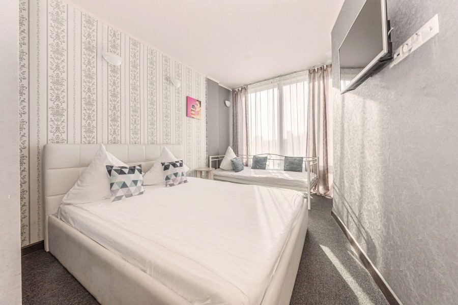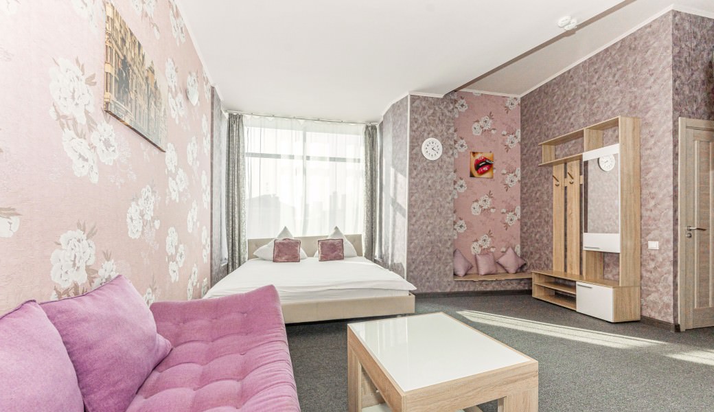 4 осн. места. Мебель: вешалка, диван раскладной, кровать двуспальная, прикроватные тумбочки, стол, стулья, шкаф. Оборудование: кондиционер, телевизор. Санузел: с душевой кабиной, туалетные принадлежности. Сервис: Wi-Fi бесплатно, смена полотенец, смена постельного белья, уборка номера.