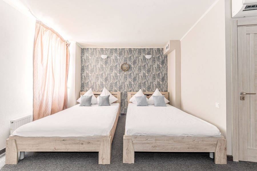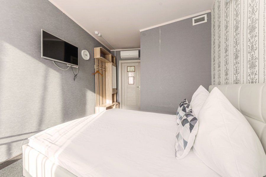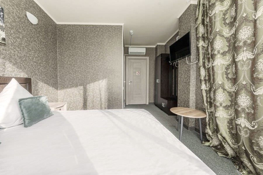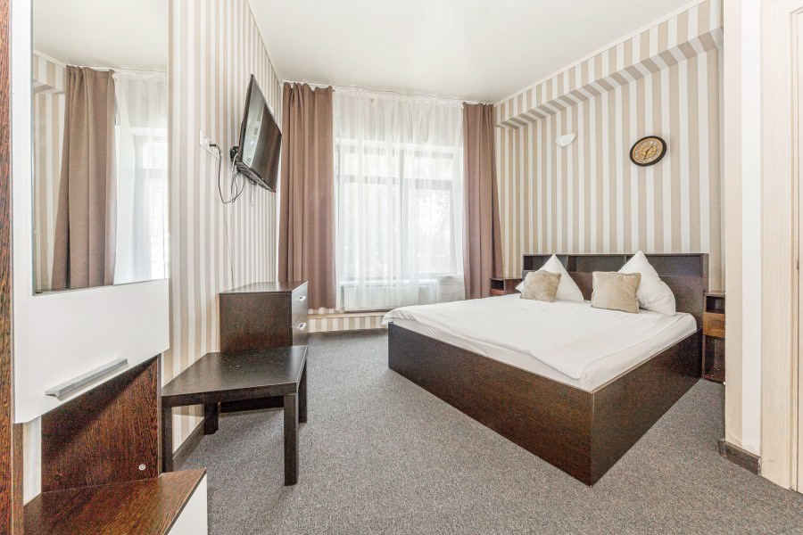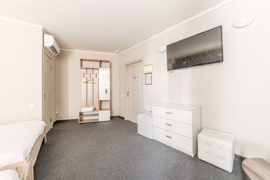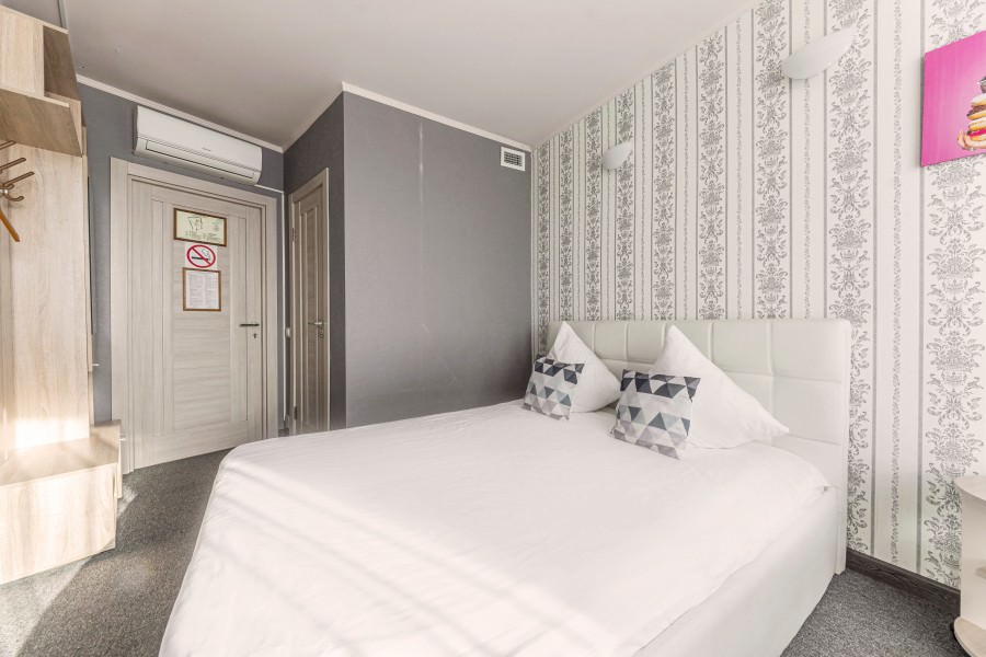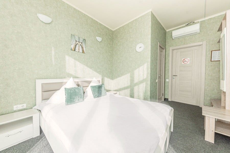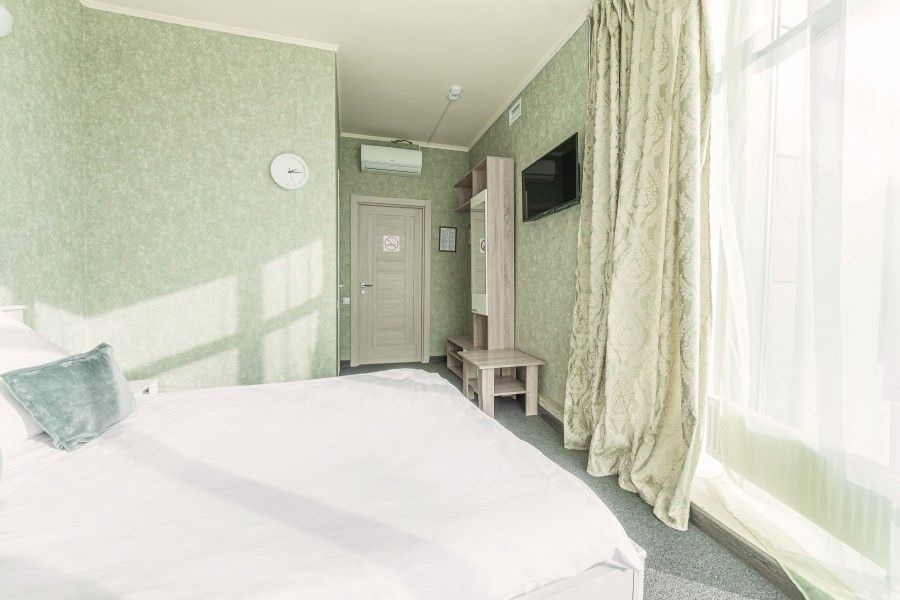 Площадь номера - 17 кв.м. 2 осн. места. Мебель: вешалка, зеркало, кровать двуспальная, прикроватные тумбочки, стол, стулья. Оборудование: кондиционер, телевизор. Санузел: с душевой кабиной, туалетные принадлежности. Сервис: Wi-Fi бесплатно, смена полотенец, смена постельного белья, уборка номера.