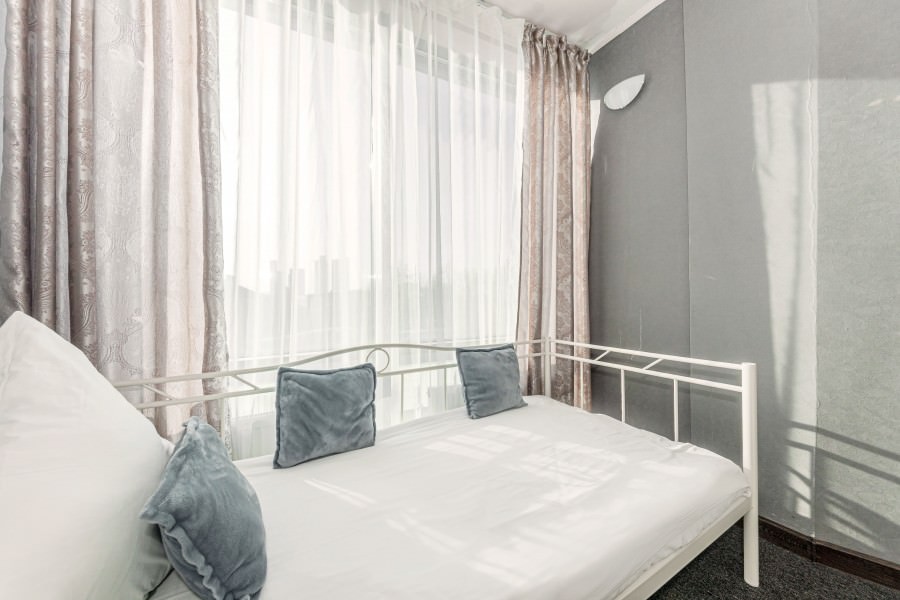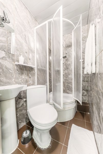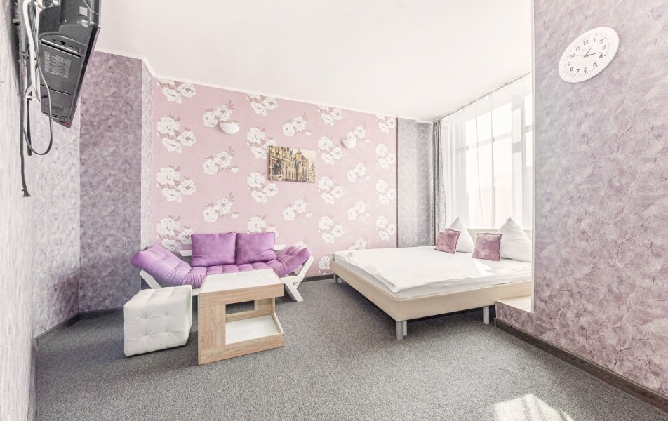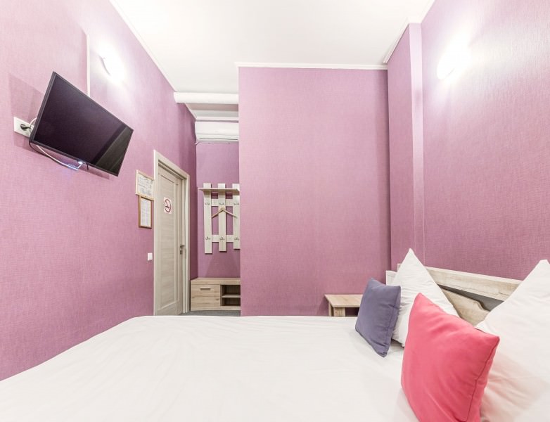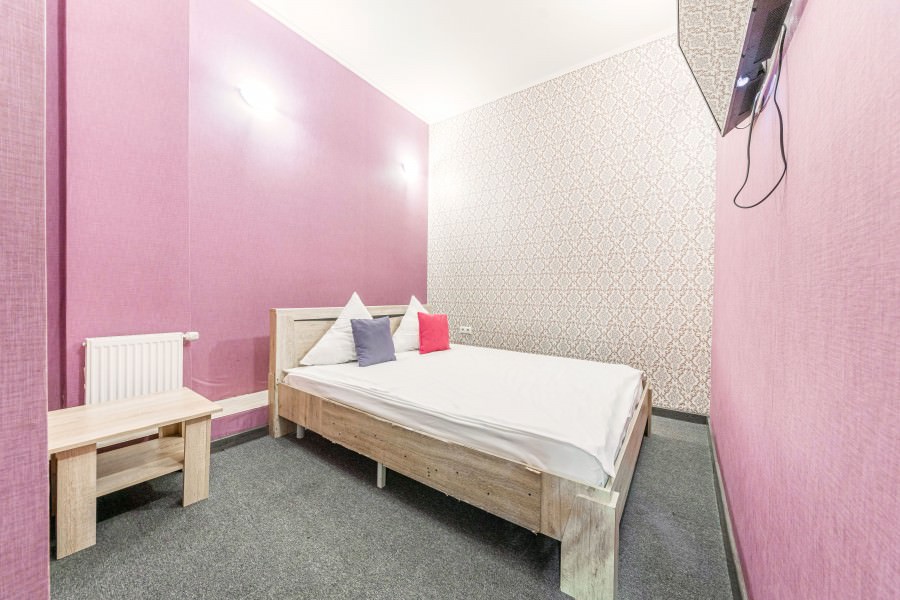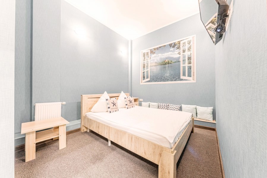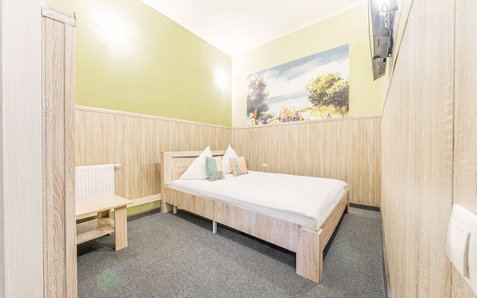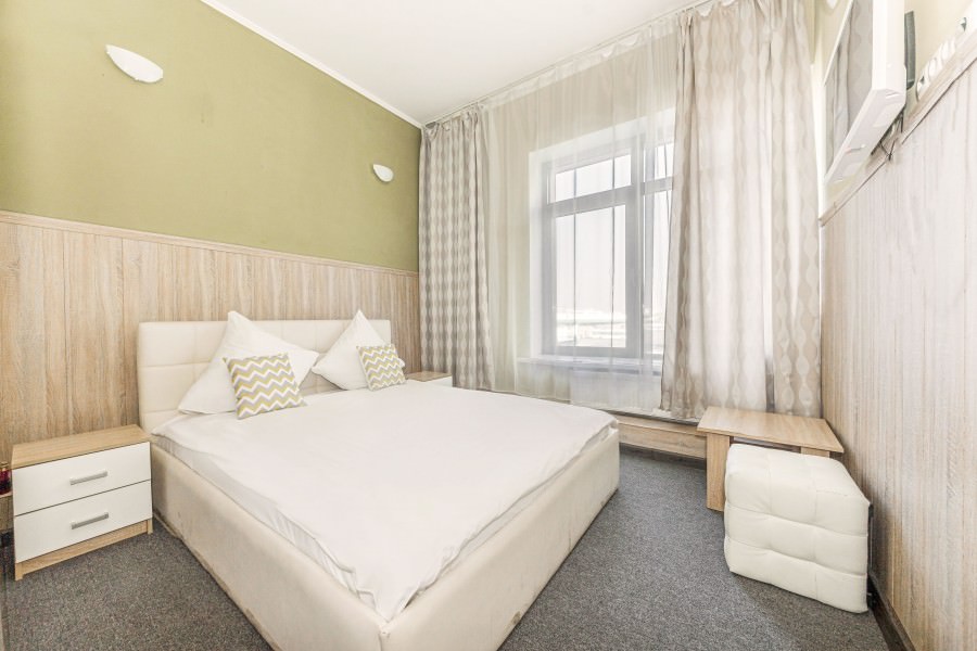 Площадь номера - 17 кв.м. 2 осн. места. Мебель: вешалка, зеркало, кровать двуспальная, прикроватные тумбочки, стол, стулья. Оборудование: кондиционер, телевизор. Санузел: с душевой кабиной, туалетные принадлежности. Сервис: Wi-Fi бесплатно, смена полотенец, смена постельного белья, уборка номера.