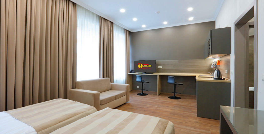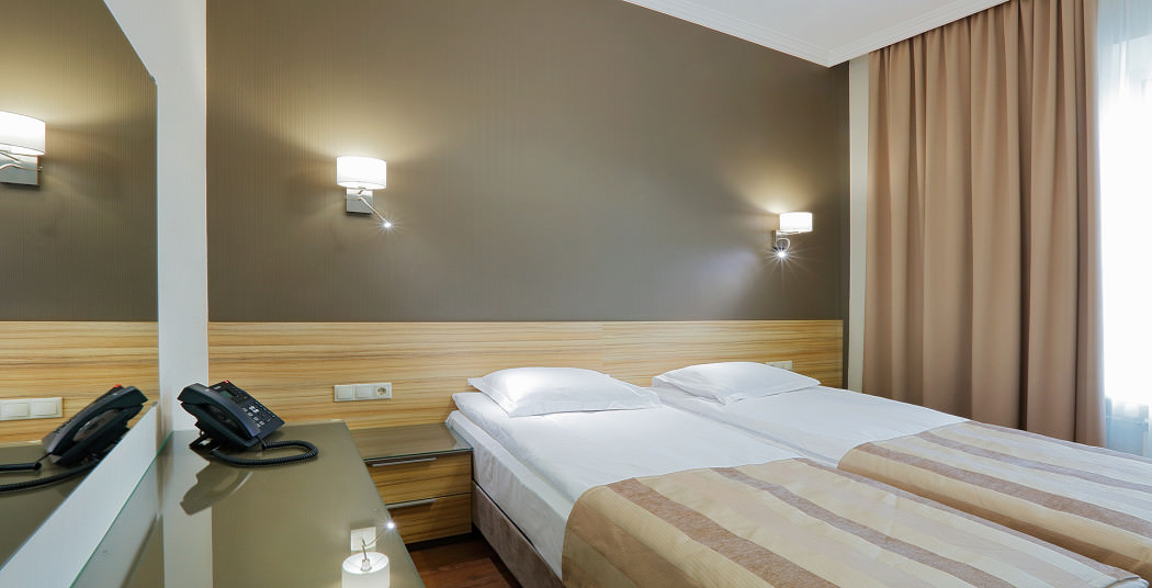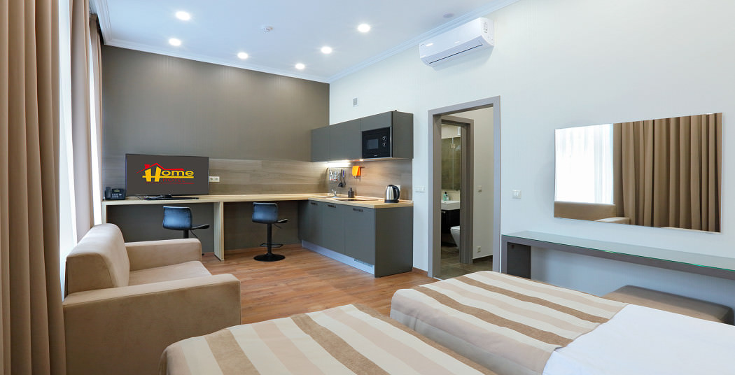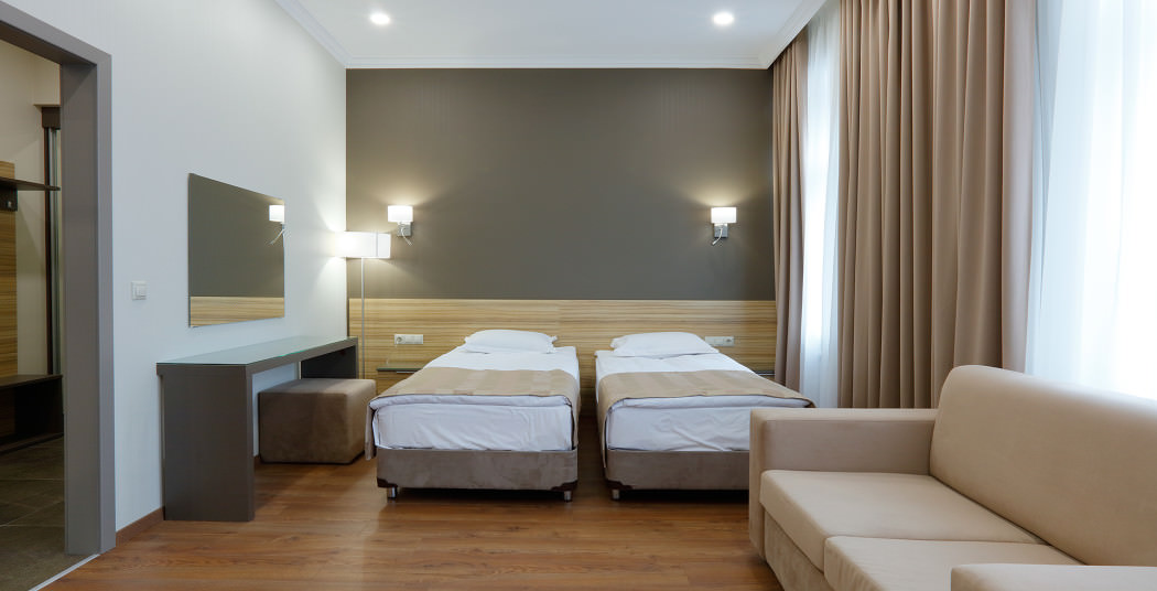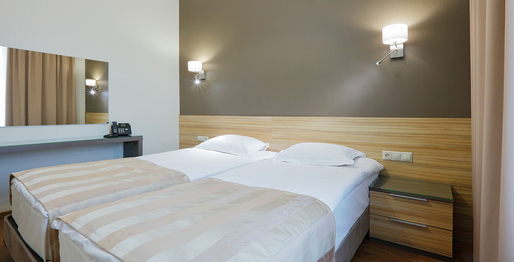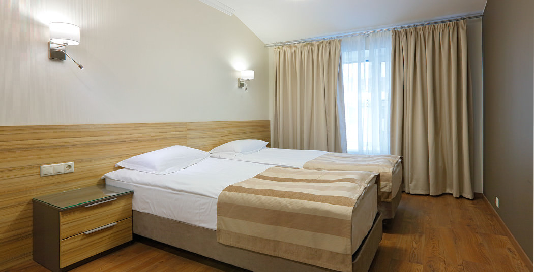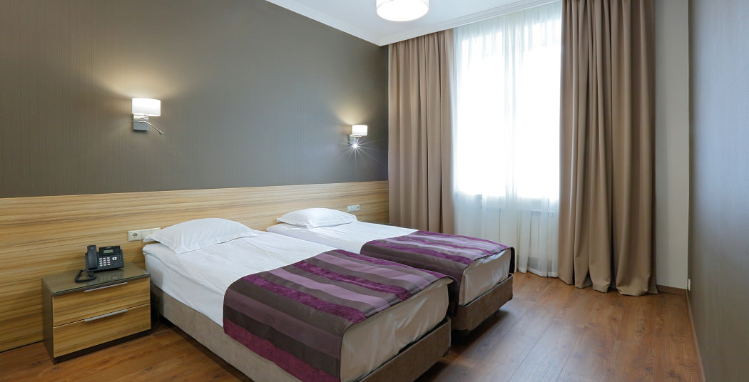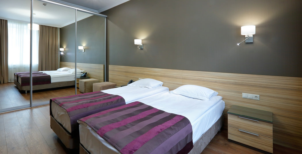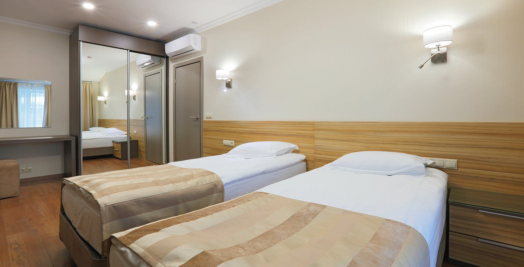 Площадь номера - 30 кв.м. 2 осн. места. Мебель: вешалка, диван, зеркало, кровати односпальные, прикроватные тумбочки, стол, стулья, шкаф. Мини-кухня. Оборудование: микроволновая печь, мини-холодильник, набор посуды, плита электрическая, сейф, телевизор, телефон, чайный набор посуды, электрочайник. Санузел: с ванной, тапочки (по запросу), туалетные принадлежности, фен. Сервис: Wi-Fi бесплатно, смена полотенец, смена постельного белья, уборка номера.
