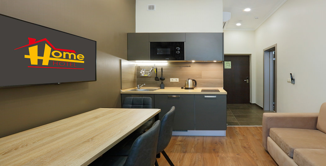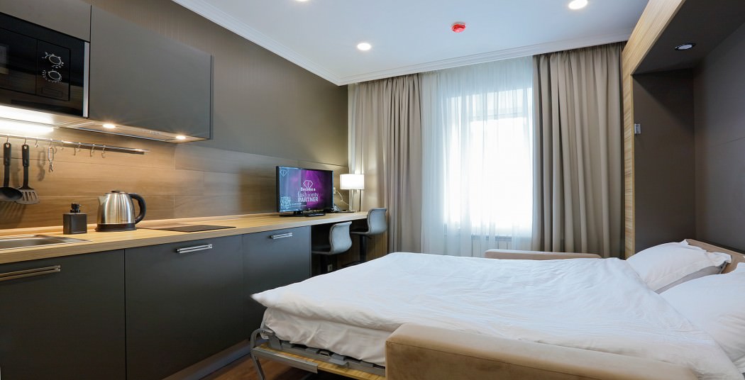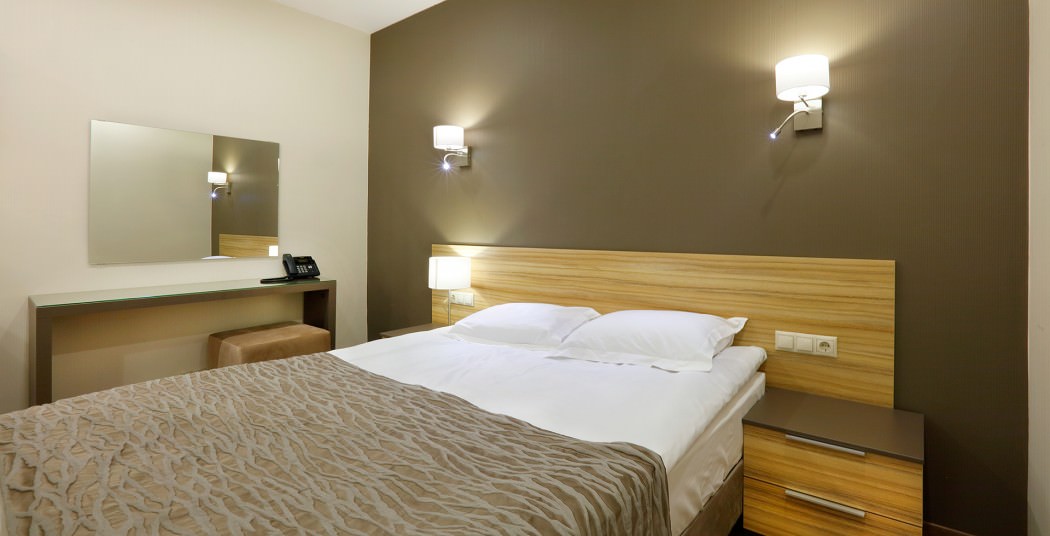 Площадь номера - 19 кв.м. 2 осн. места. Мебель: вешалка, зеркало, кровать двуспальная, стол, стулья, шкаф. Мини-кухня. Оборудование: кондиционер, микроволновая печь, мини-холодильник, набор посуды, плита электрическая, сейф, телевизор, телефон, чайный набор посуды, электрочайник. Санузел: с душевой кабиной, тапочки (по запросу), туалетные принадлежности, фен. Сервис: Wi-Fi бесплатно, смена полотенец, смена постельного белья, уборка номера.