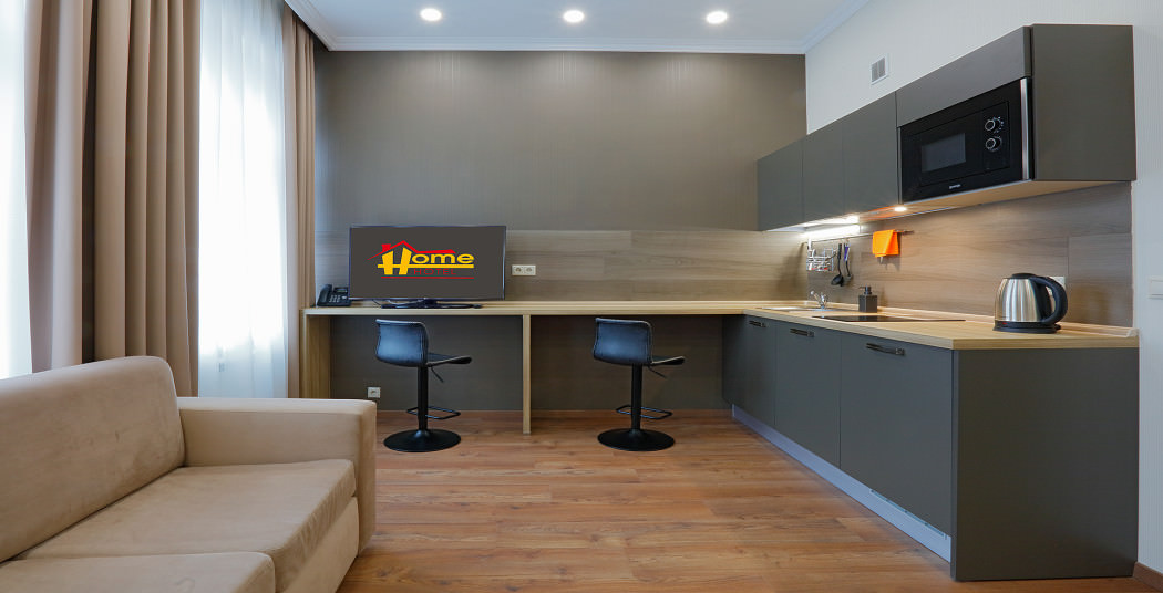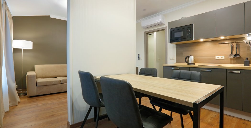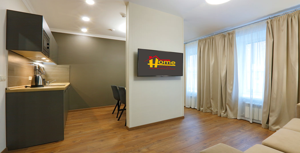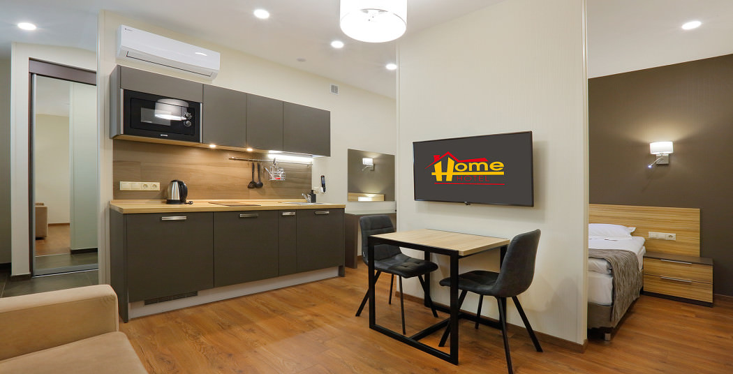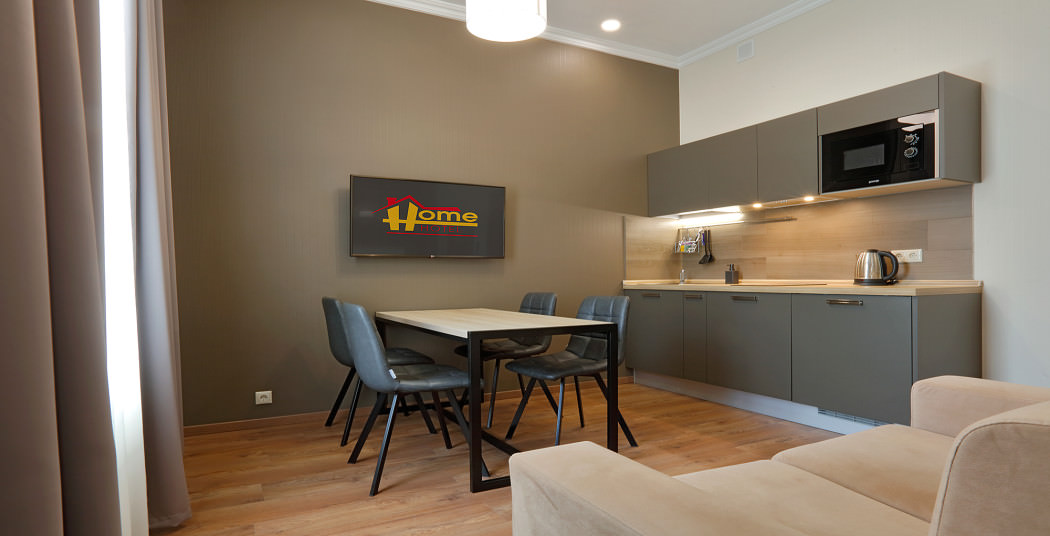 Площадь номера - 35 кв.м. 2 осн. места. 1 доп. место. Мебель: вешалка, диван, зеркало, кровати односпальные /одна двуспальная кровать, прикроватные тумбочки, стол, стулья, шкаф. Мини-кухня. Оборудование: микроволновая печь, мини-холодильник, набор посуды, плита электрическая, телевизор, телефон, холодильник, чайный набор посуды, электрочайник. Санузел: с душем или ванной, тапочки (по запросу), туалетные принадлежности, фен. Сервис: Wi-Fi бесплатно, смена полотенец, смена постельного белья, уборка номера.