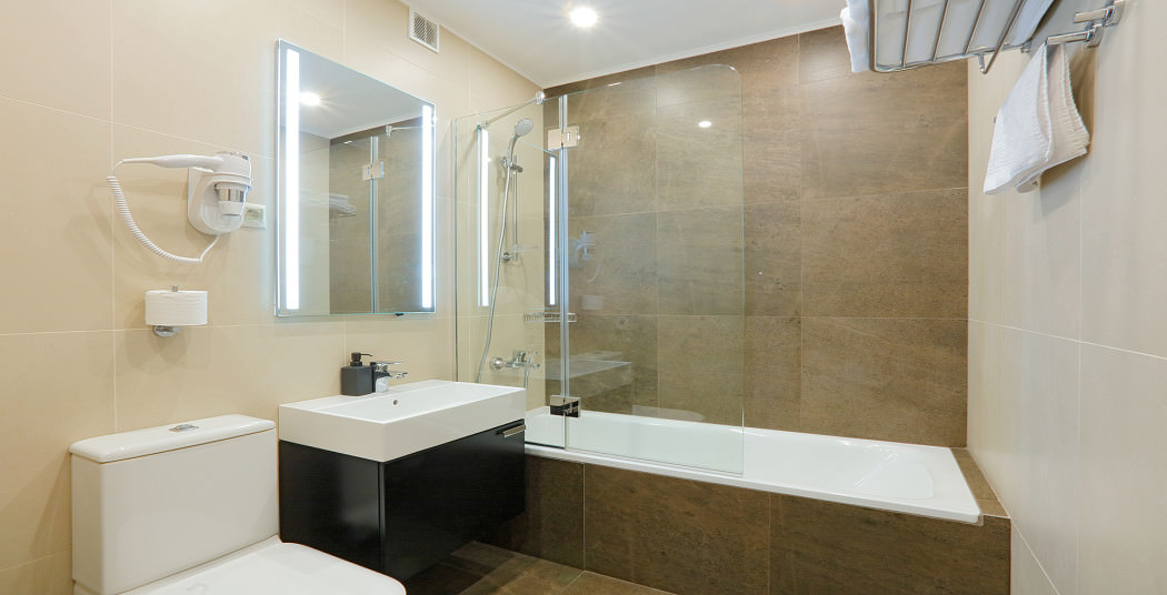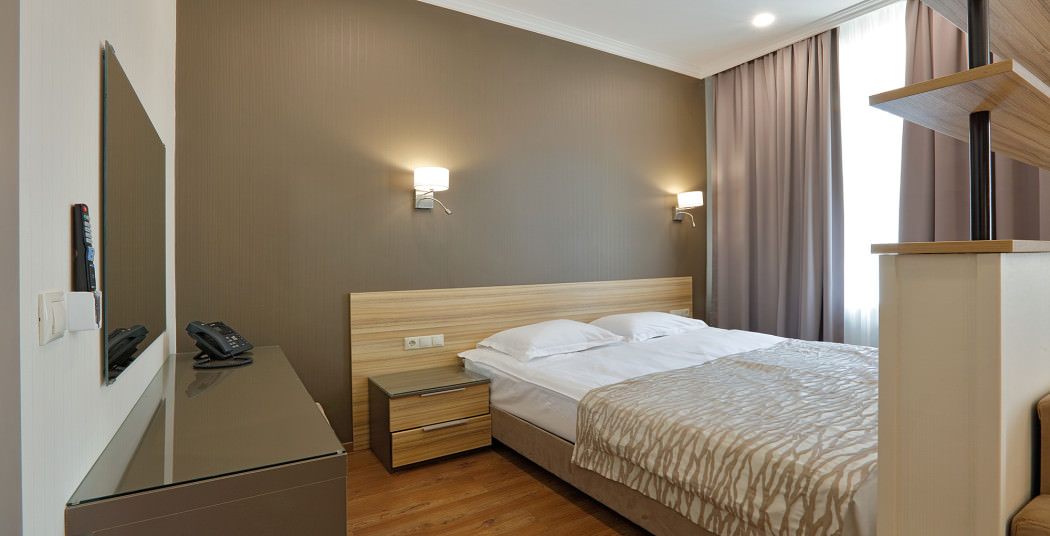 Площадь номера - 32 кв.м. 2 осн. места. Мебель: вешалка, диван, зеркало, кровать двуспальная, прикроватные тумбочки, стол, стулья, шкаф. Мини-кухня. Оборудование: кондиционер, микроволновая печь, мини-холодильник, набор посуды, плита электрическая, сейф, телевизор, телефон, чайный набор посуды, электрочайник. Санузел: с ванной/душем, тапочки (по запросу), туалетные принадлежности, фен. Сервис: Wi-Fi бесплатно, смена полотенец, смена постельного белья, уборка номера.