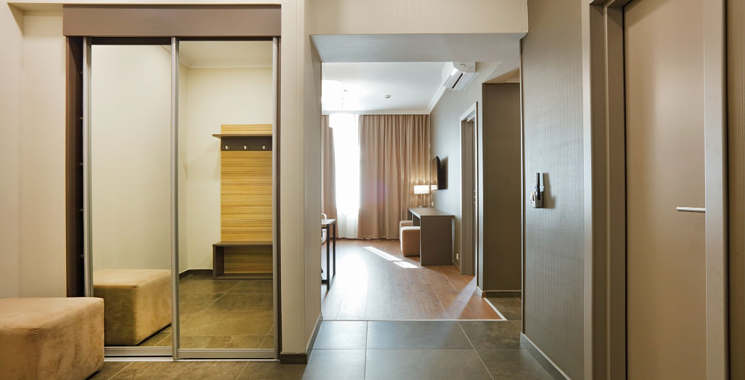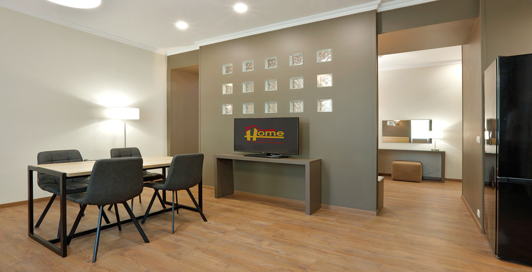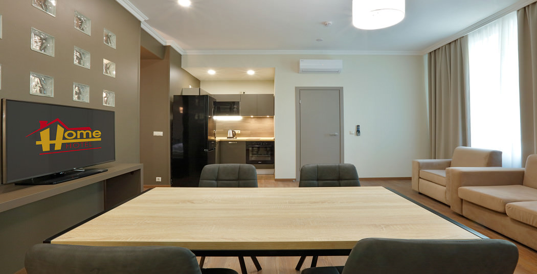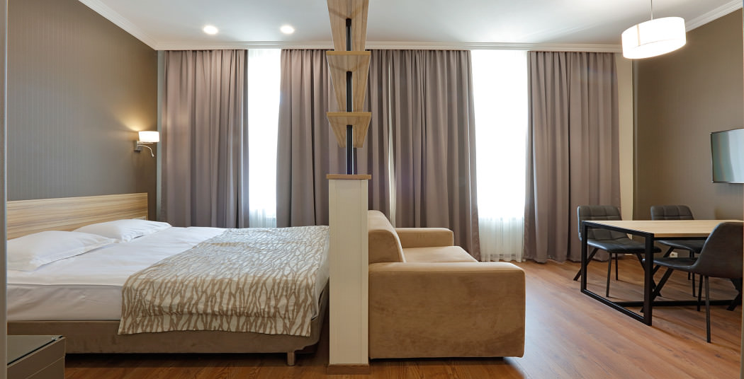 Площадь номера - 47 кв.м. 2 осн. места. 2 доп. места. Мебель: вешалка, диван, зеркало, кровать двуспальная, прикроватные тумбочки, стол, стулья, шкаф. Мини-кухня. Оборудование: кондиционер, микроволновая печь, мини-холодильник, набор посуды, плита электрическая, сейф, телевизор, телефон, чайный набор посуды, электрочайник. Санузел: с ванной/душем, тапочки (по запросу), туалетные принадлежности, фен. Сервис: Wi-Fi бесплатно, смена полотенец, смена постельного белья, уборка номера.