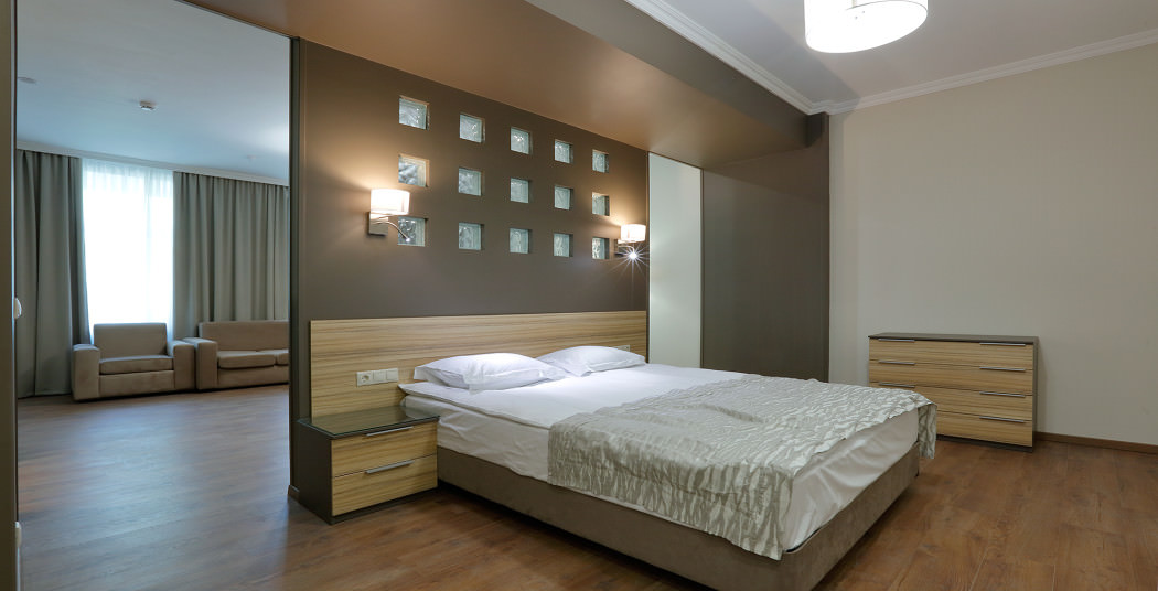 Площадь номера - 50 кв.м. 2 осн. места. 2 доп. места. Мебель: вешалка, диван, зеркало, кровать двуспальная, прикроватные тумбочки, стол, стулья, шкаф. Мини-кухня. Оборудование: кондиционер, микроволновая печь, мини-холодильник, набор посуды, плита электрическая, сейф, телевизор, телефон, чайный набор посуды, электрочайник. Санузел: с ванной/душем, тапочки, туалетные принадлежности, фен, халат. Сервис: Wi-Fi бесплатно, смена полотенец, смена постельного белья, уборка номера.