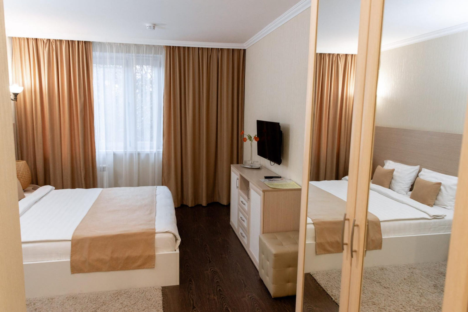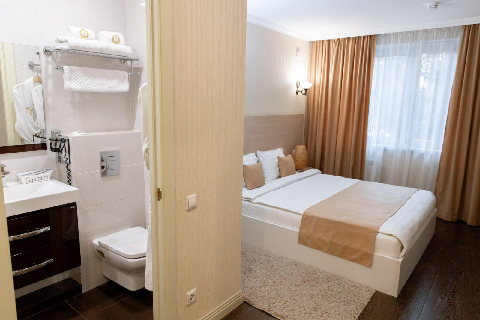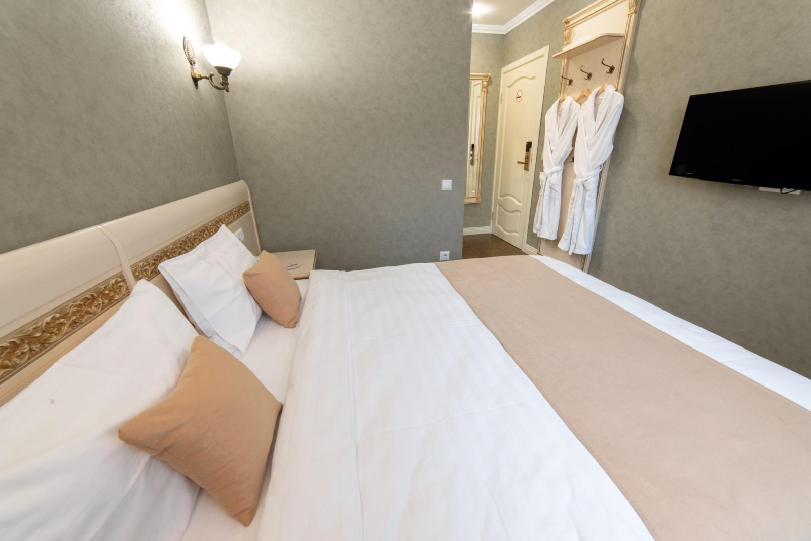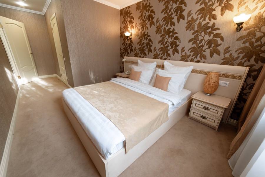 В номере: двуспальная кровать. В ванной комнате: душевая кабина, комплект полотенец, фен, туалетные принадлежности, халаты и тапочки. В номере есть доступ на балкон.