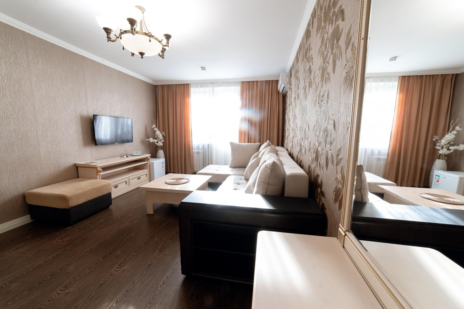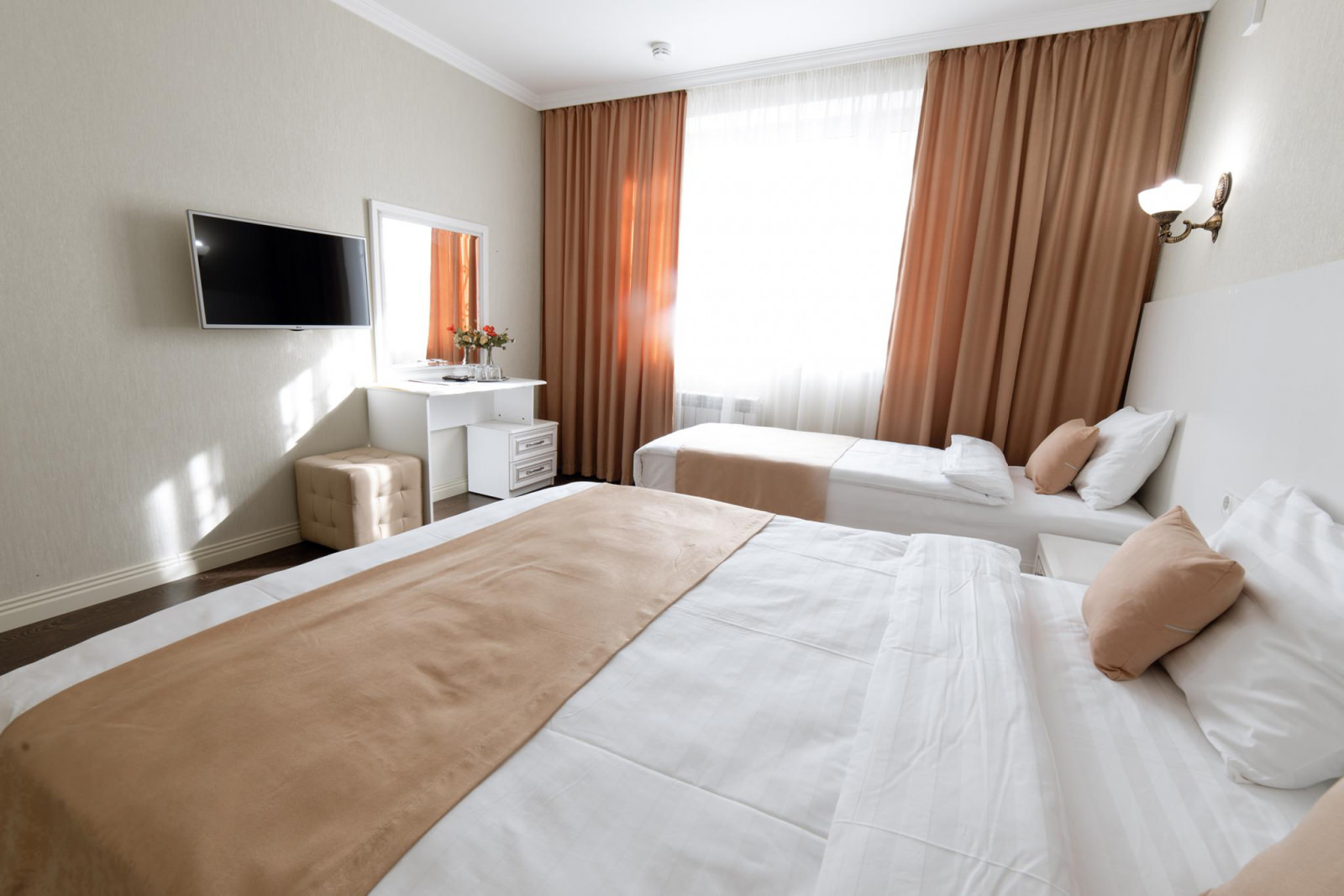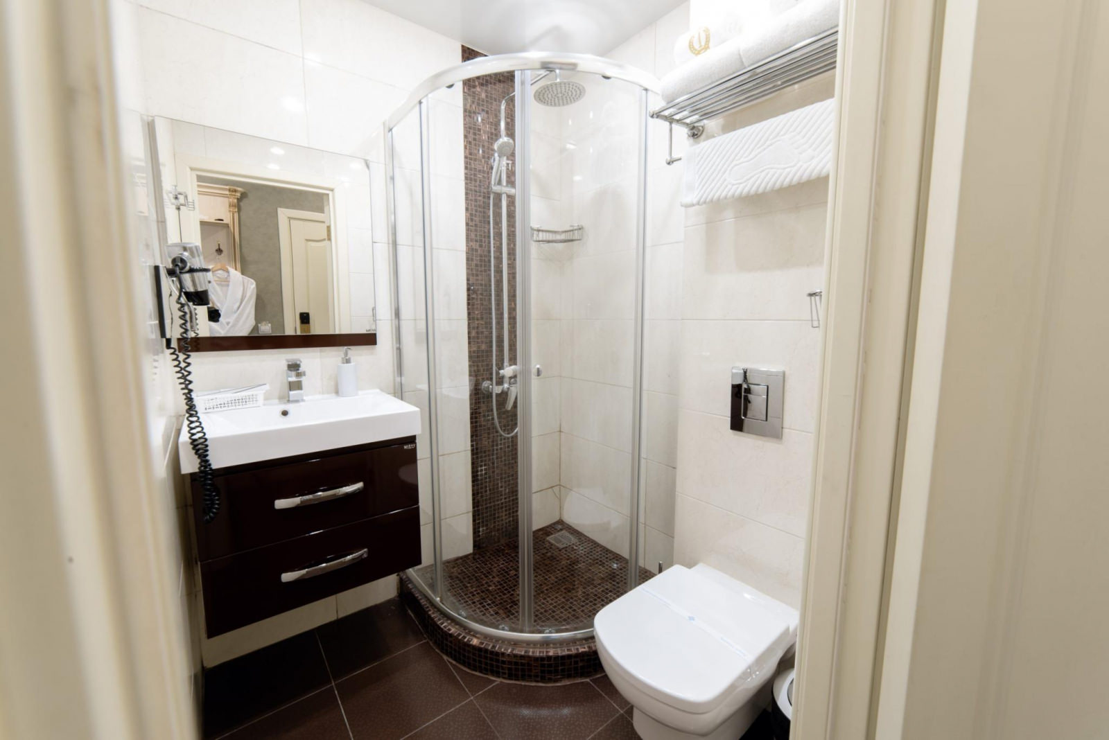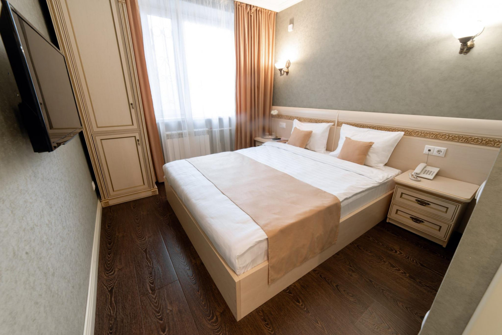 В номере: двуспальная кровать. В ванной комнате: душевая кабина, комплект полотенец, фен, туалетные принадлежности, халаты и тапочки. В номере есть доступ на балкон.