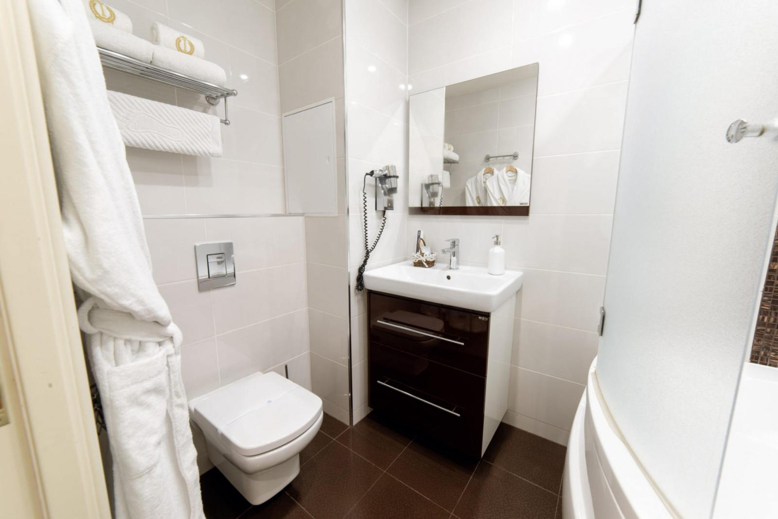 В номере: двуспальная кровать. В ванной комнате: душевая кабина, комплект полотенец, фен, туалетные принадлежности, халаты и тапочки. В номере есть доступ на балкон.