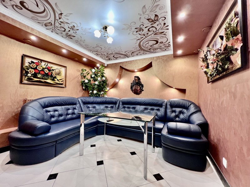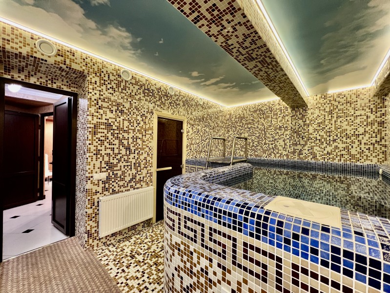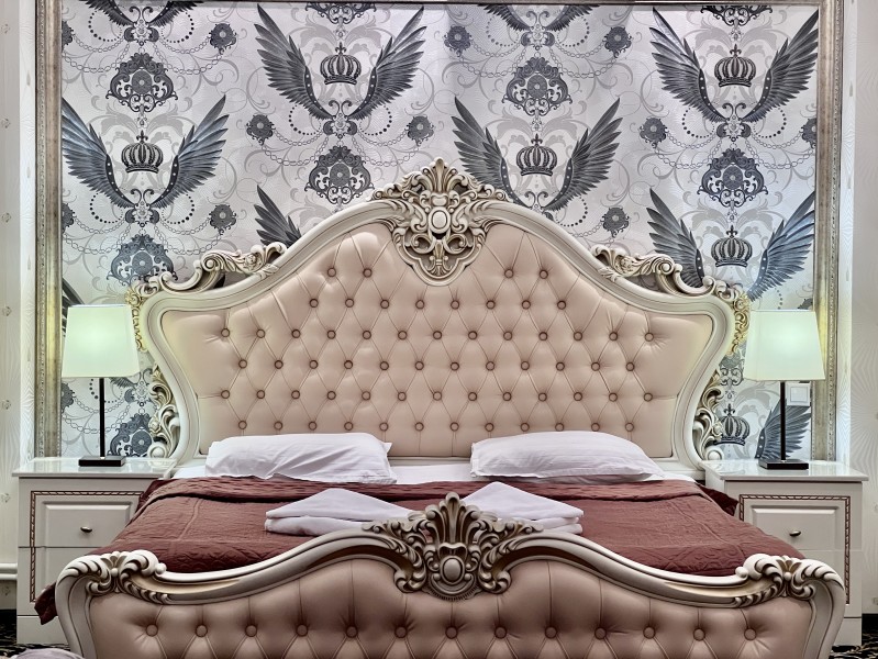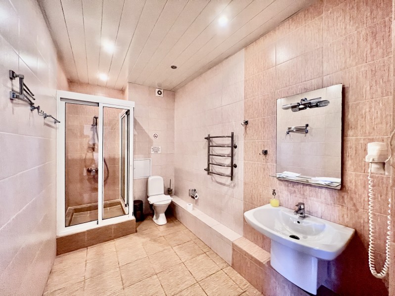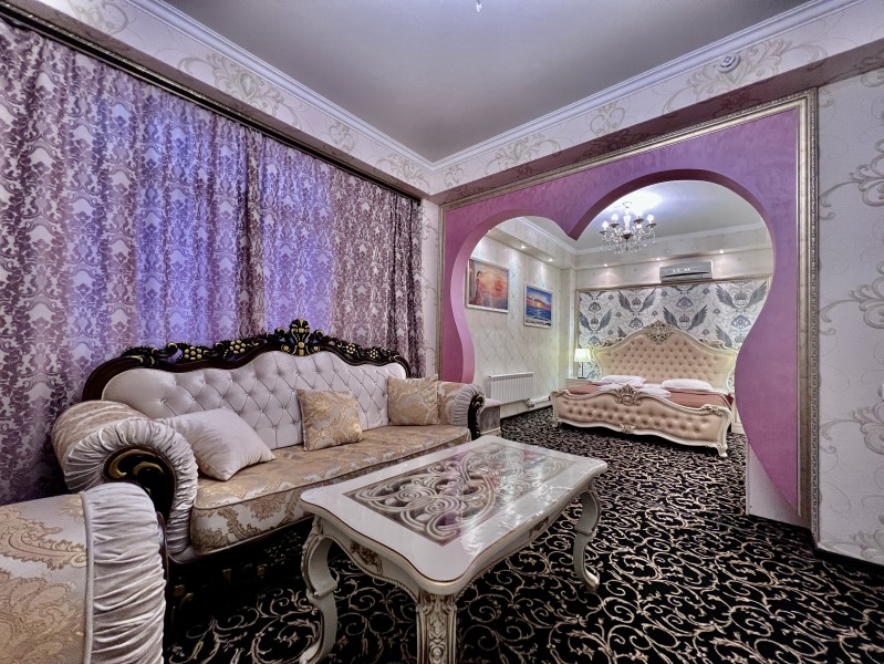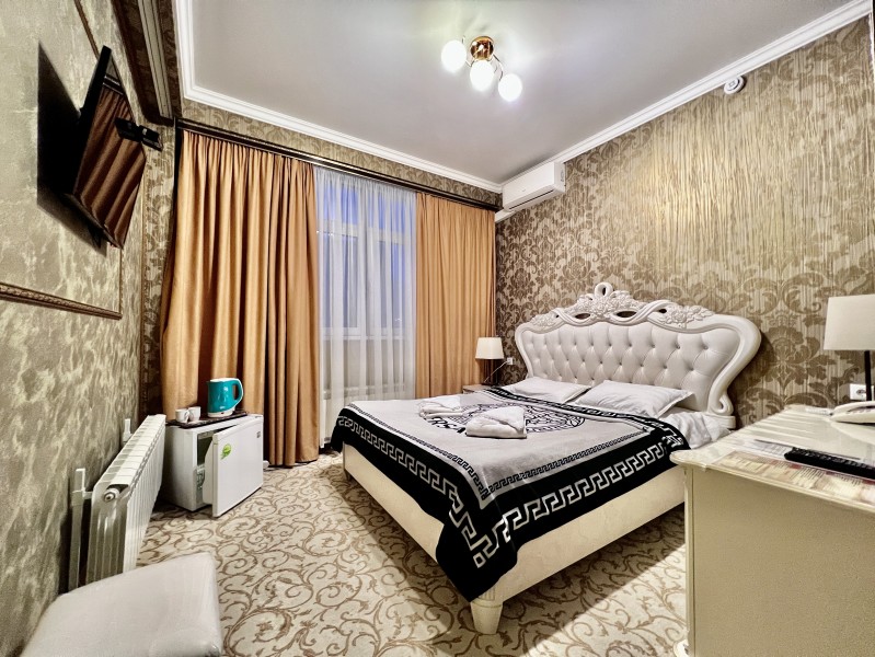 Площадь номера - 50 кв.м. 4 осн. места. Мебель: вешалка, диван, зеркало, кровать двуспальная, прикроватные тумбочки, стол, стулья, шкаф. Оборудование: вентилятор, мини-холодильник, телевизор. Санузел: сауна (бассейн), с джакузи, тапочки, туалетные принадлежности, фен. Сервис: Wi-Fi бесплатно, смена полотенец, смена постельного белья, уборка номера.