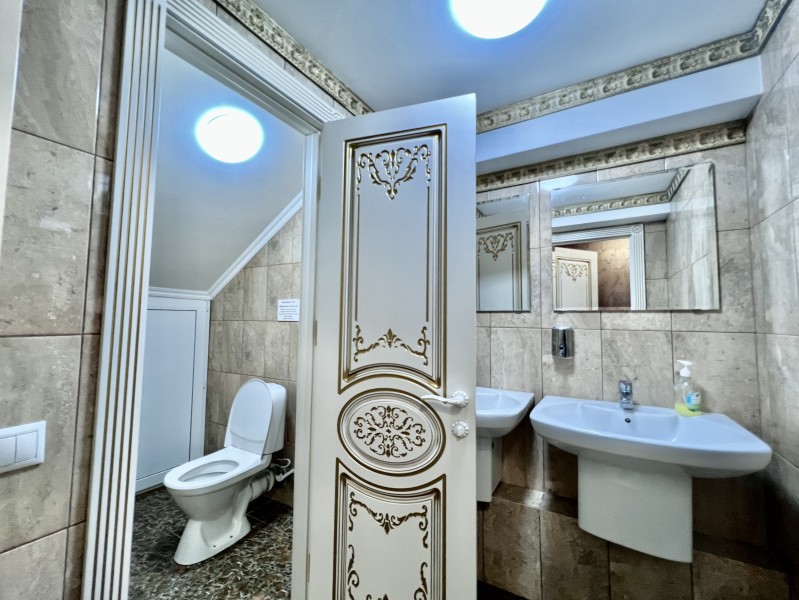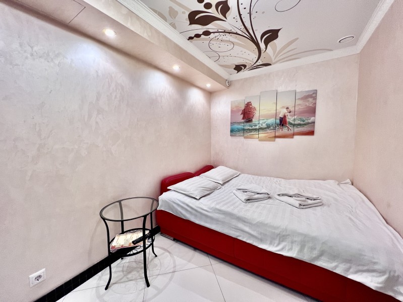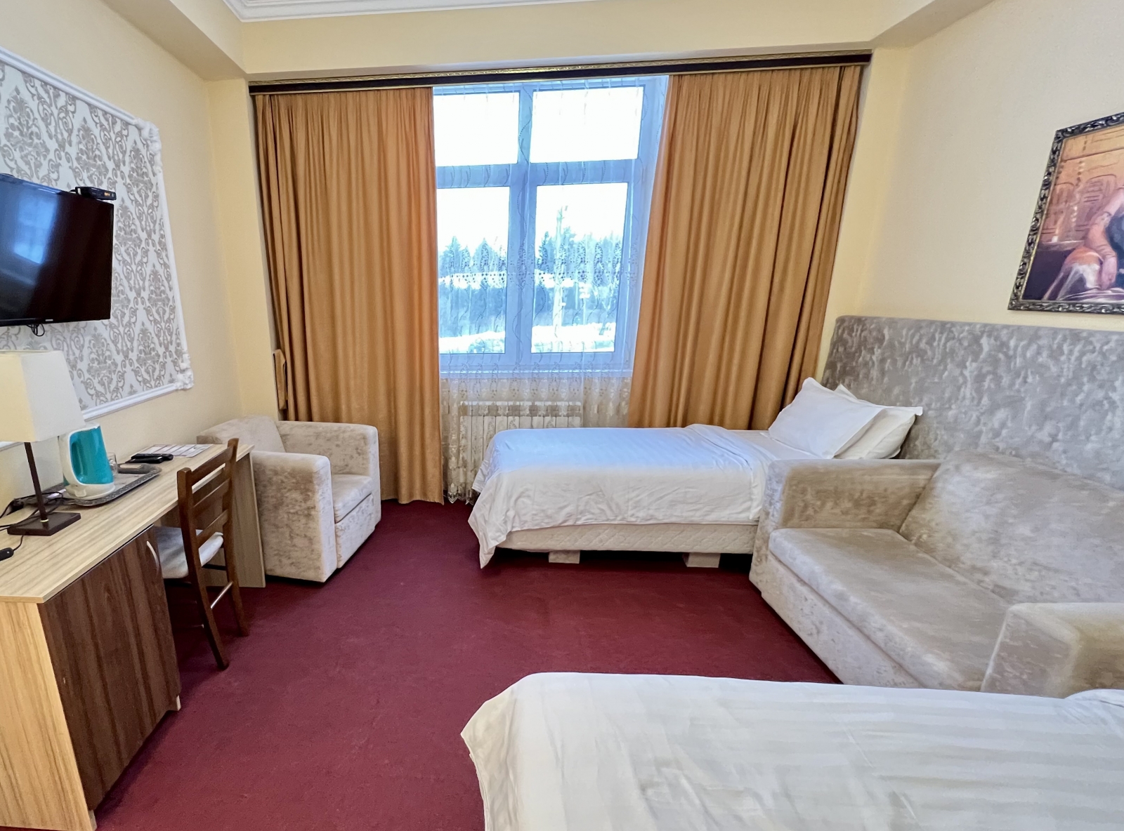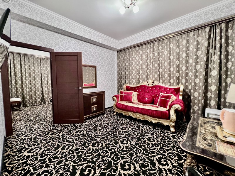 Площадь номера - 35 кв.м. 3 осн. места. Мебель: диван, кровать двуспальная, прикроватные тумбочки, стол, стул, шкаф. Оборудование: вентилятор, мини-холодильник, телевизор, чайный набор посуды, электрочайник. Санузел: с ванной/душем, тапочки, туалетные принадлежности, фен, халат. Сервис: Wi-Fi бесплатно, смена полотенец, смена постельного белья, уборка номера.