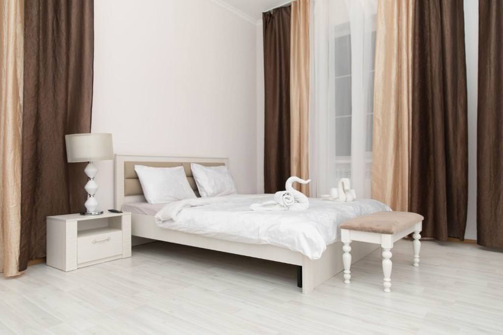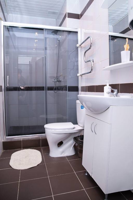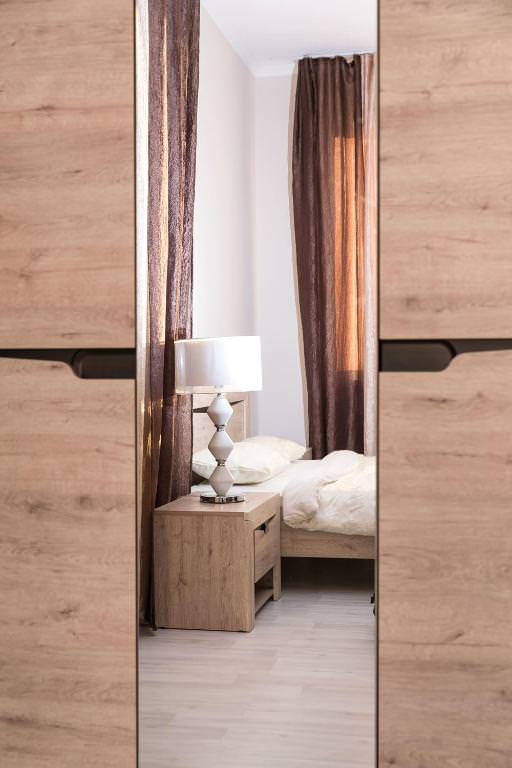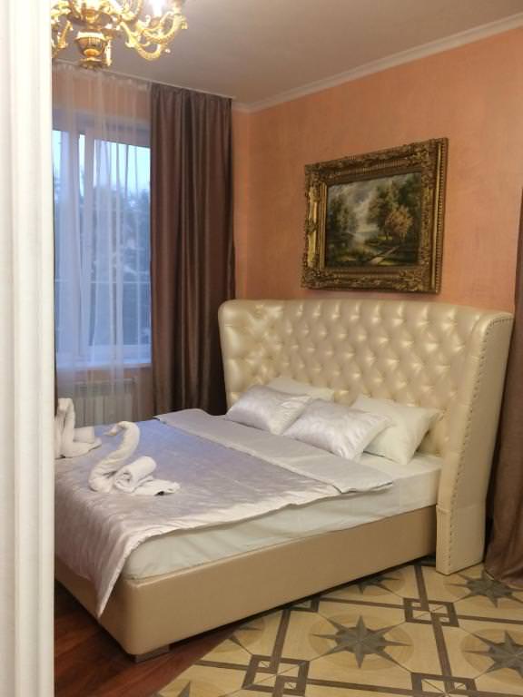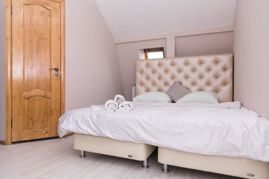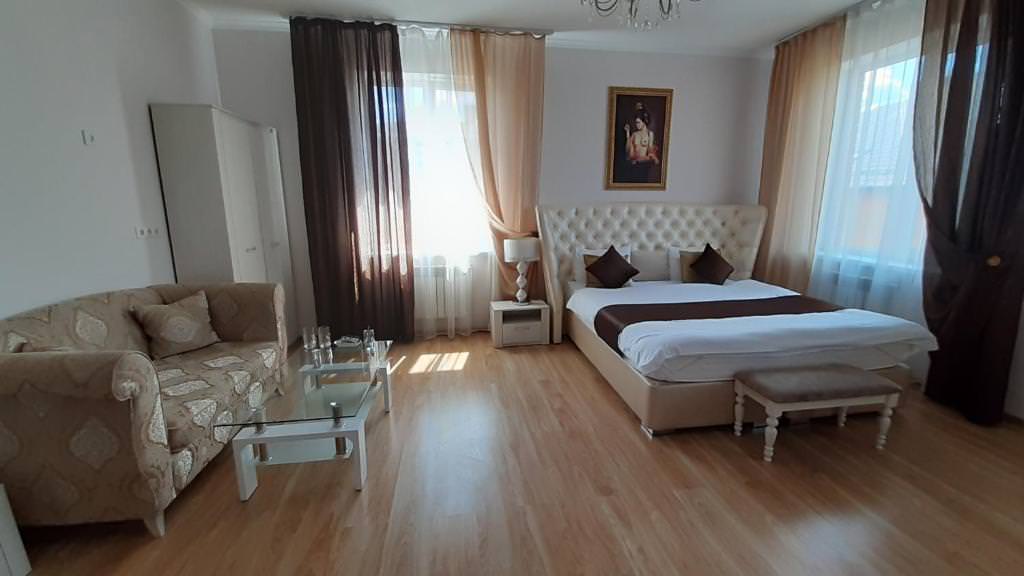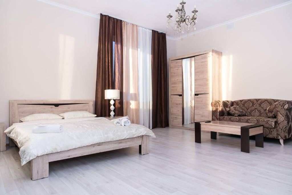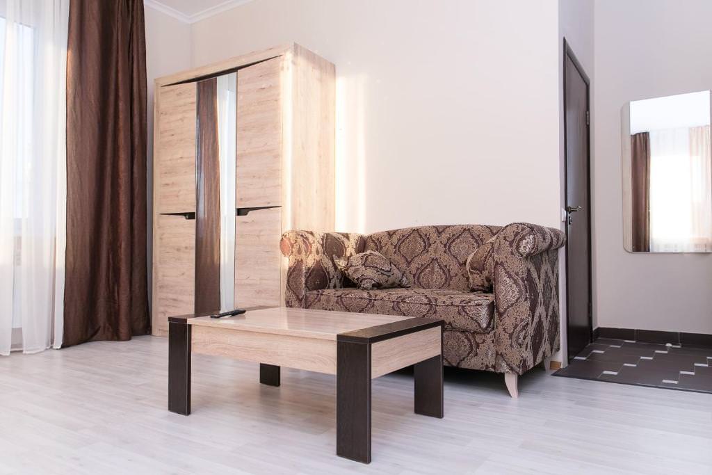 Площадь номера - 35 кв.м. 2 осн. места. Мебель: вешалка, зеркало, кровать двуспальная, прикроватные тумбочки, стол, стулья, шкаф. Мини-кухня. Оборудование. Санузел: с душем, тапочки, туалетные принадлежности. Сервис: Wi-Fi бесплатно, room-сервис, смена полотенец, смена постельного белья, уборка номера.