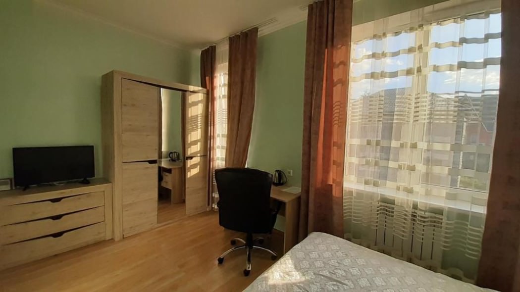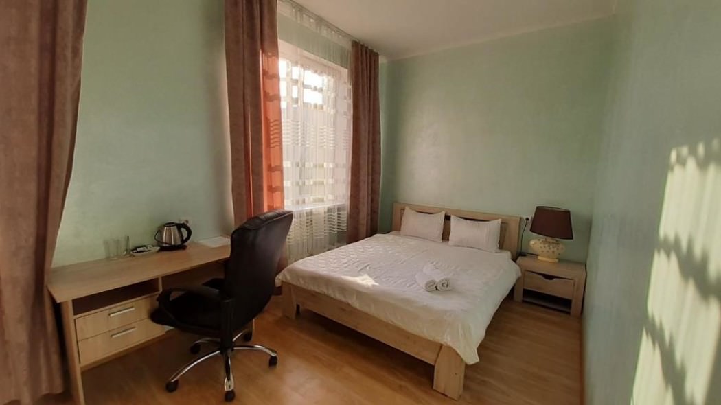2 осн. места. Мебель: вешалка, зеркало, кровать двуспальная, прикроватные тумбочки, стол, стулья, шкаф. Оборудование. Санузел на блок. Сервис: Wi-Fi бесплатно, room-сервис, смена полотенец, смена постельного белья, уборка номера.