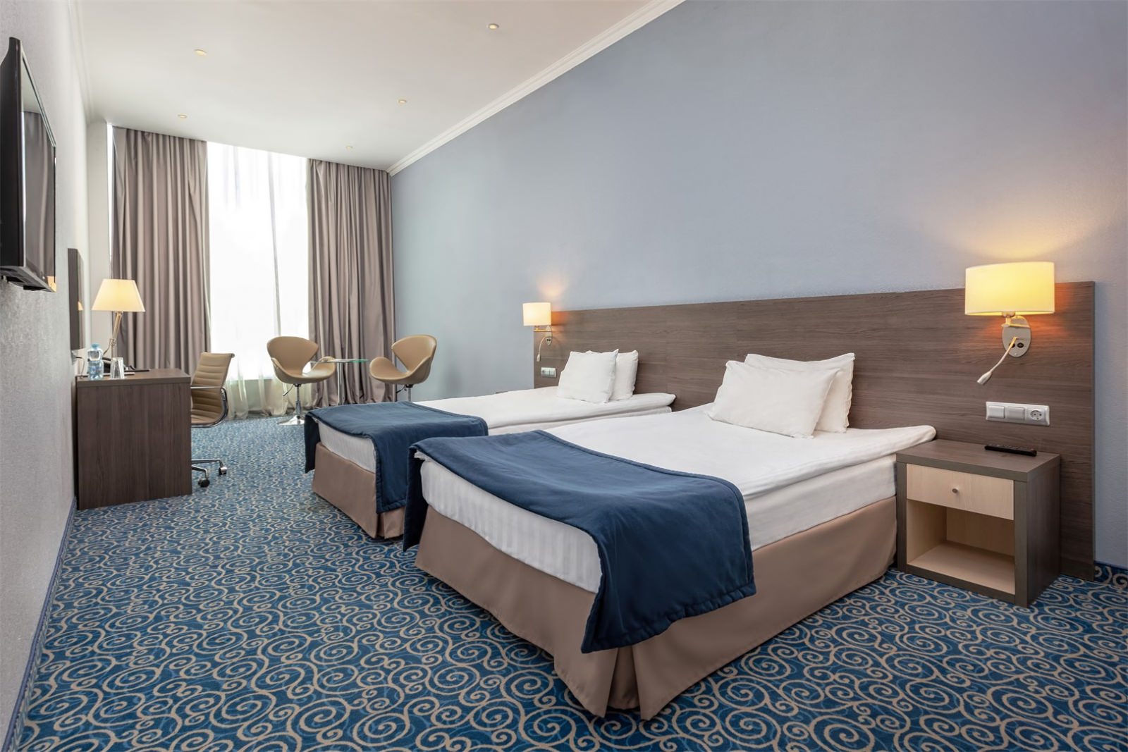 Номера категории стандарт "твин" могут незначительно отличаться друг от друга по площади от 18 до 27 м². Номер укомплектован индивидуальным набором (мыло, шампунь, гель для душа). По запросу сотрудники предоставят гладильную доску и утюг, швейный набор, обогреватель и чайник. Мини-бар наполняется по запросу согласно правилам отеля при внесении депозита на стойке регистрации.