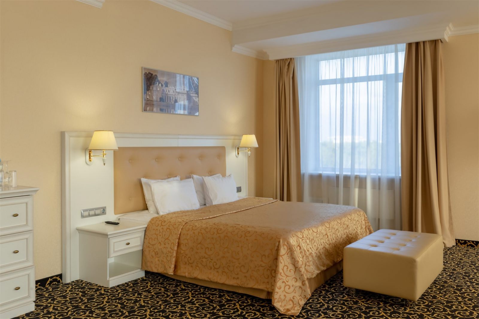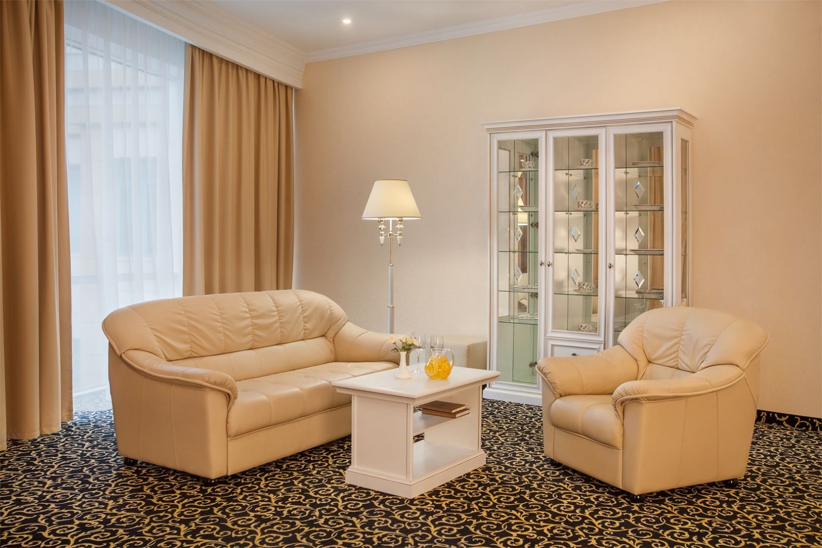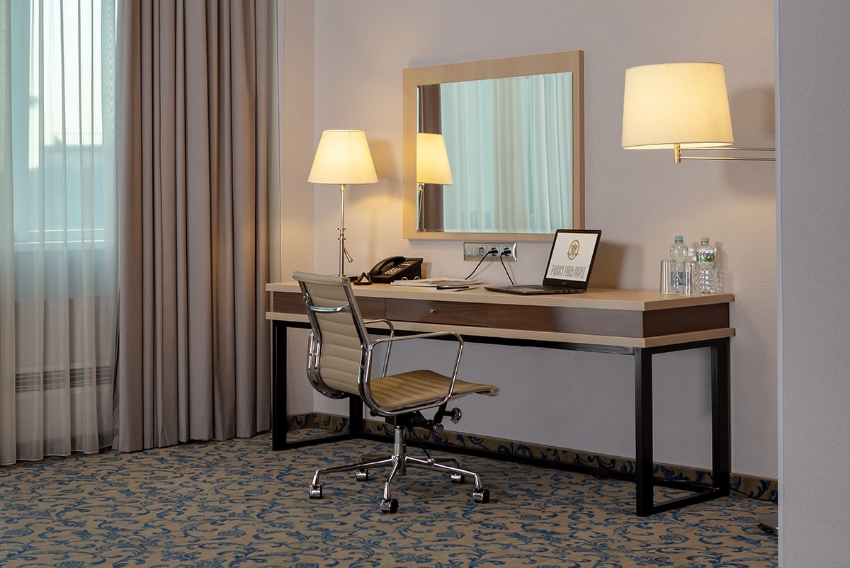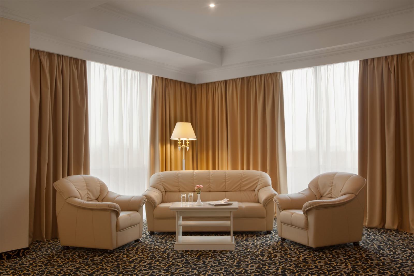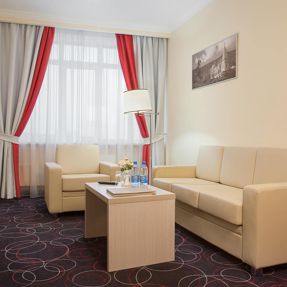 Уютный номер в классическом стиле. Пространство комнаты разделено на просторную спальню с панорамными окнами и гостиную с обеденным столом. Большая ванная комната (14 м²) с вместительной душевой кабиной. Номер укомплектован индивидуальным набором (мыло, шампунь, гель для душа, зубной набор, набор для бритья и блокнот с ручкой). По запросу сотрудники предоставят гладильную доску, утюг, швейный набор, обогреватель и чайник. Мини-бар наполняется по запросу согласно правилам отеля при внесении депозита на стойке регистрации.