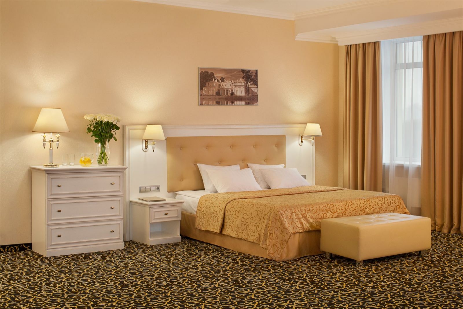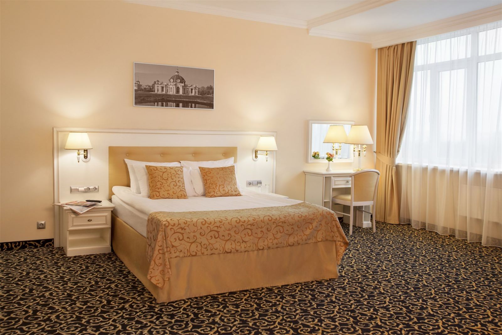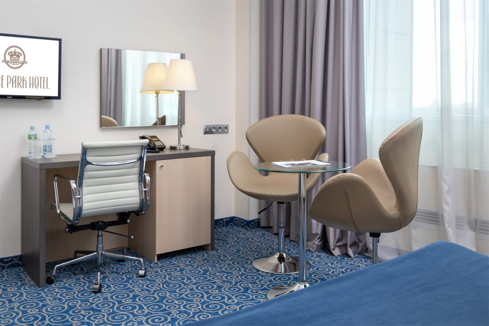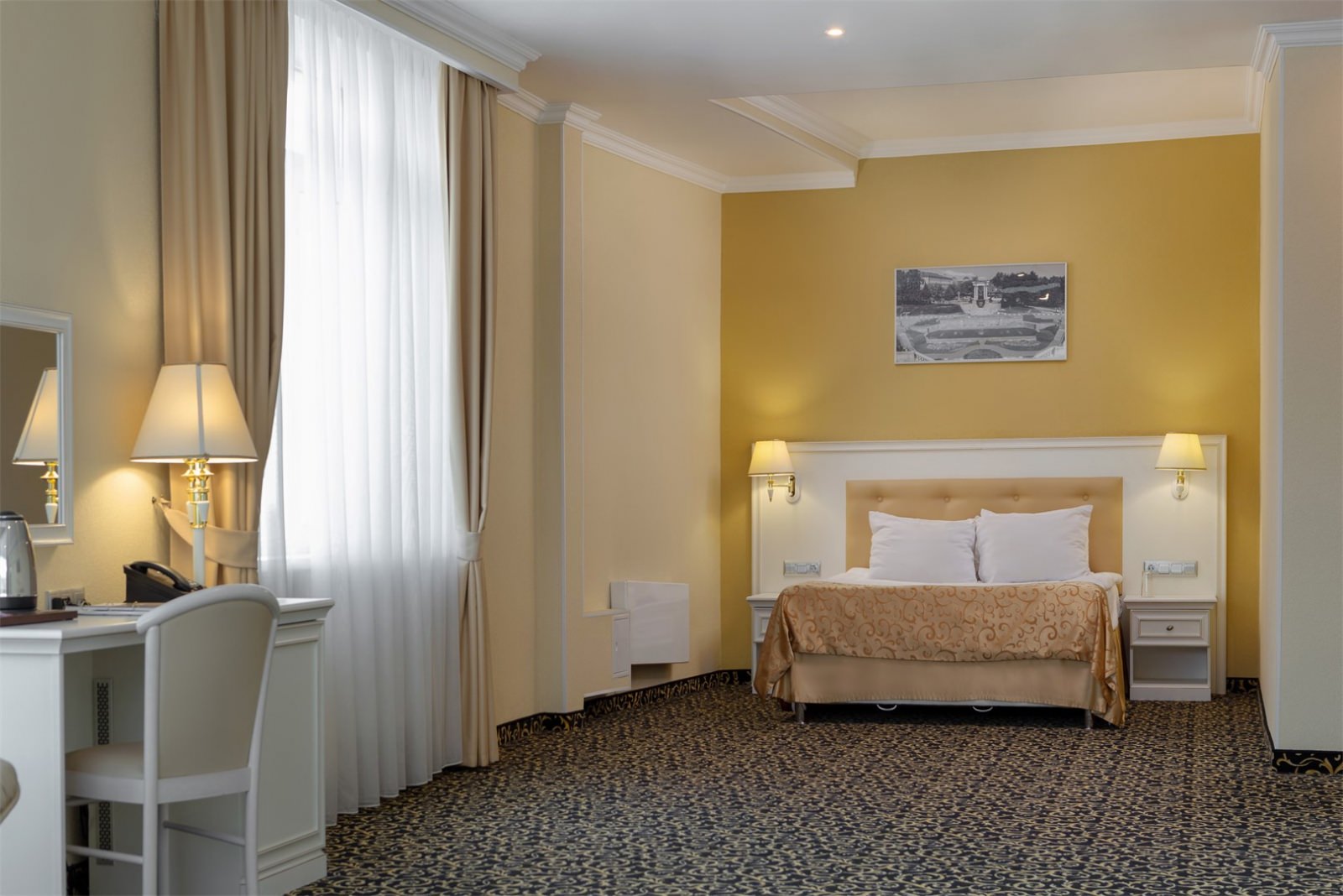 Уютный номер в классическом стиле. Пространство комнаты разделено на просторную спальню с панорамными окнами и гостиную с обеденным столом. Большая ванная комната (14 м²) с вместительной душевой кабиной. Номер укомплектован индивидуальным набором (мыло, шампунь, гель для душа, зубной набор, набор для бритья и блокнот с ручкой). По запросу сотрудники предоставят гладильную доску, утюг, швейный набор, обогреватель и чайник. Мини-бар наполняется по запросу согласно правилам отеля при внесении депозита на стойке регистрации.