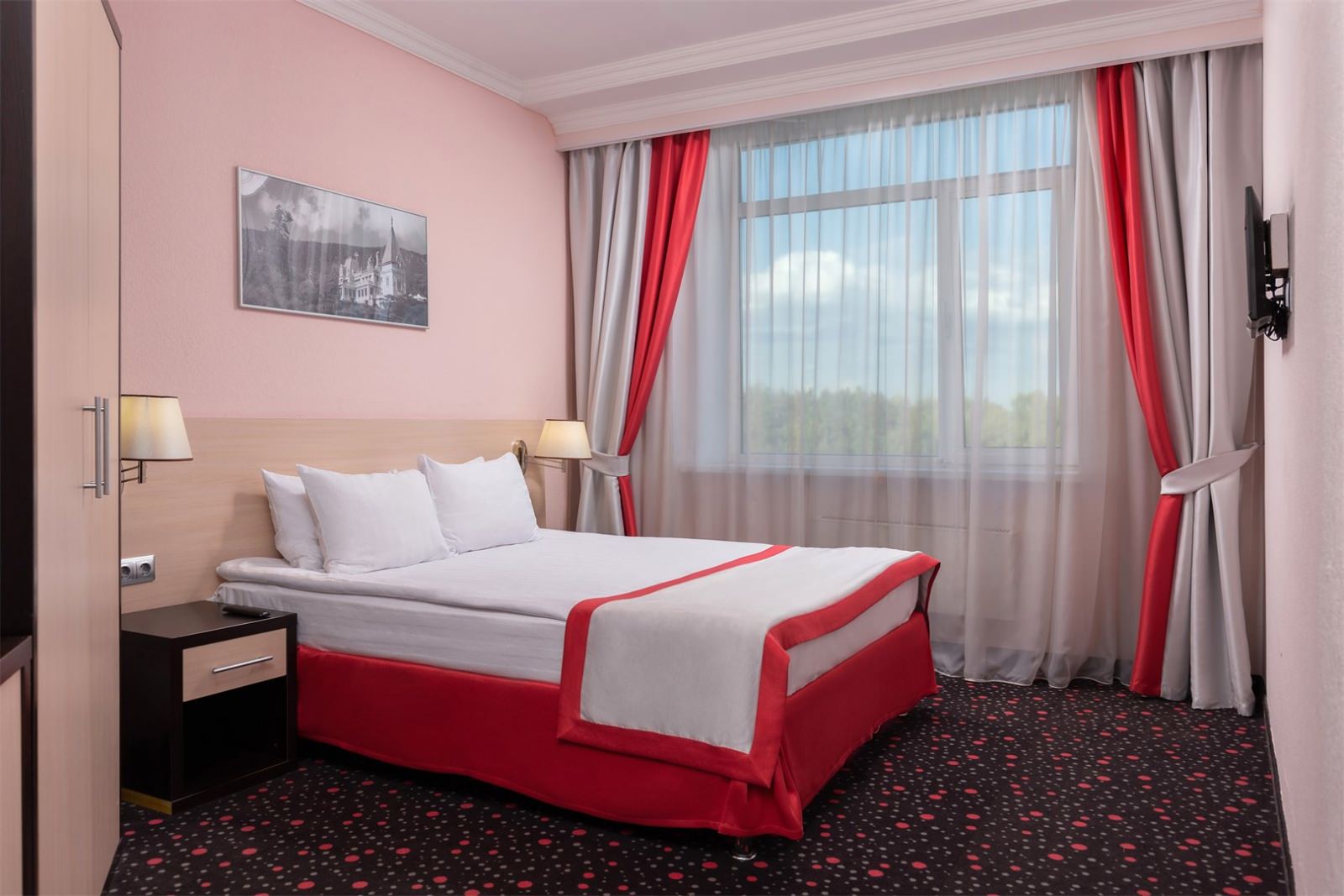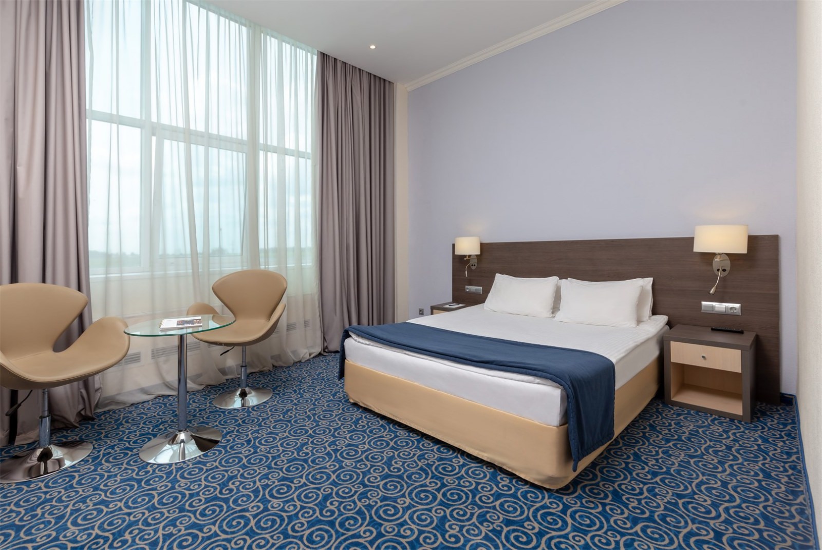 Просторный номер с большой двуспальной кроватью. Номера могут незначительно отличаться друг от друга по площади от 22 до 27 м². Номер укомплектован индивидуальным набором (мыло, шампунь, гель для душа). По запросу сотрудники предоставят зубной набор, гладильную доску, утюг, швейный набор, обогреватель и чайник. Мини-бар наполняется по запросу согласно правилам отеля при внесении депозита на стойке регистрации.