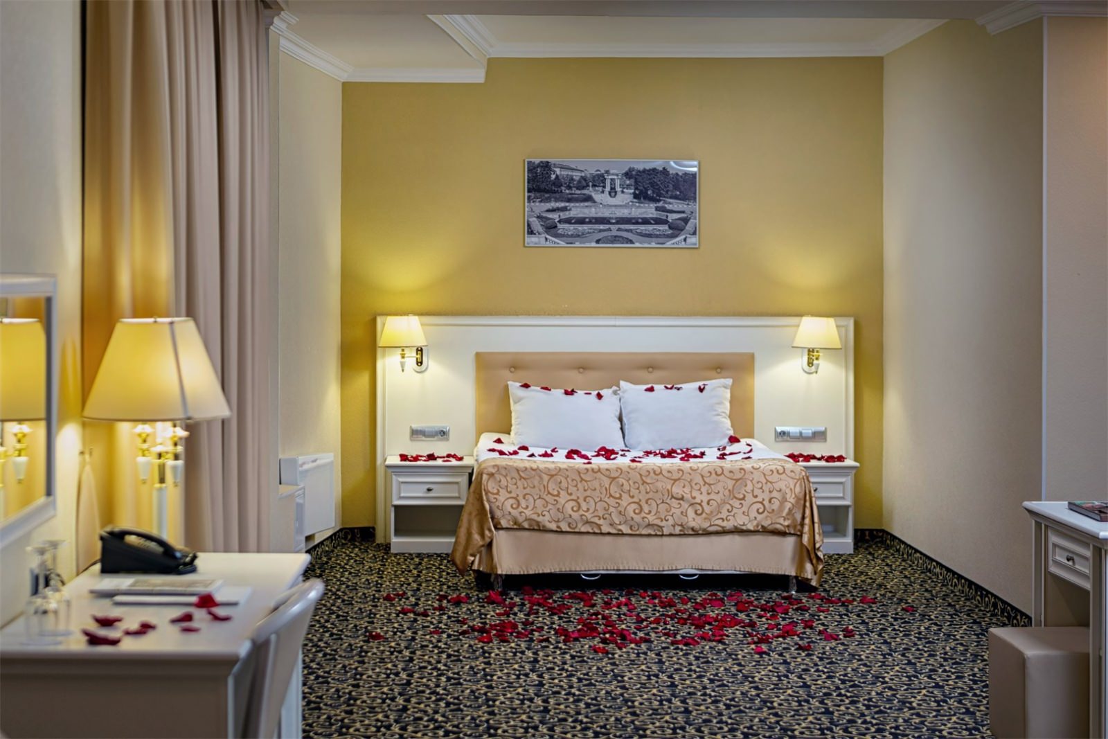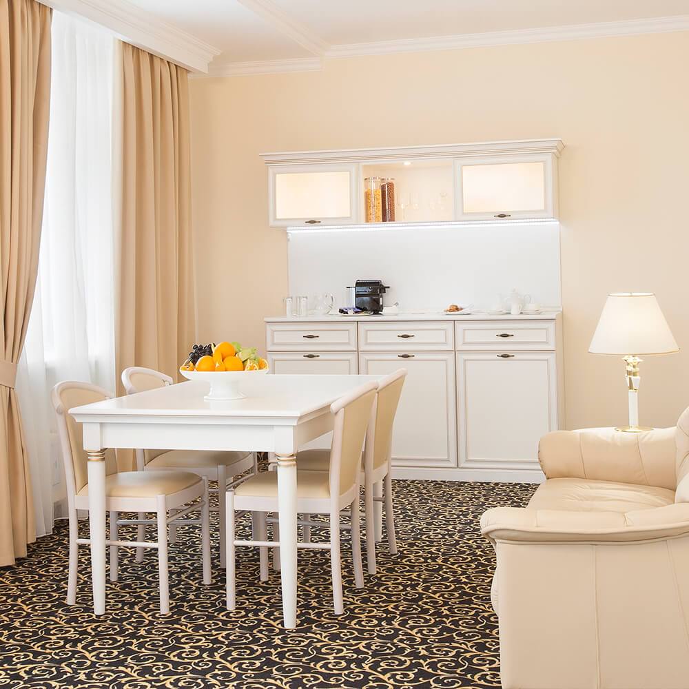 Самый большой номер в классическом стиле. Просторная спальня, гостиная и кухонный уголок. Большая ванная комната (18 м²) с джакузи и душевой кабиной. Номер укомплектован индивидуальным набором (мыло, шампунь, гель для душа, зубной набор, набор для бритья и блокнот с ручкой). По запросу сотрудники предоставят гладильную доску, утюг, швейный набор, обогреватель и чайник. Мини-бар наполняется по запросу согласно правилам отеля при внесении депозита на стойке регистрации.