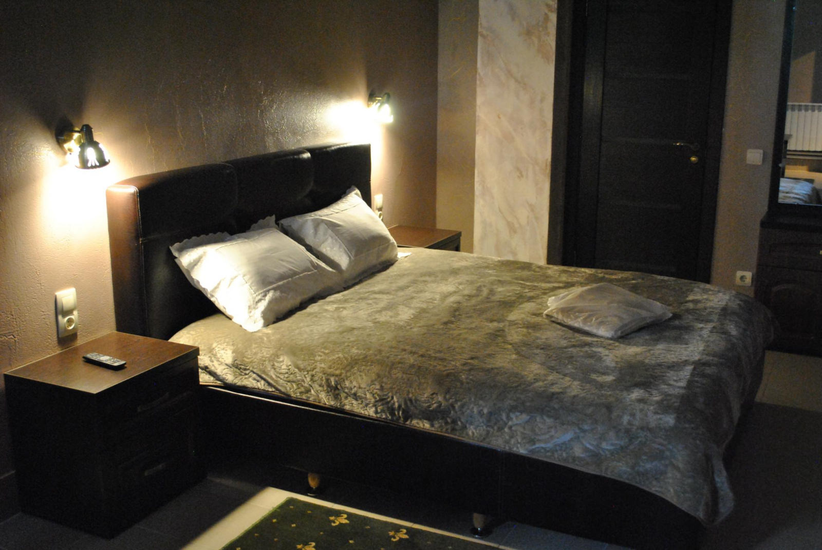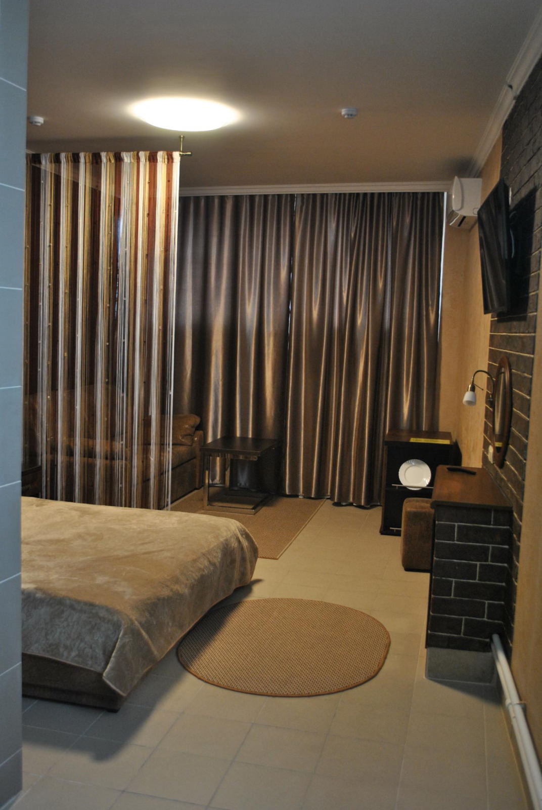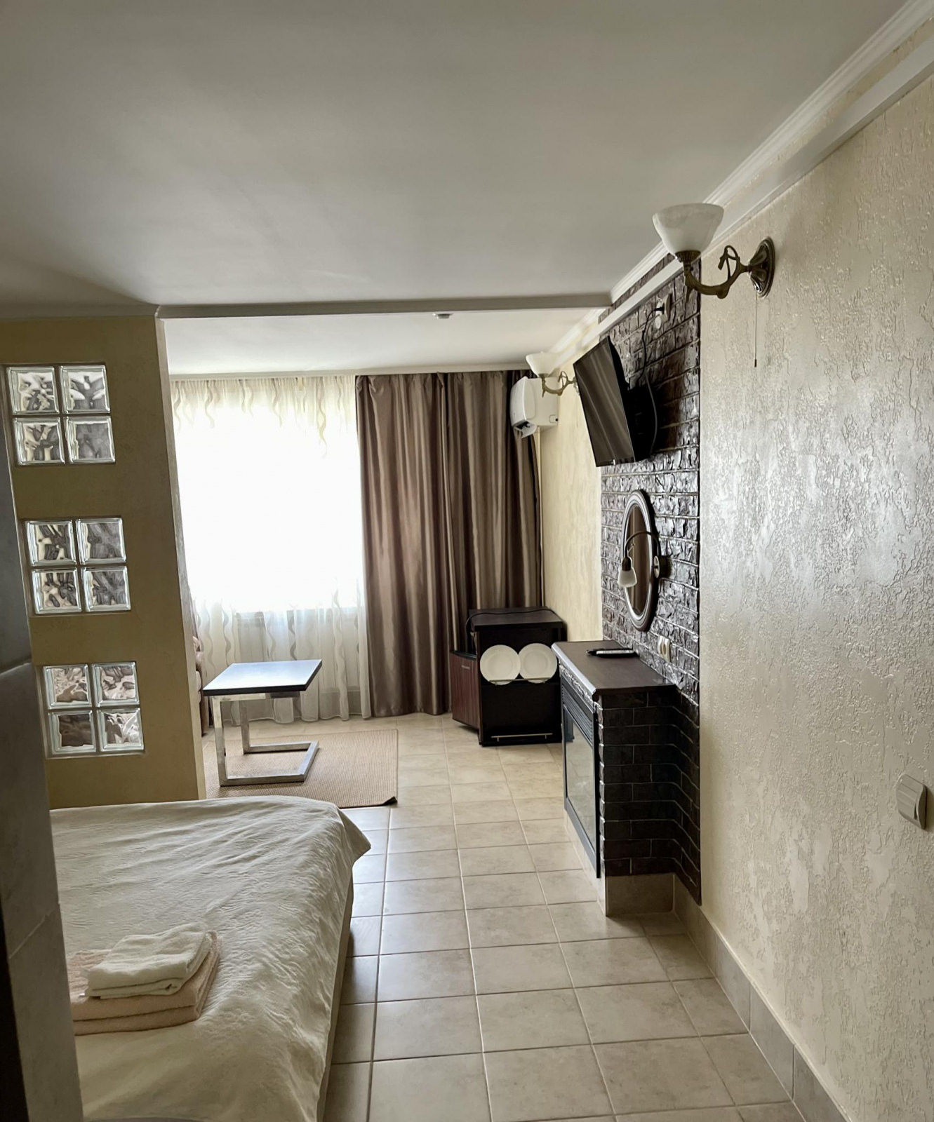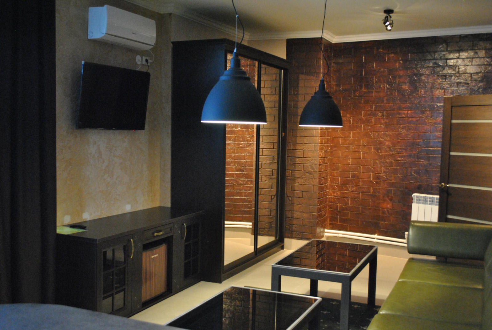 Кровать King size, диван не раскладывается, плазменный телевизор, Wi-fi, холодильник, душ, посуда, камин, кондиционер. В этом номере возможно дополнительное спальное место.