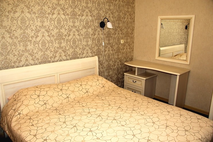 2 осн. места. 1 доп. место. Мебель: вешалка, зеркало, комод, кровать двуспальная, прикроватные тумбочки, тумба под телевизор, шкаф. Оборудование: гладильная доска, сплит-система, телевизор, утюг, холодильник, чайный набор посуды, электрочайник. Санузел: с ванной или душевой кабиной, тапочки, туалетные принадлежности, фен, халат. Сервис: смена полотенец (1 раз в 4 дня), смена постельного белья (1 раз в 4 дня), уборка номера (ежедненво).