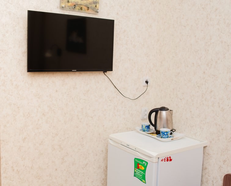 2 осн. места. 1 доп. место. Мебель: кровати односпальные, прикроватные тумбочки, стол, стул, шкаф. Оборудование: телевизор, холодильник, электрочайник. Санузел: с душевой кабиной, туалетные принадлежности. Сервис: смена полотенец (1 раз в 4 дня), смена постельного белья (1 раз в 4 дня), уборка номера (ежедневно).