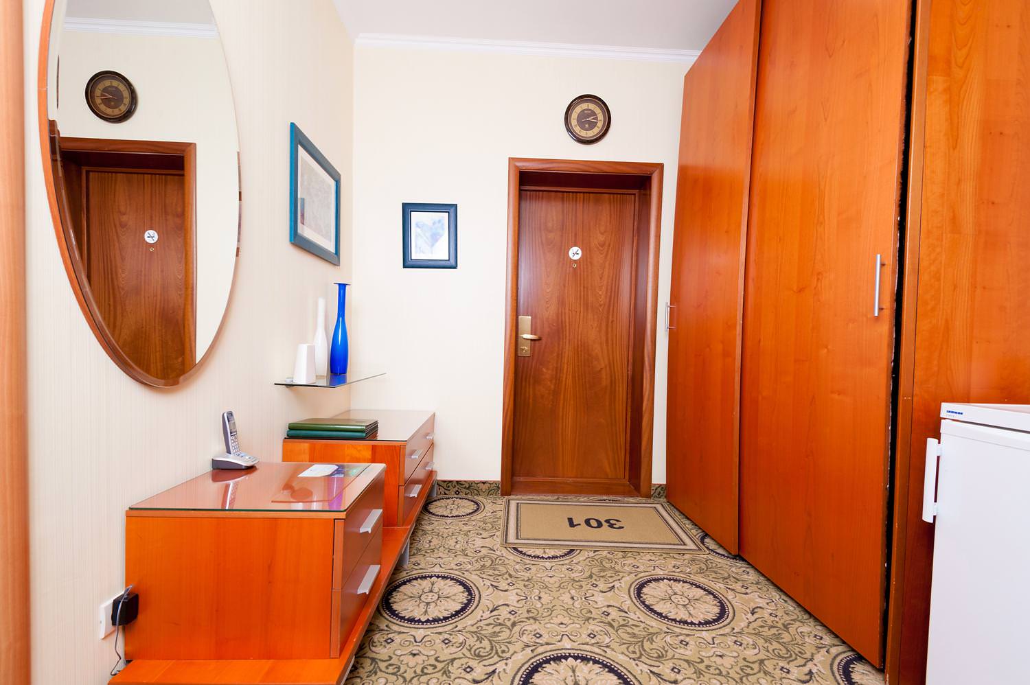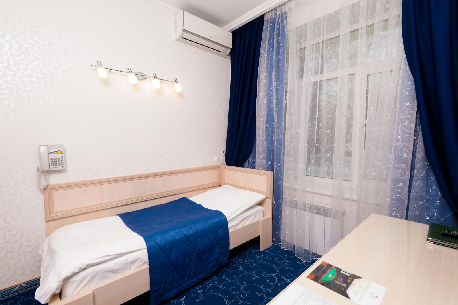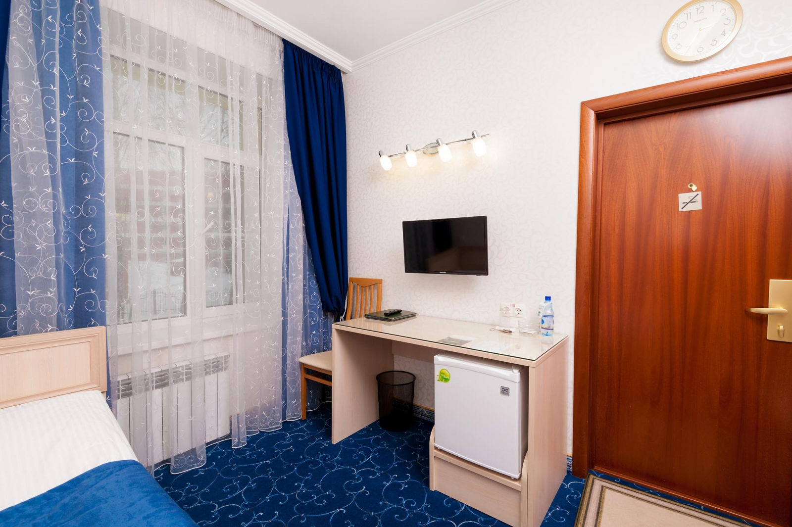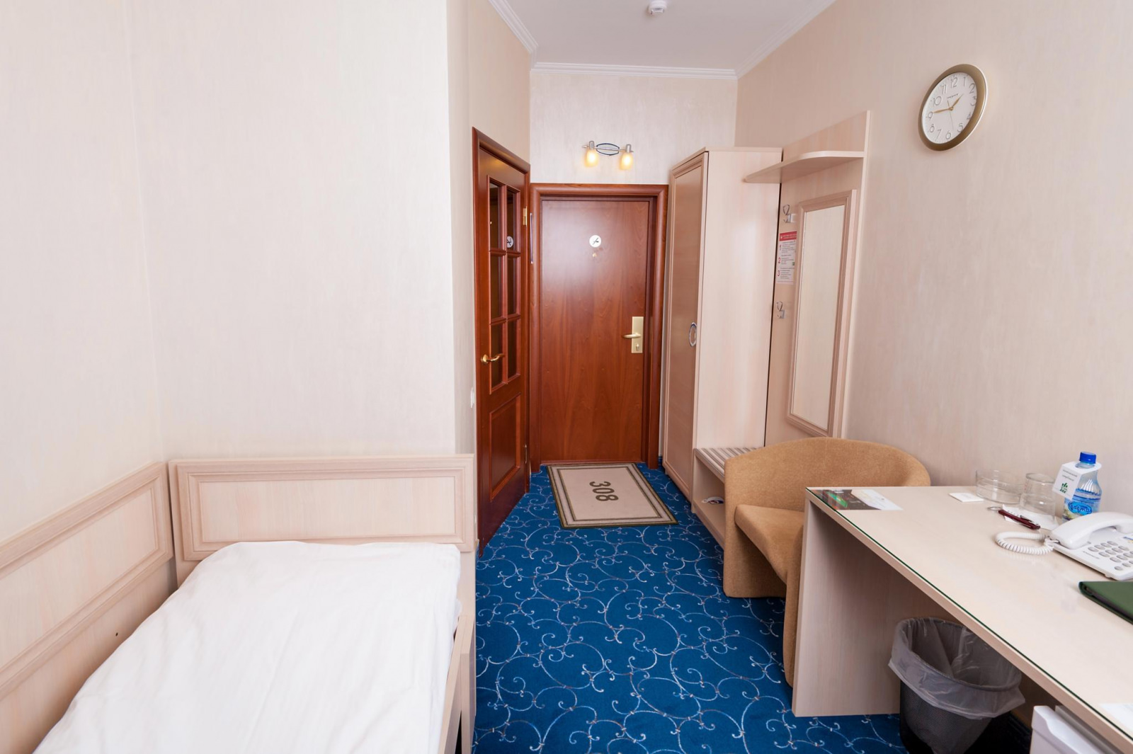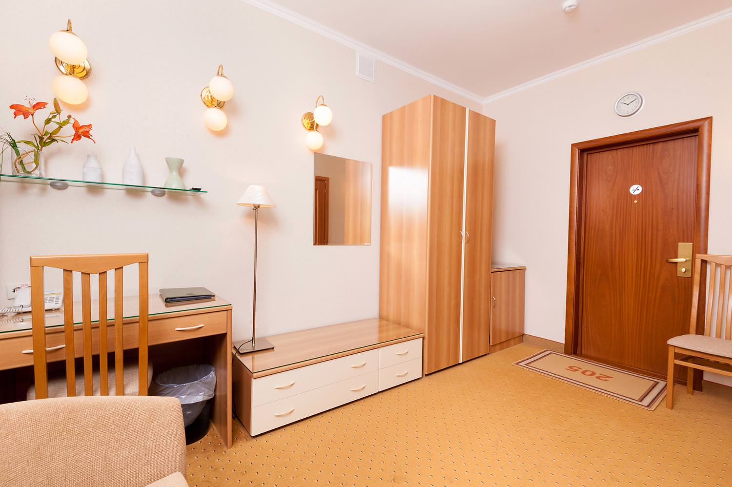 Одноместный номер Экономкласса площадью 12 м² — удобный и доступный номер с одноместной кроватью. Это скромные и аккуратные номера для экономных путешественников. Часто в этих номерах располагаются помощники VIP-гостей, ведь эти номера находятся рядом с Люксами.