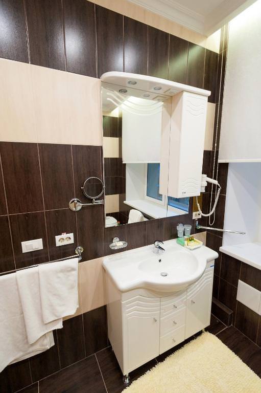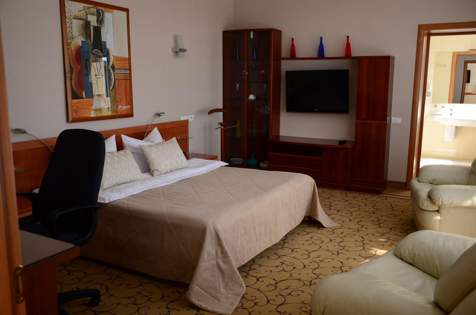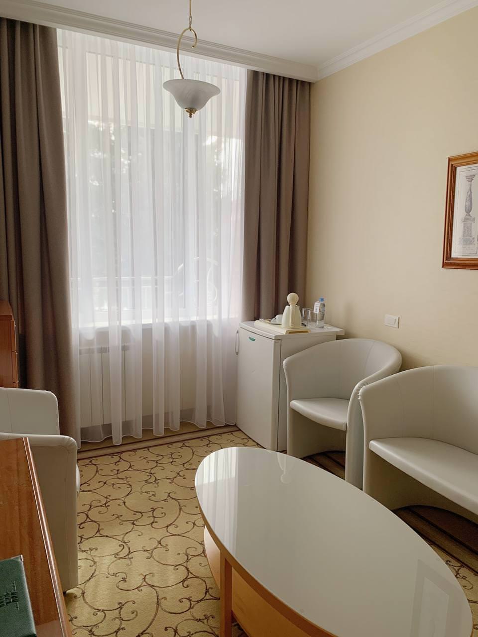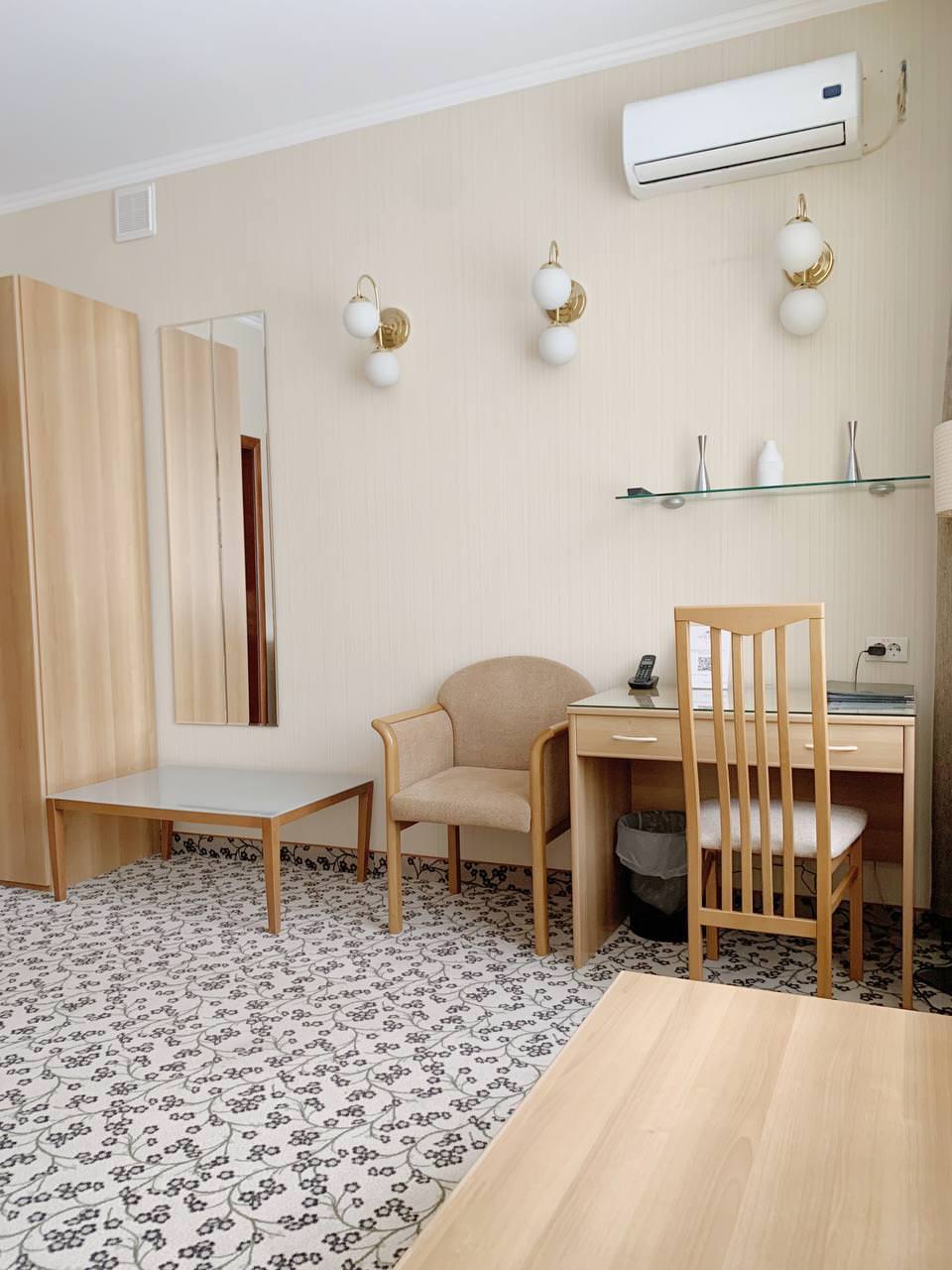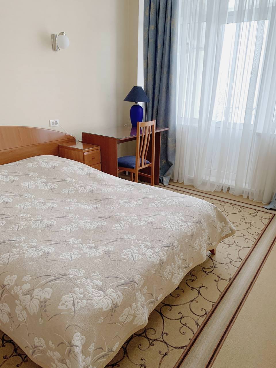 Светлый ЛЮКС площадью 50 м² — единственный в своем роде. Номер примет гостей, которые живут своим делом и отдаются ему полностью. Подводить итоги рабочего дня на роскошном кожаном диване с ноутбуком на чайном столике — пожалуй, идеальный вариант для гостей, которые все время работают. Не стоит тратить время на походы до кровати — она уже рядом: двуспальная с ортопедическим матрасом и всегда чистым и отглаженным бельем. Конечно же, совмещенный санузел с ванной и душевой кабиной, махровый комплект и гигиенический набор — в комплекте этого ЛЮКСА.