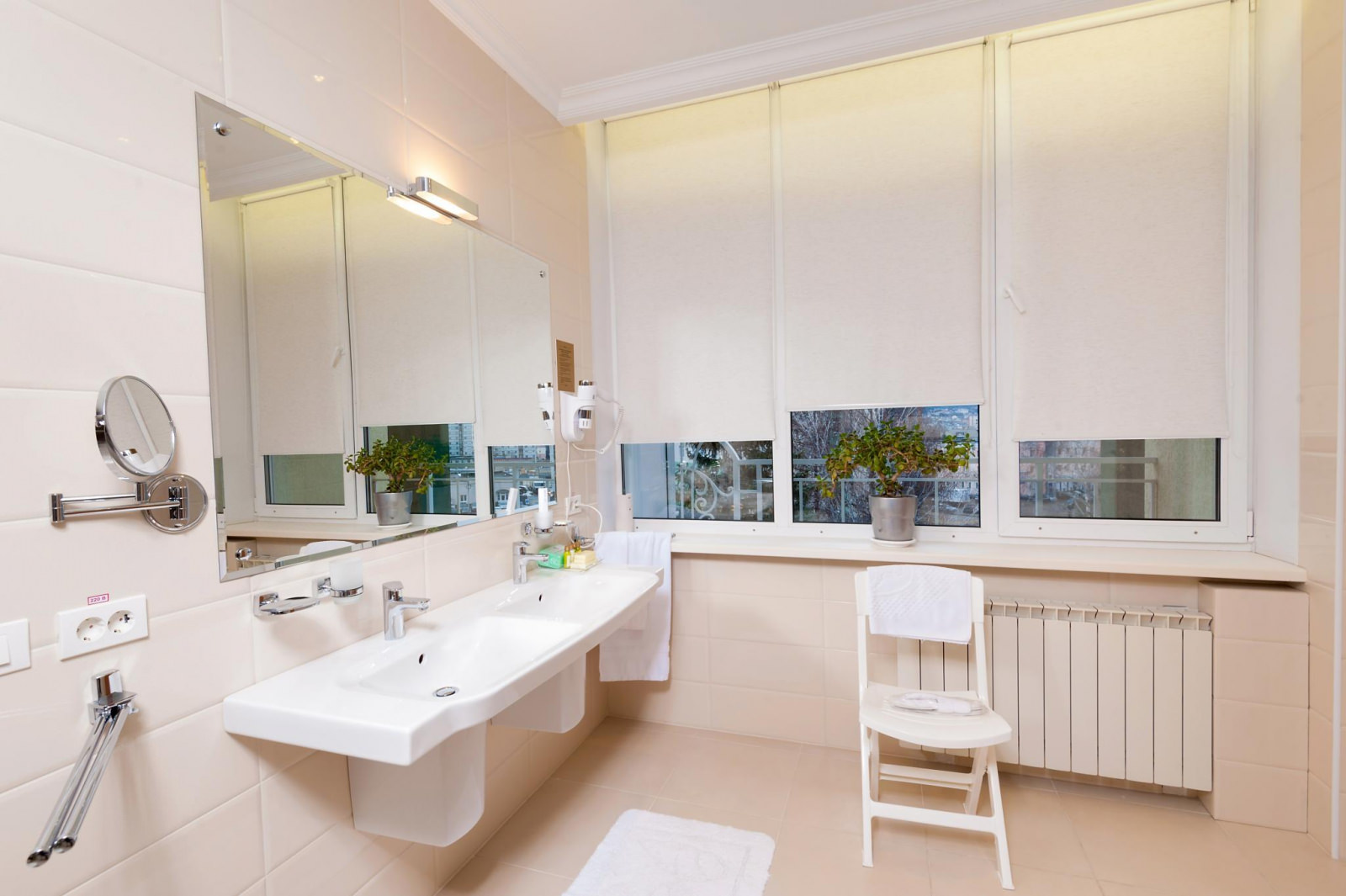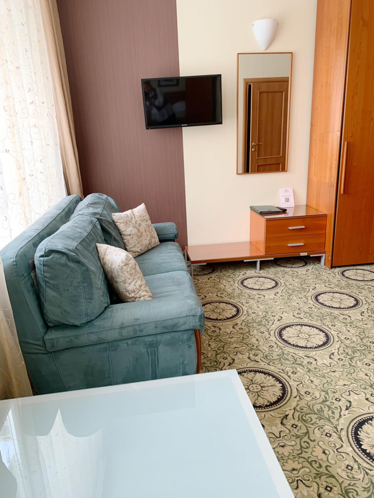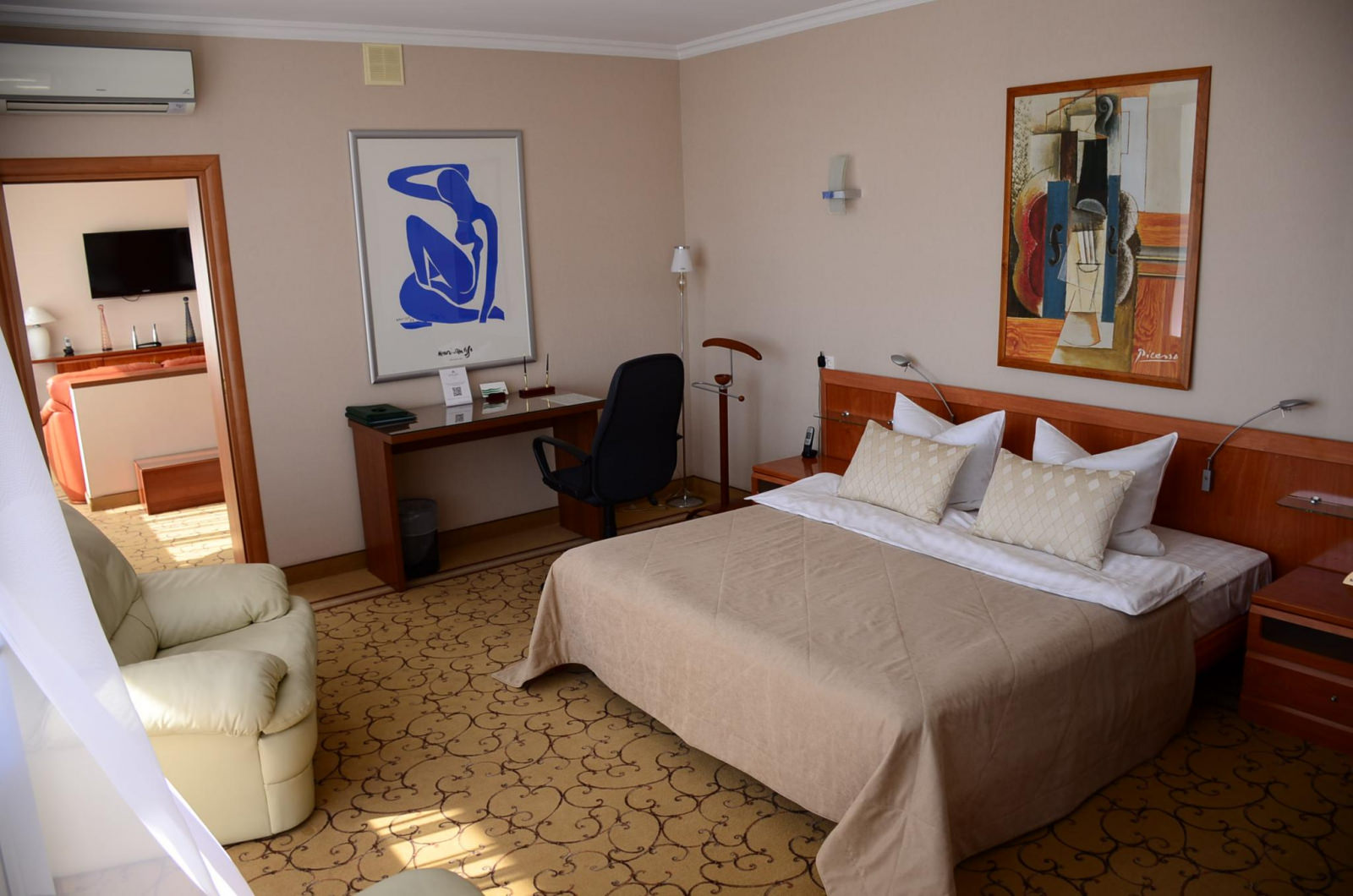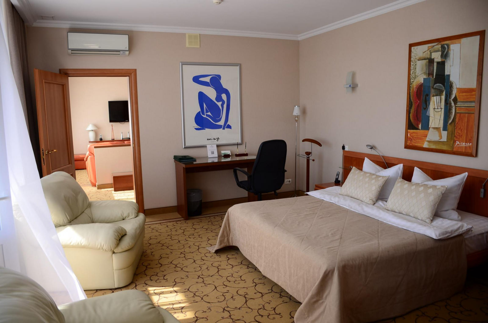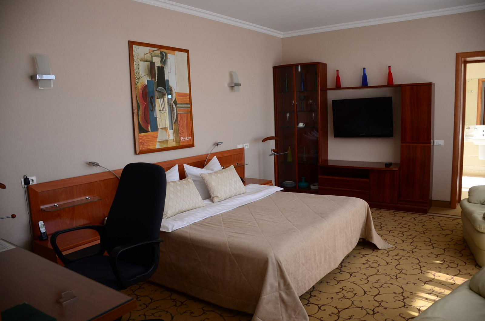 Светлый ЛЮКС площадью 50 м² — единственный в своем роде. Номер примет гостей, которые живут своим делом и отдаются ему полностью. Подводить итоги рабочего дня на роскошном кожаном диване с ноутбуком на чайном столике — пожалуй, идеальный вариант для гостей, которые все время работают. Не стоит тратить время на походы до кровати — она уже рядом: двуспальная с ортопедическим матрасом и всегда чистым и отглаженным бельем. Конечно же, совмещенный санузел с ванной и душевой кабиной, махровый комплект и гигиенический набор — в комплекте этого ЛЮКСА.
