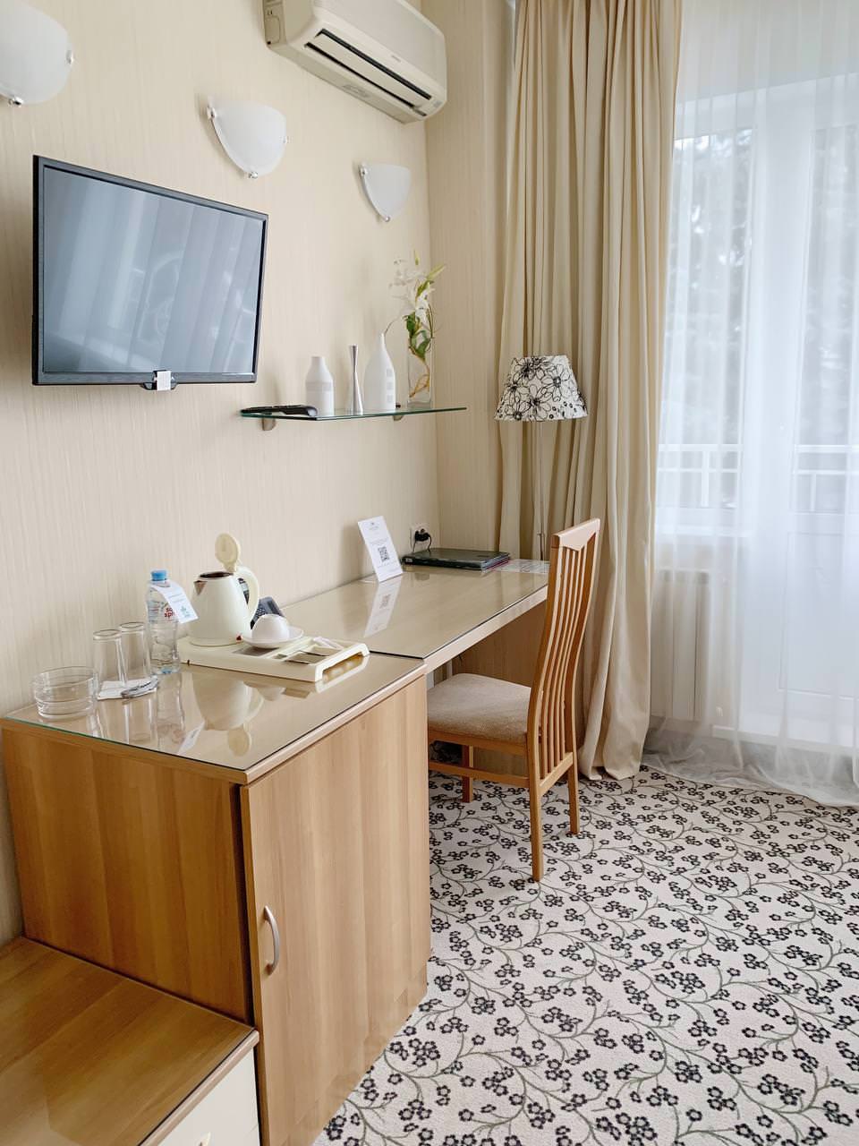 2-комнатный Полулюкс площадью 40 м² подойдет для плодотворной работы в гостиной комнате, если вы остановились в номере один или в команде из 2-3 человек. Отдохнуть после насыщенного дня можно перед телевизором в гостиной или в спальне. В просторном совмещенном санузле с душевой кабиной уйдет напряжение. А ночь в уютной кровати с ортопедическим матрасом позволит вам выспаться и набраться сил для достижения новых вершин.