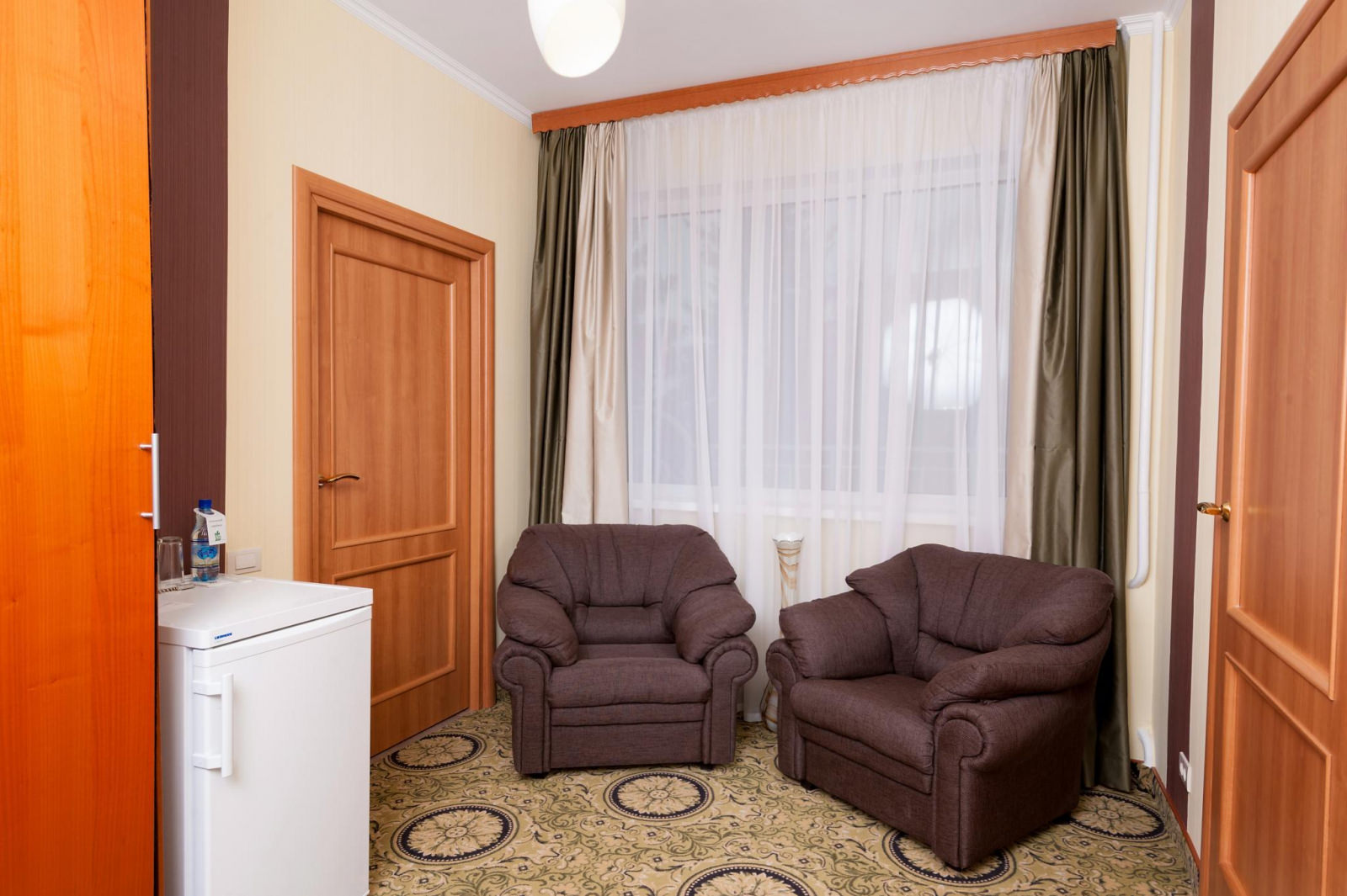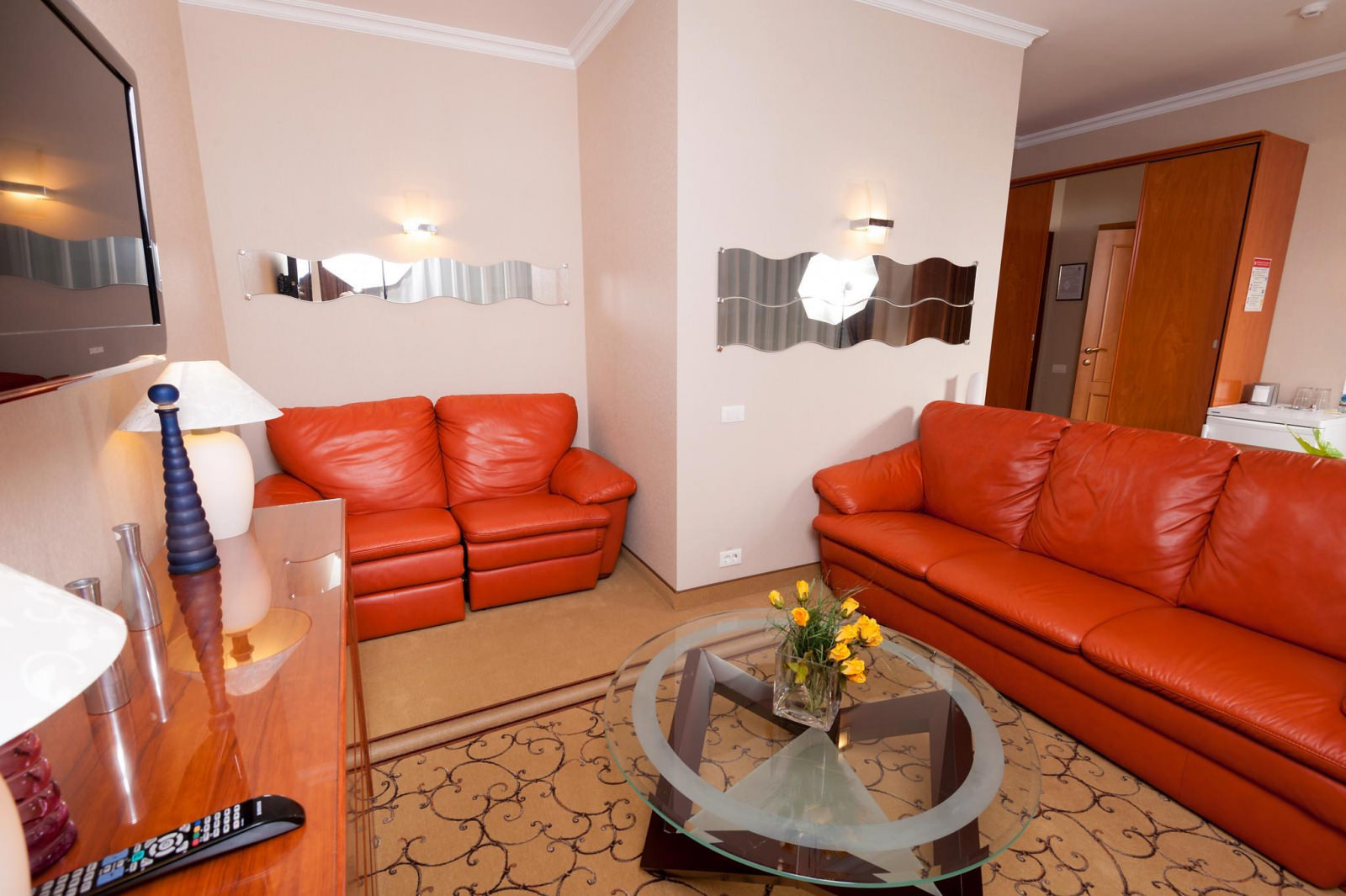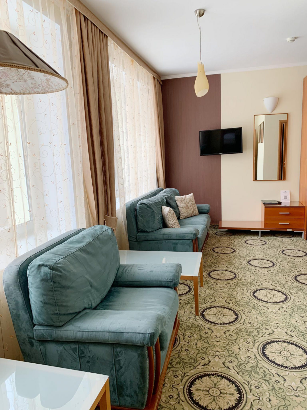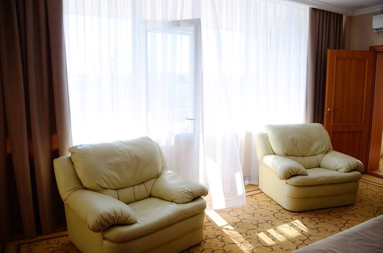 Номер ЛЮКС из 2-х комнат площадью 37 м² подойдет для молодых пар и семей с детьми. Интерьер спальной комнаты располагает к теплому супружескому отдыху, а на большом раскладном диване в гостиной уместится пара энергичных непосед. В большом платяном шкафу до самого потолка уместятся все вещи, а значит, в номере всегда будет порядок и уют.