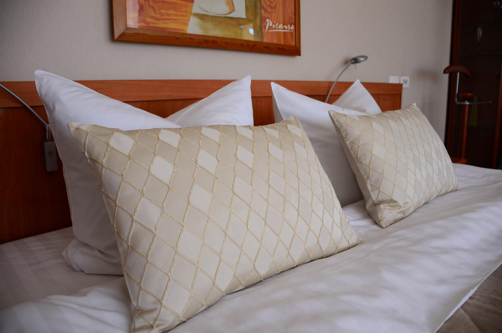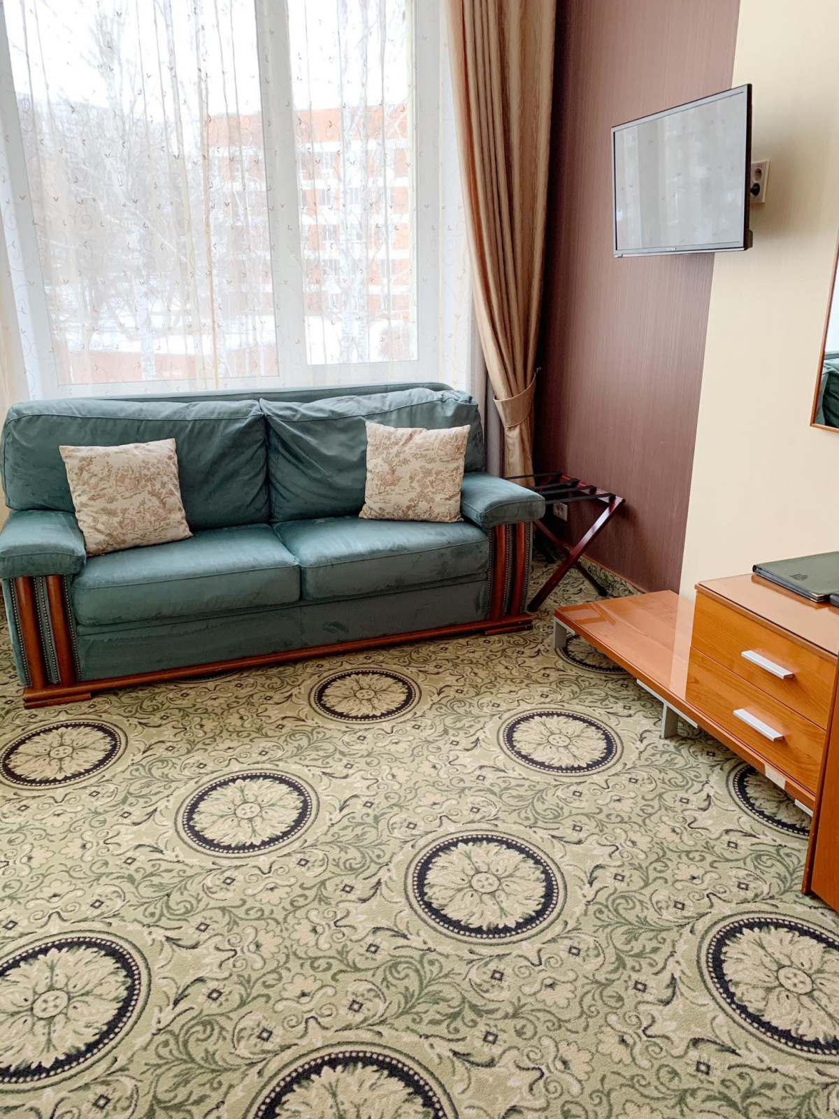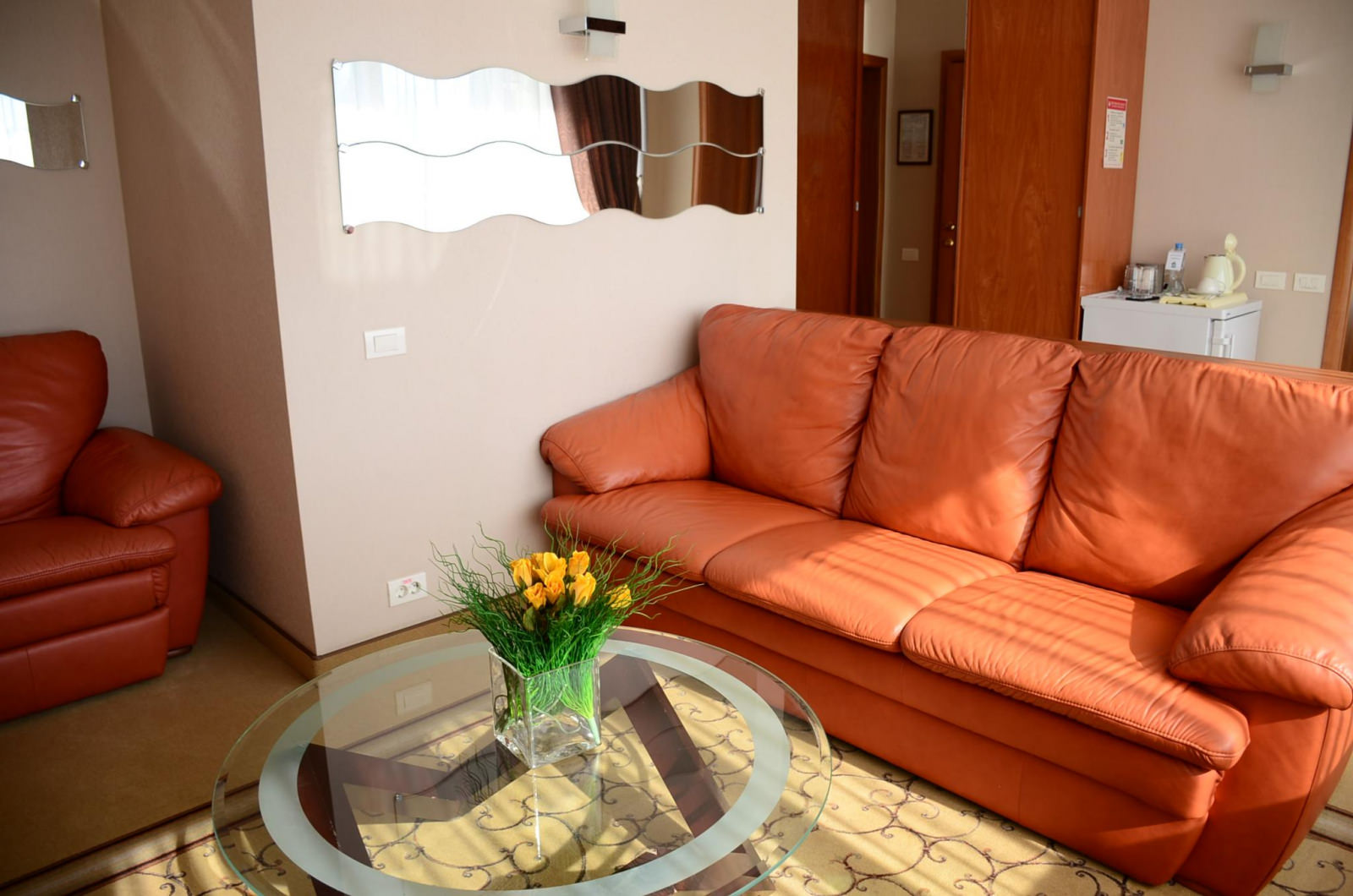 Номер ЛЮКС из 2-х комнат площадью 37 м² подойдет для молодых пар и семей с детьми. Интерьер спальной комнаты располагает к теплому супружескому отдыху, а на большом раскладном диване в гостиной уместится пара энергичных непосед. В большом платяном шкафу до самого потолка уместятся все вещи, а значит, в номере всегда будет порядок и уют.