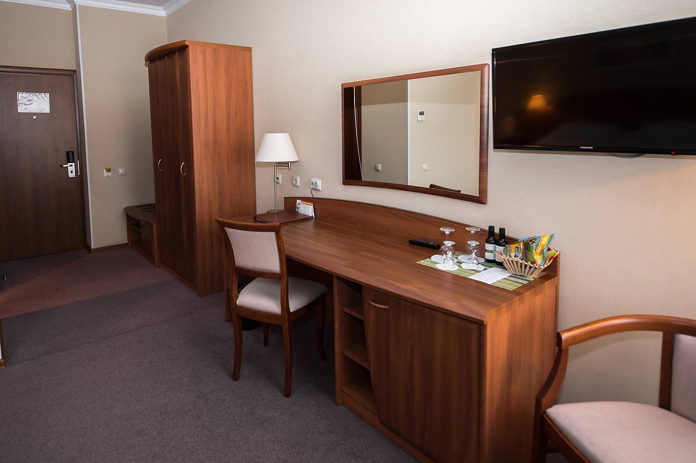 Площадь номера 27-29 кв.м., двуспальная кровать, прикроватные тумбочки, стул, стол рабочий, 2 полукресла, журнальный столик, платяной шкаф, багажная полка, телефон, кабельное ТВ, доступ к Интернет (LAN), минибар,сейф, фэн-койл, в ванной комнате душ, фен, туалетные принадлежности.