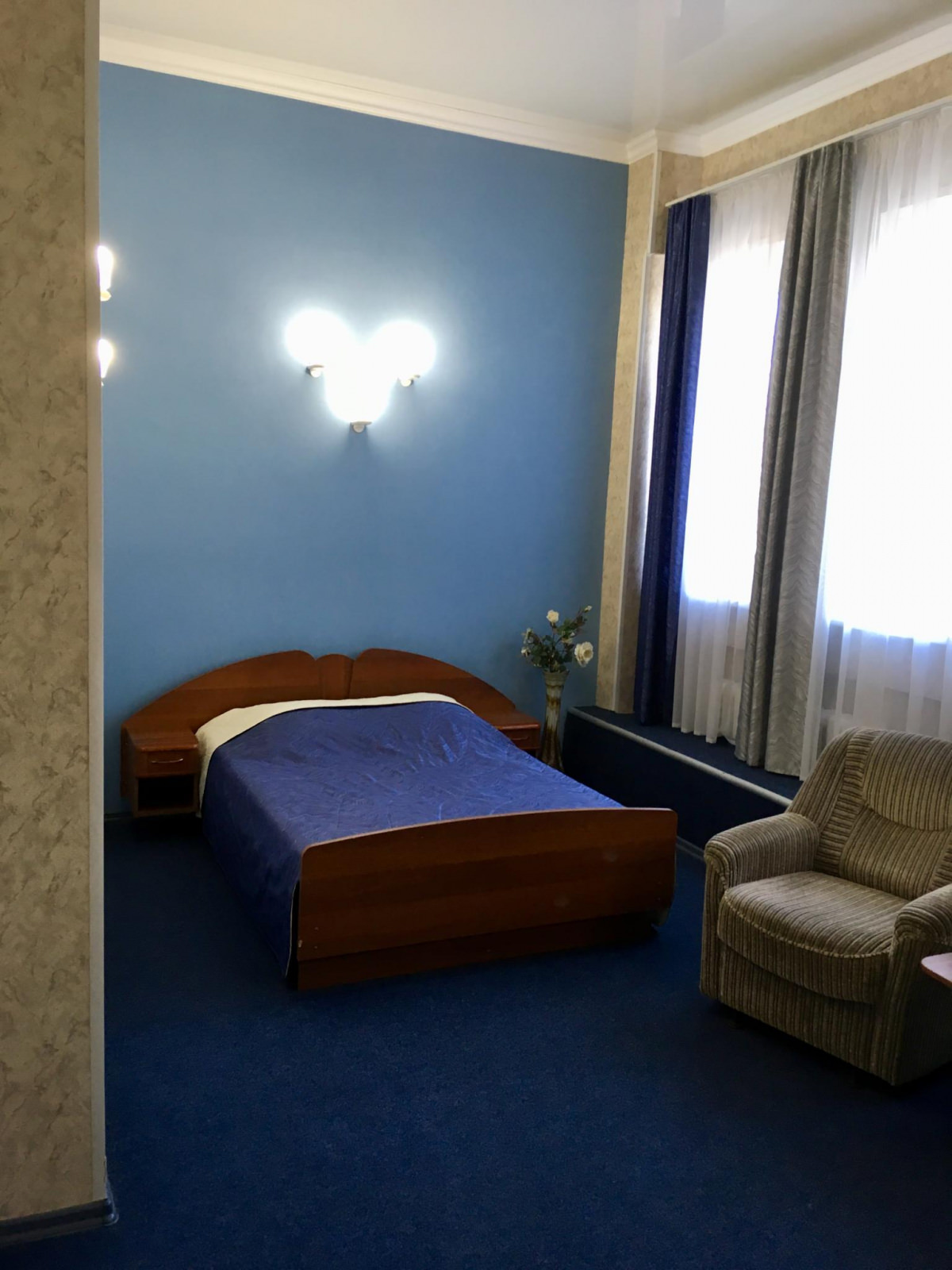 Площадь: 1 комната (20-25 кв.м.) В номере: одна двуспальная кровать, стул, шкаф, письменный стол, кондиционер, телевизор, кабельное телевидение, холодильник, телефон,набор полотенец, набор постельного белья, бесплатный Wi-Fi, бутилированная вода. В ванной: туалет, раковина, зеркало, тапочки, душ или ванная, средства личной гигиены.