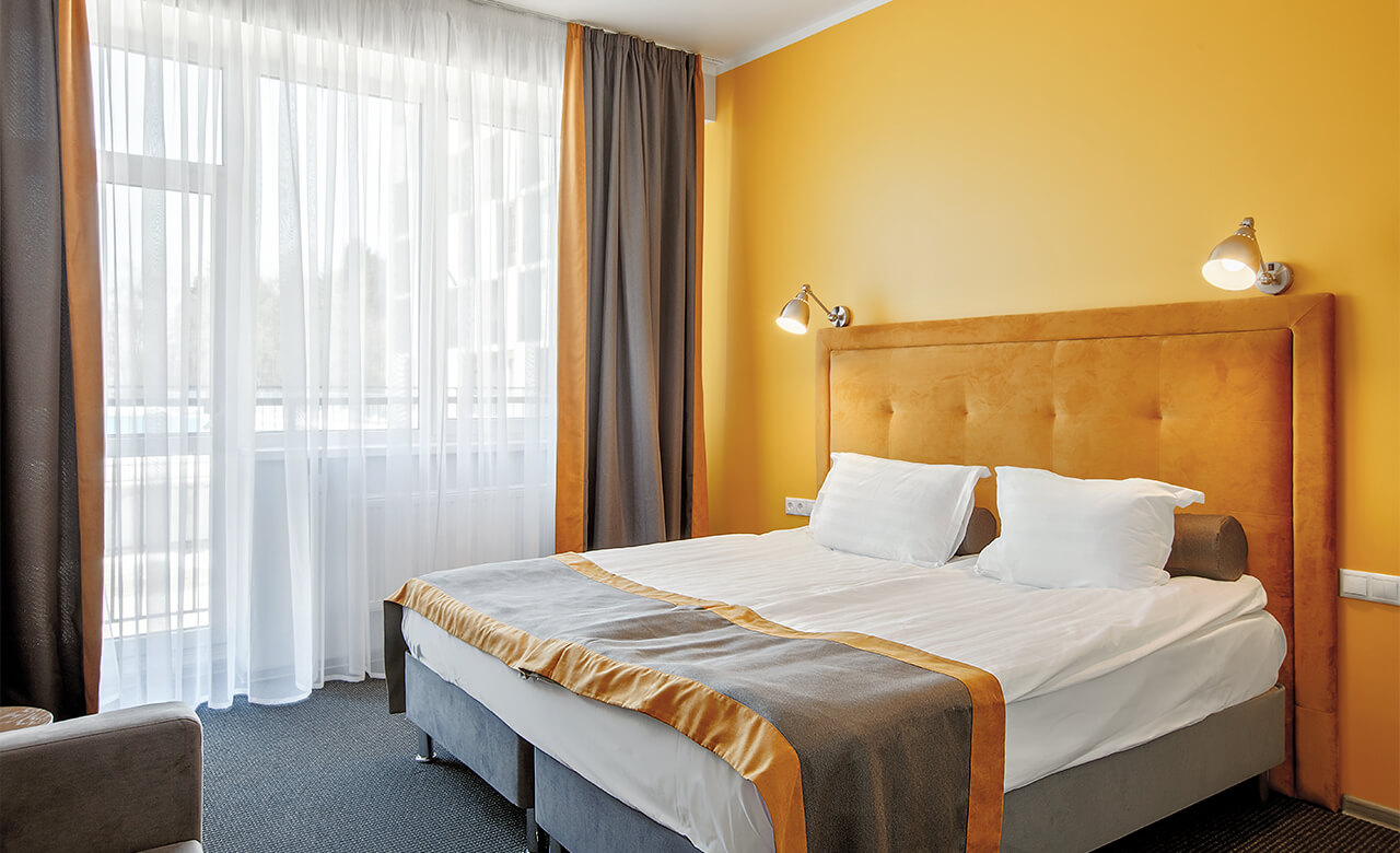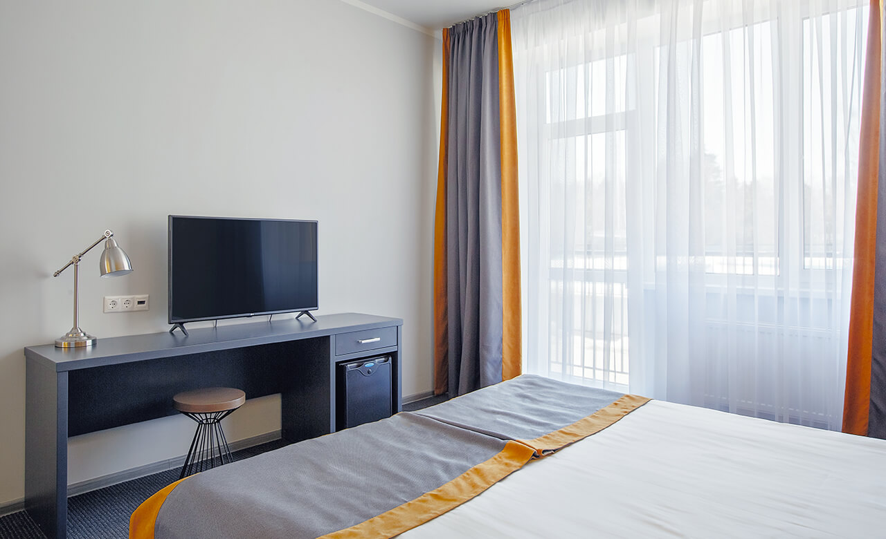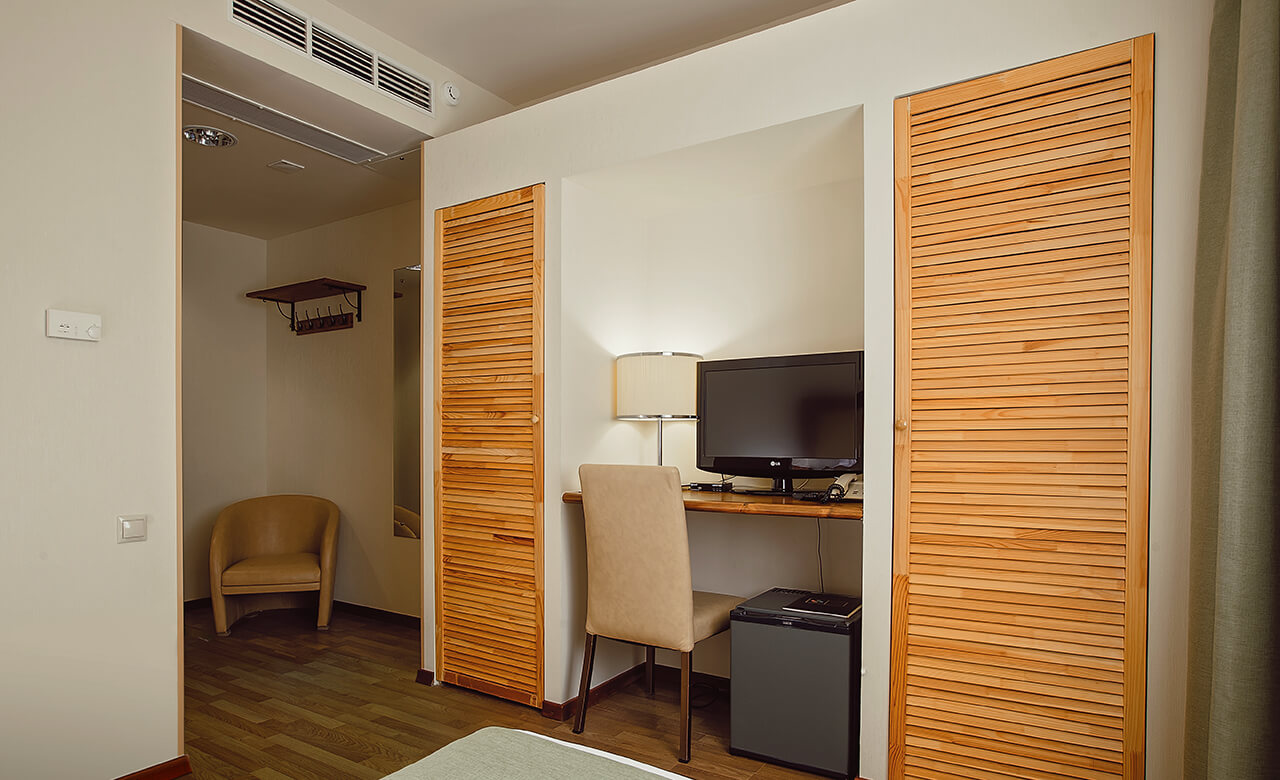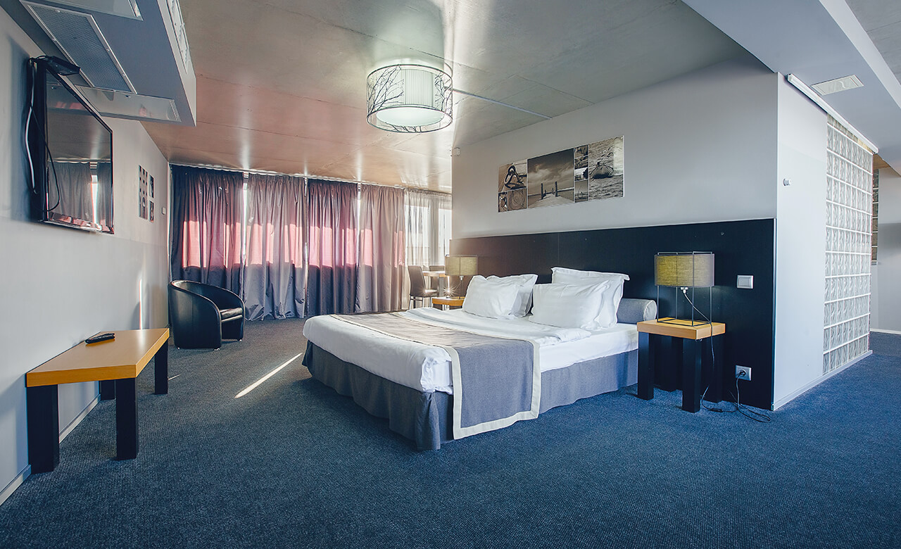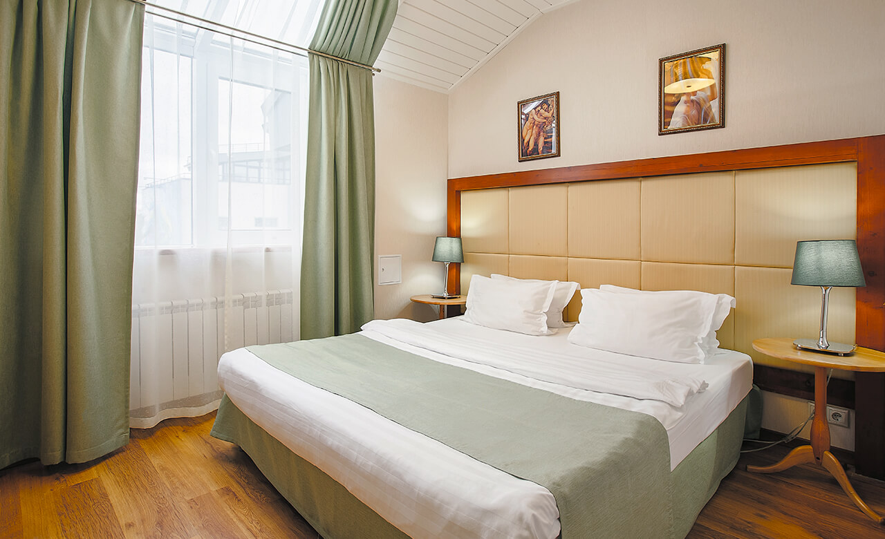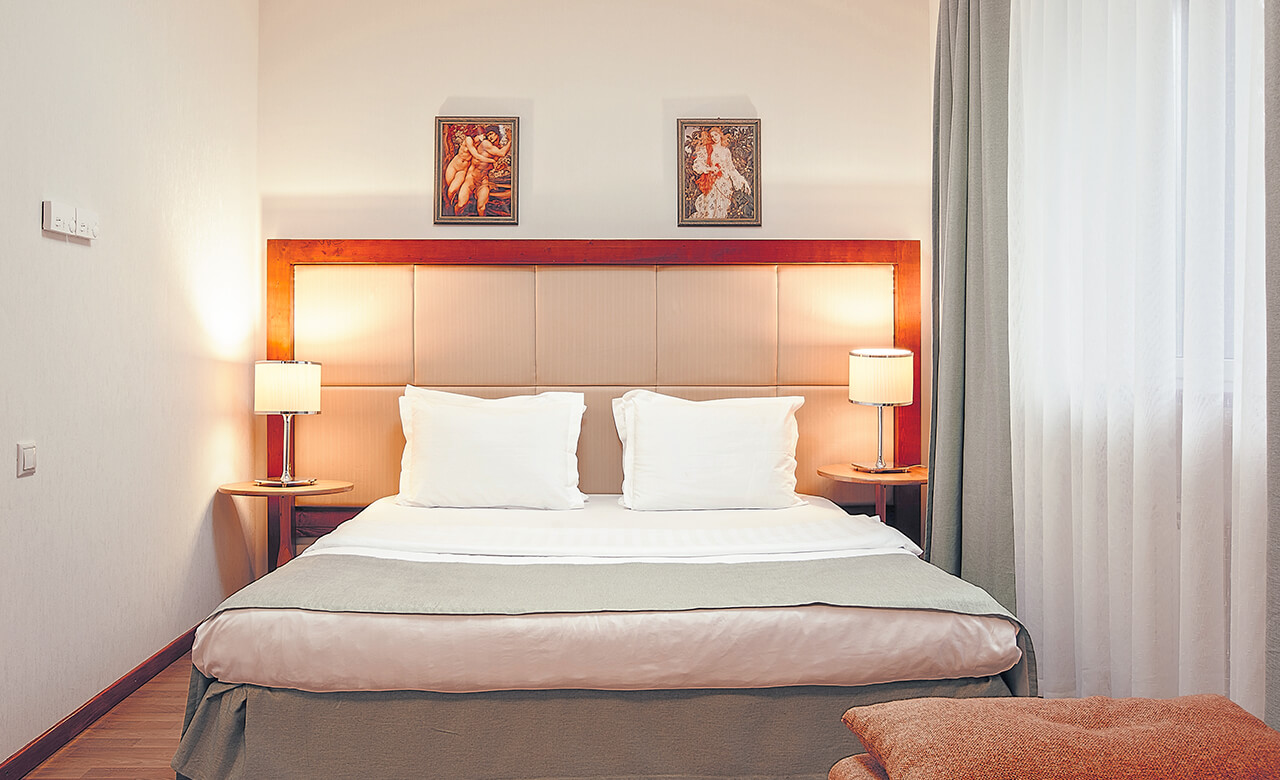 Номер укомплектован двуспальной кроватью с ортопедическим матрасом, свежим постельным бельем, удобными подушками и одеялами, сейфом, прикроватными тумбами, столом и стульями, зеркалом, телевизором, кондиционером и бесплатной сетью Wi-Fi. За отдельную плату предоставляются услуги мини-бара.