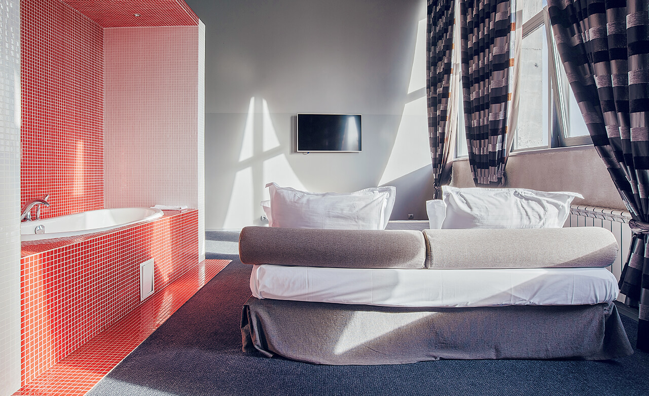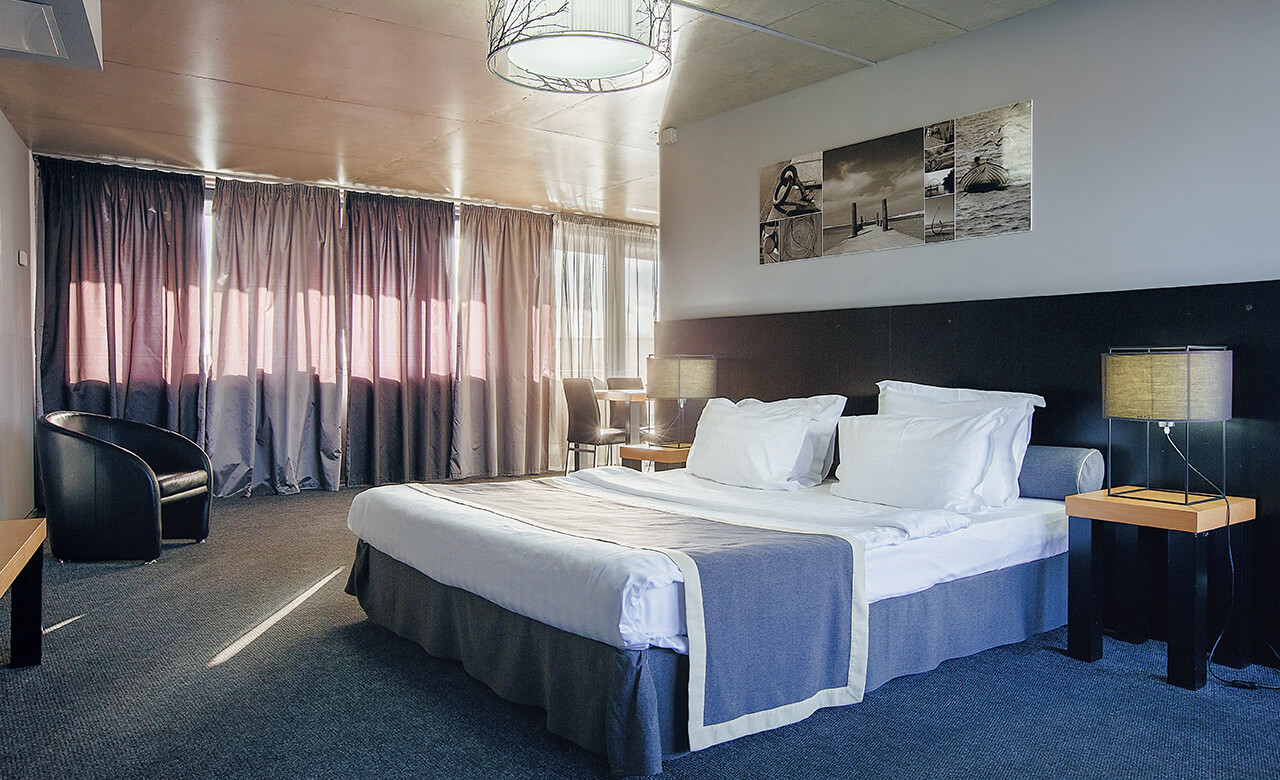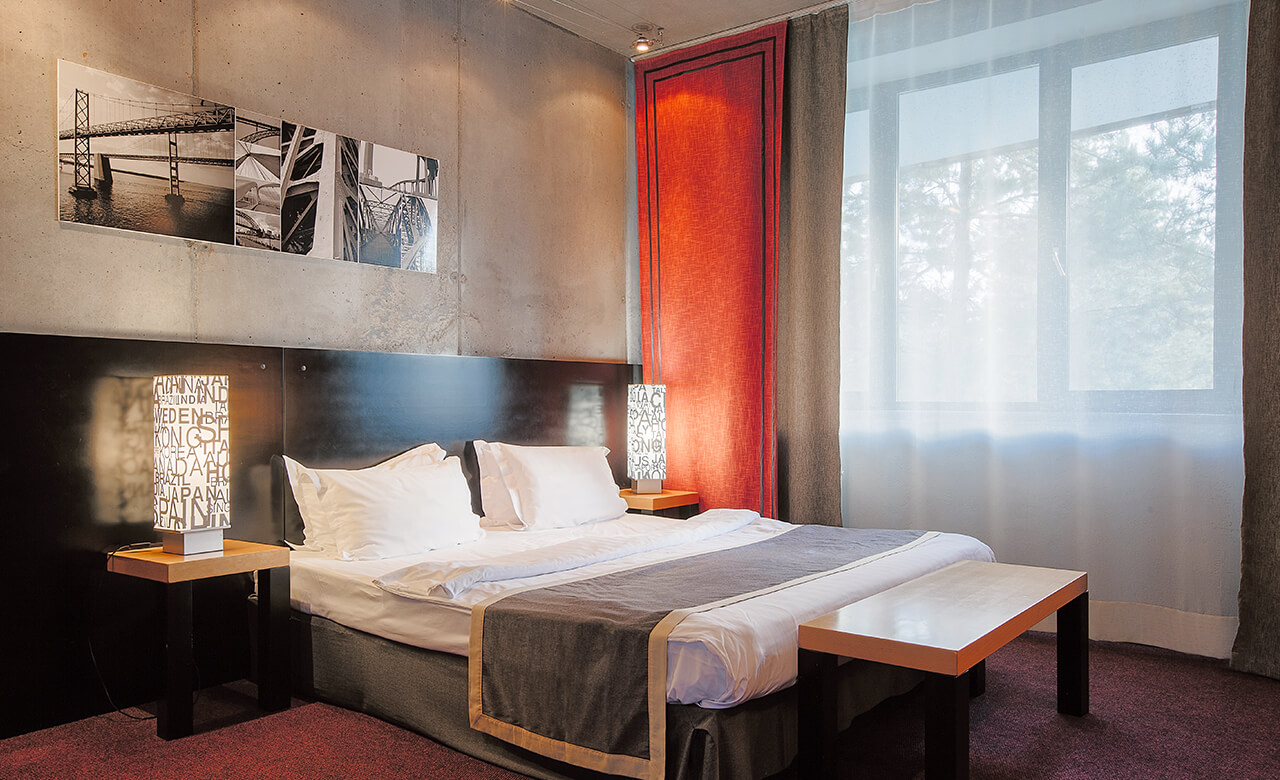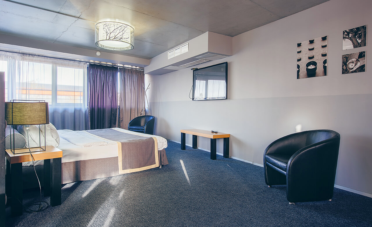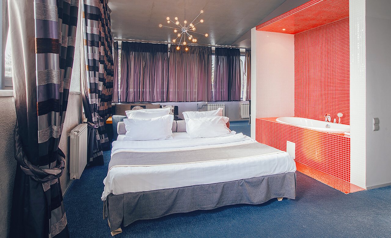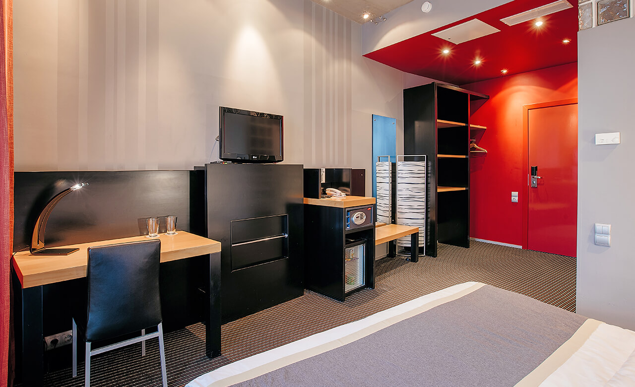 Номер укомплектован двуспальной кроватью с ортопедическим матрасом, свежим постельным бельем, удобными подушками и одеялами, сейфом, прикроватными тумбами, столом и стульями, зеркалом, телевизором, кондиционером и бесплатной сетью Wi-Fi. За отдельную плату предоставляются услуги мини-бара.
