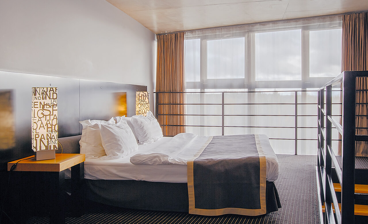 Такой номер в отеле всего один, он замечательно оформлен, оборудован отличной мебелью и бытовой техникой и является двухуровневым.