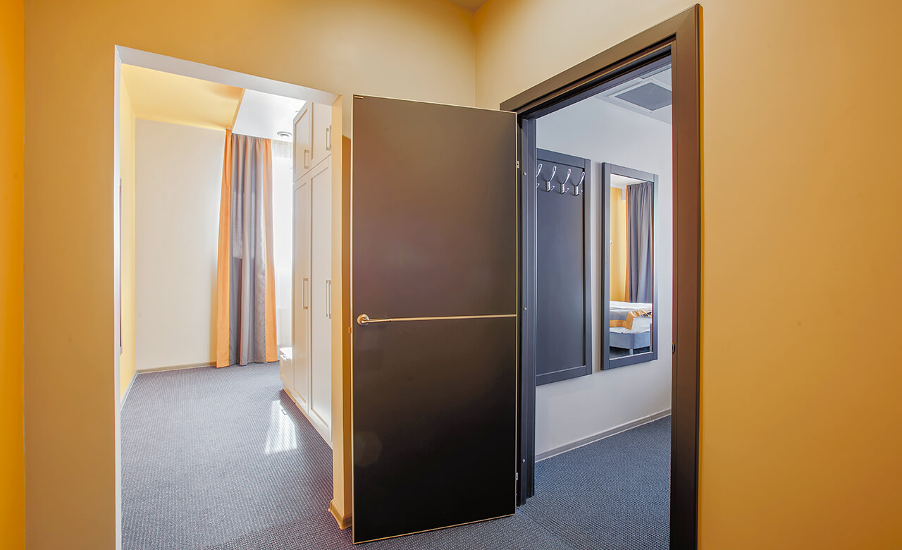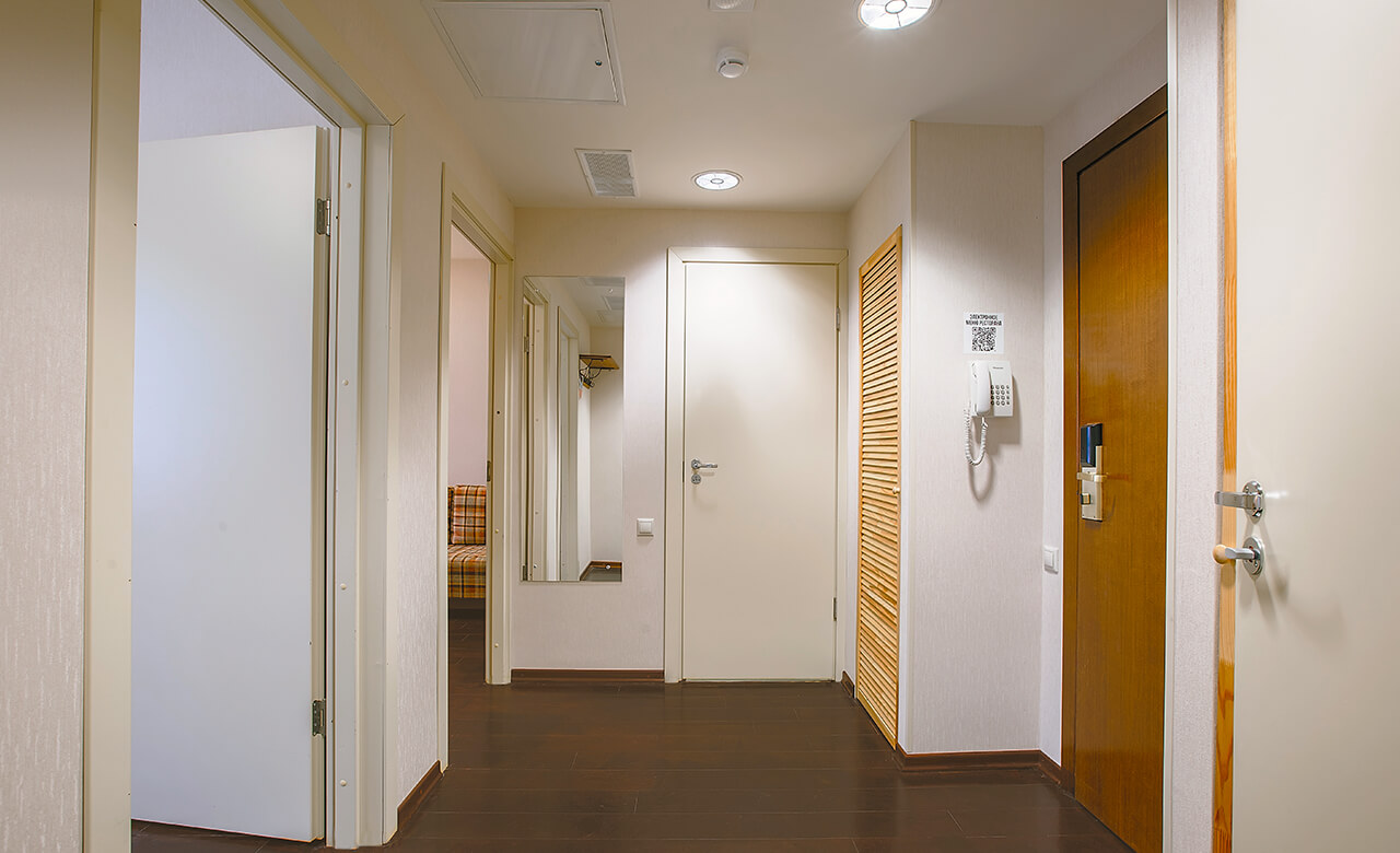 Две большие комнаты и широкий коридор – в этом номере сразу возникает ощущение комфорта и свободного пространства, «воздуха», которого часто так не хватает городским квартирам.