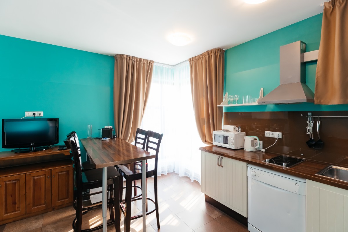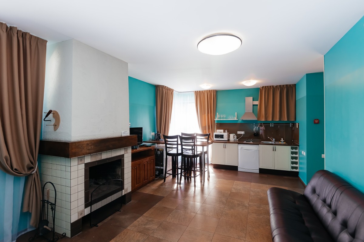 Просторный номер-студия, решенный в лучших традициях кантри-стиля загородных европейских домов, словно подталкивает к тому, чтобы устроить интересный и веселый вечер с друзьями или членами семьи. Здесь много света и воздуха, а «студийная» планировка добавляет номеру стильности и легкости.