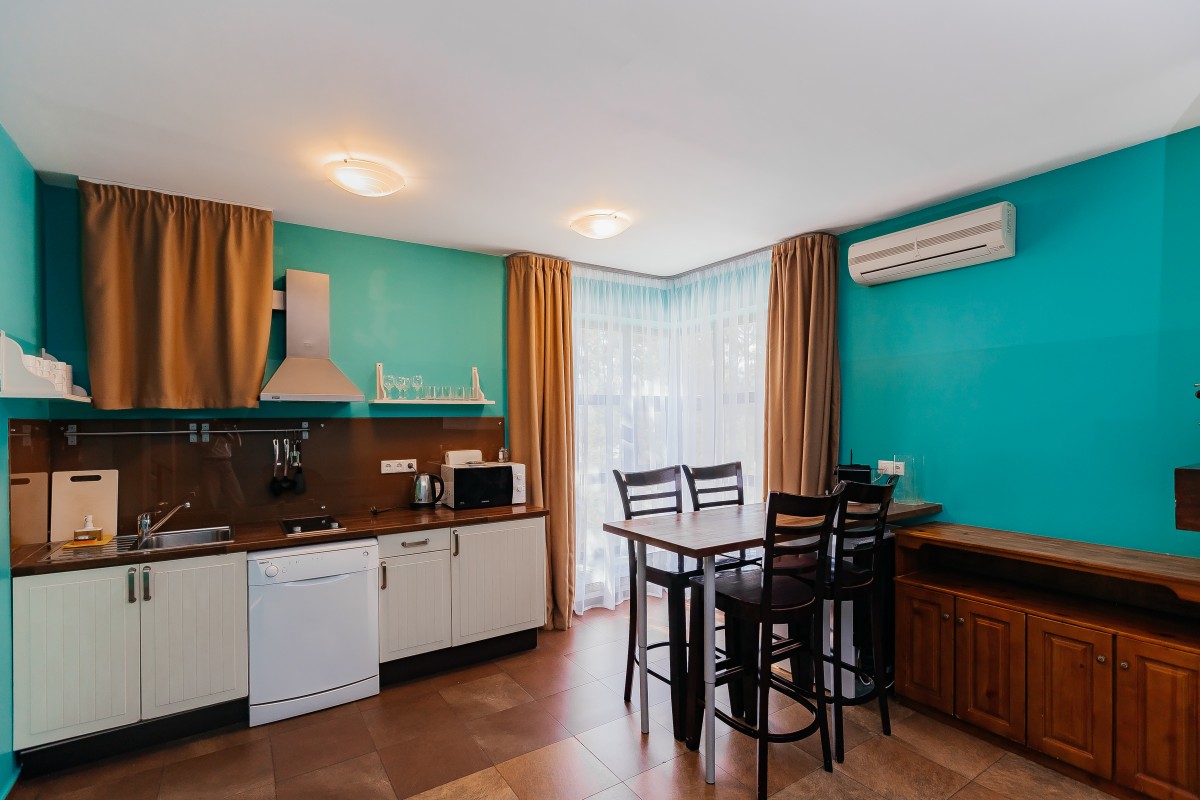 Отдыхающие могут расположиться на двуспальной кровати и диване. Из электроники в наличии кондиционер, фен, телевизор ЖК и телефон.