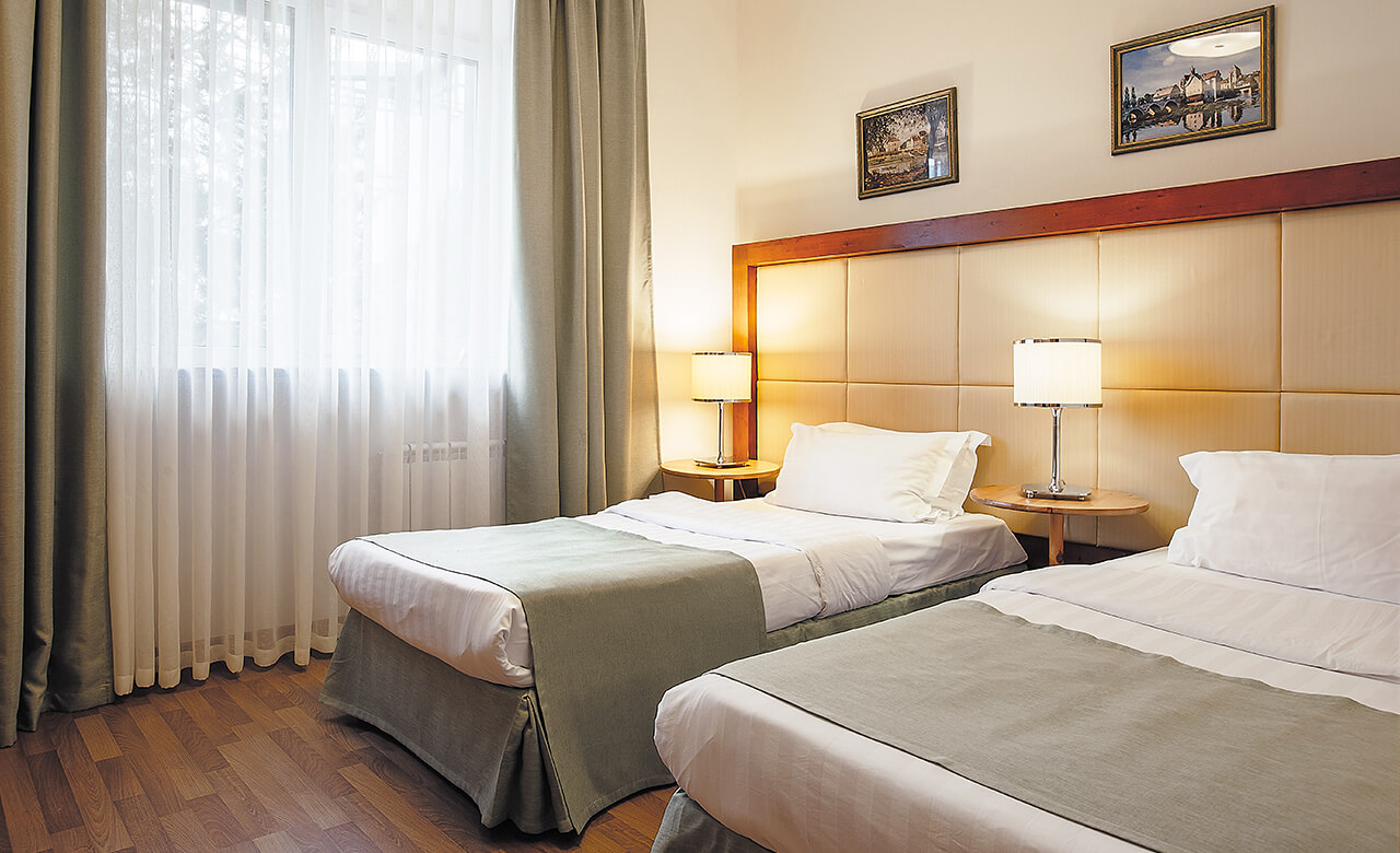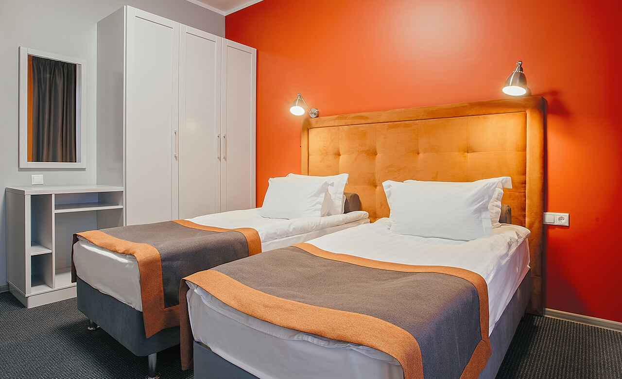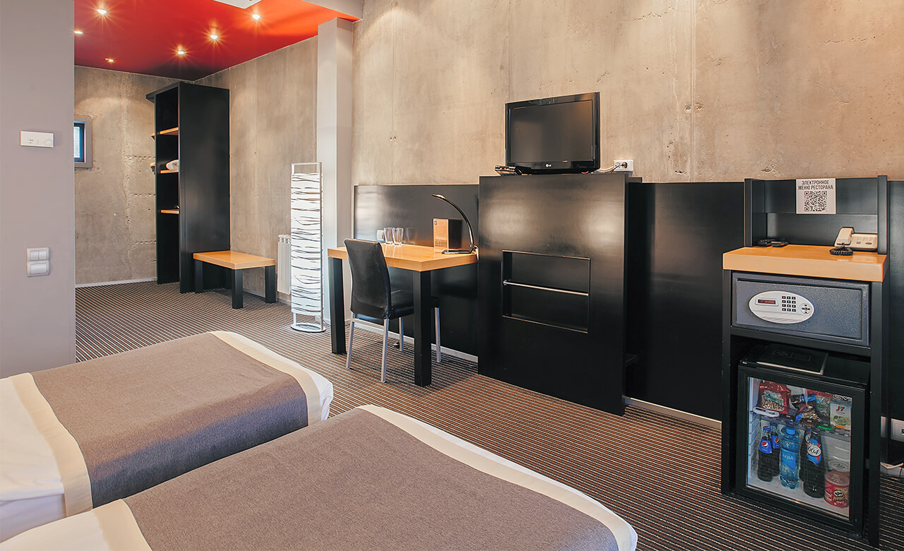 Спать постояльцы будут на раздельных кроватях. Удобство проживания обеспечит наличие телевизора, сейфа, мини-бара.