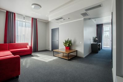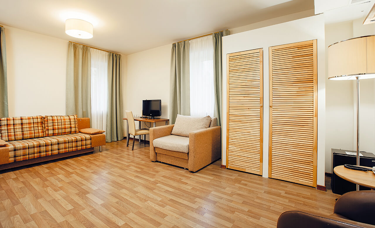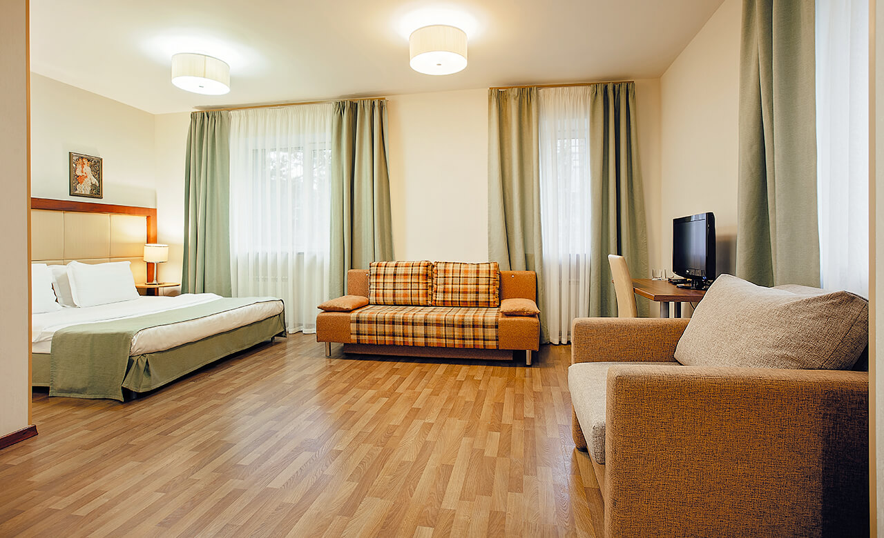 4 номера данного типа имеют гостиную и спальную комнаты, классический дизайн, оформлены в светлых тонах и оснащены удобной мебелью и бытовой техникой для комфортного отдыха гостей отеля.