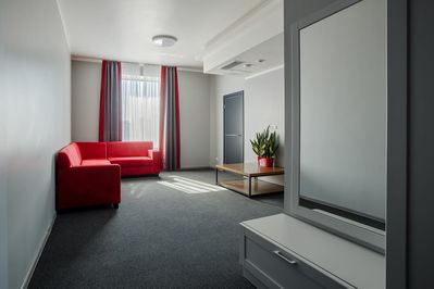 Площадь номера - 66 кв.м. 4 осн. места. 2 доп. места. Мебель: вешалка, зеркало, кровати односпальные /одна двуспальная кровать, прикроватные тумбочки, стол, стулья, шкаф. Оборудование: кондиционер, сейф, телевизор, телефон. Санузел: с душем или ванной, тапочки, туалетные принадлежности, фен, халат. Сервис: Wi-Fi бесплатно, room-сервис, мини-бар, смена полотенец, смена постельного белья, уборка номера, услуги внутренней телефонной связи.